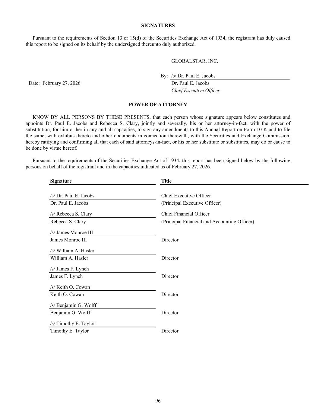 Headquarters Globalstar, Inc. 1351 Holiday Square Blvd. Covington, LA 70433 USA (985) 335-1500 Company Website www.globalstar.com Stockholder Information For further information about the Company, hard copies of this Report, SEC filings, and other published corporate information, please visit the Company’s website noted above. Additionally, copies will be furnished, without charge, to any stockholder of the Company entitled to vote at the Annual Meeting, upon written request to the investor relations department at email provided below. Transfer Agent Computershare Canton, MA Independent Auditors Ernst & Young, LLP New Orleans, LA Legal Counsel Jones Walker, LLP New Orleans, LA Investor Relations investorrelations@globalstar.com Board of Directors James Monroe III Executive Chairman of the Board Thermo Companies Dr. Paul E. Jacobs Director and Chief Executive Officer, Globalstar, Inc. James F. Lynch Director Thermo Companies William A. Hasler Director Benjamin G. Wolff Director Palladyne AI Keith O. Cowan Director Rivada Networks, Inc. Timothy E. Taylor Director and Vice President, Finance, Business Operations, & Strategy Globalstar, Inc. Thermo Companies Executive Officers Dr. Paul E. Jacobs Director and Chief Executive Officer, Globalstar, Inc. James Monroe III Executive Chairman of the Board Rebecca S. Clary Vice President, Chief Financial Officer L. Barbee Ponder IV General Counsel and Vice President, Regulatory Affairs Corporate Secretary Rebecca S. Clary Corporate Secretary Common Stock The Company’s common stock is traded on The Nasdaq Stock Market LLC under the symbol “GSAT.” As of March 23, 2026, the Company had 128,591,126 shares outstanding and 295 holders of record.
