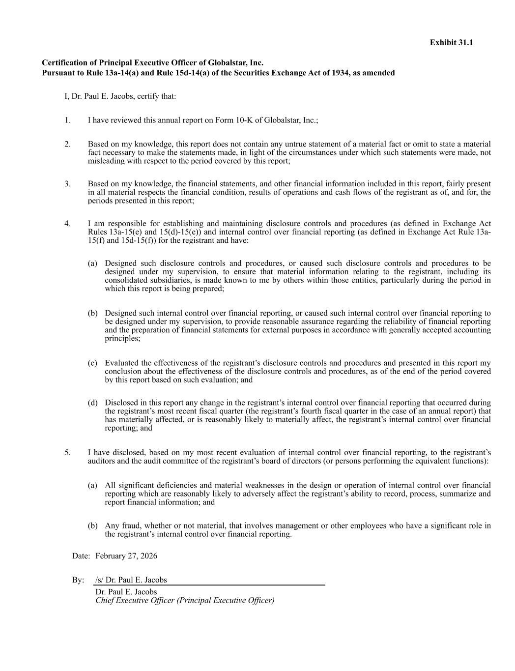 Exhibit 31.1 Certification of Principal Executive Officer of Globalstar, Inc. Pursuant to Rule 13a-14(a) and Rule 15d-14(a) of the Securities Exchange Act of 1934, as amended I, Dr. Paul E. Jacobs, certify that: 1. I have reviewed this annual report on Form 10-K of Globalstar, Inc.; 2. Based on my knowledge, this report does not contain any untrue statement of a material fact or omit to state a material fact necessary to make the statements made, in light of the circumstances under which such statements were made, not misleading with respect to the period covered by this report; 3. Based on my knowledge, the financial statements, and other financial information included in this report, fairly present in all material respects the financial condition, results of operations and cash flows of the registrant as of, and for, the periods presented in this report; 4. I am responsible for establishing and maintaining disclosure controls and procedures (as defined in Exchange Act Rules 13a-15(e) and 15(d)-15(e)) and internal control over financial reporting (as defined in Exchange Act Rule 13a- 15(f) and 15d-15(f)) for the registrant and have: (a) Designed such disclosure controls and procedures, or caused such disclosure controls and procedures to be designed under my supervision, to ensure that material information relating to the registrant, including its consolidated subsidiaries, is made known to me by others within those entities, particularly during the period in which this report is being prepared; (b) Designed such internal control over financial reporting, or caused such internal control over financial reporting to be designed under my supervision, to provide reasonable assurance regarding the reliability of financial reporting and the preparation of financial statements for external purposes in accordance with generally accepted accounting principles; (c) Evaluated the effectiveness of the registrant’s disclosure controls and procedures and presented in this report my conclusion about the effectiveness of the disclosure controls and procedures, as of the end of the period covered by this report based on such evaluation; and (d) Disclosed in this report any change in the registrant’s internal control over financial reporting that occurred during the registrant’s most recent fiscal quarter (the registrant’s fourth fiscal quarter in the case of an annual report) that has materially affected, or is reasonably likely to materially affect, the registrant’s internal control over financial reporting; and 5. I have disclosed, based on my most recent evaluation of internal control over financial reporting, to the registrant’s auditors and the audit committee of the registrant’s board of directors (or persons performing the equivalent functions): (a) All significant deficiencies and material weaknesses in the design or operation of internal control over financial reporting which are reasonably likely to adversely affect the registrant’s ability to record, process, summarize and report financial information; and (b) Any fraud, whether or not material, that involves management or other employees who have a significant role in the registrant’s internal control over financial reporting. Date: February 27, 2026 By: /s/ Dr. Paul E. Jacobs Dr. Paul E. Jacobs Chief Executive Officer (Principal Executive Officer)
