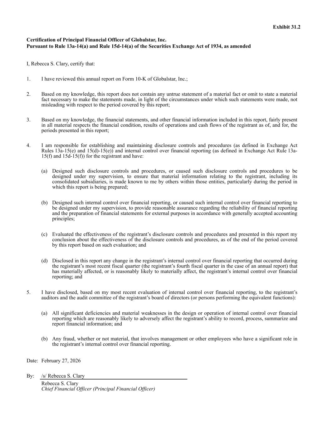 Exhibit 31.2 Certification of Principal Financial Officer of Globalstar, Inc. Pursuant to Rule 13a-14(a) and Rule 15d-14(a) of the Securities Exchange Act of 1934, as amended I, Rebecca S. Clary, certify that: 1. I have reviewed this annual report on Form 10-K of Globalstar, Inc.; 2. Based on my knowledge, this report does not contain any untrue statement of a material fact or omit to state a material fact necessary to make the statements made, in light of the circumstances under which such statements were made, not misleading with respect to the period covered by this report; 3. Based on my knowledge, the financial statements, and other financial information included in this report, fairly present in all material respects the financial condition, results of operations and cash flows of the registrant as of, and for, the periods presented in this report; 4. I am responsible for establishing and maintaining disclosure controls and procedures (as defined in Exchange Act Rules 13a-15(e) and 15(d)-15(e)) and internal control over financial reporting (as defined in Exchange Act Rule 13a- 15(f) and 15d-15(f)) for the registrant and have: (a) Designed such disclosure controls and procedures, or caused such disclosure controls and procedures to be designed under my supervision, to ensure that material information relating to the registrant, including its consolidated subsidiaries, is made known to me by others within those entities, particularly during the period in which this report is being prepared; (b) Designed such internal control over financial reporting, or caused such internal control over financial reporting to be designed under my supervision, to provide reasonable assurance regarding the reliability of financial reporting and the preparation of financial statements for external purposes in accordance with generally accepted accounting principles; (c) Evaluated the effectiveness of the registrant’s disclosure controls and procedures and presented in this report my conclusion about the effectiveness of the disclosure controls and procedures, as of the end of the period covered by this report based on such evaluation; and (d) Disclosed in this report any change in the registrant’s internal control over financial reporting that occurred during the registrant’s most recent fiscal quarter (the registrant’s fourth fiscal quarter in the case of an annual report) that has materially affected, or is reasonably likely to materially affect, the registrant’s internal control over financial reporting; and 5. I have disclosed, based on my most recent evaluation of internal control over financial reporting, to the registrant’s auditors and the audit committee of the registrant’s board of directors (or persons performing the equivalent functions): (a) All significant deficiencies and material weaknesses in the design or operation of internal control over financial reporting which are reasonably likely to adversely affect the registrant’s ability to record, process, summarize and report financial information; and (b) Any fraud, whether or not material, that involves management or other employees who have a significant role in the registrant’s internal control over financial reporting. Date: February 27, 2026 By: /s/ Rebecca S. Clary Rebecca S. Clary Chief Financial Officer (Principal Financial Officer)