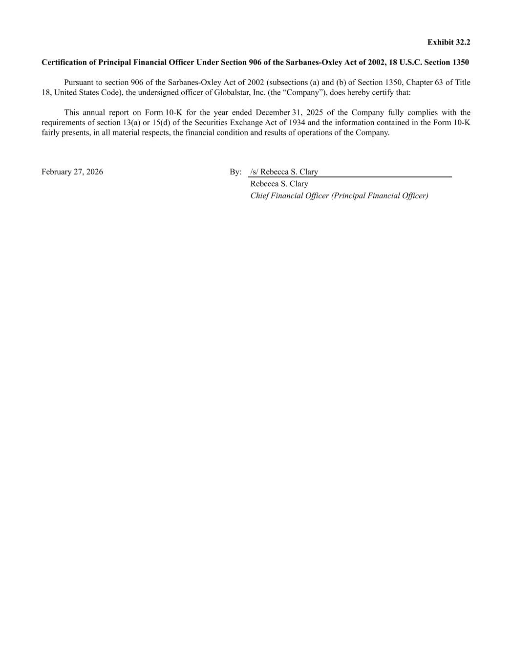 Exhibit 32.2 Certification of Principal Financial Officer Under Section 906 of the Sarbanes-Oxley Act of 2002, 18 U.S.C. Section 1350 Pursuant to section 906 of the Sarbanes-Oxley Act of 2002 (subsections (a) and (b) of Section 1350, Chapter 63 of Title 18, United States Code), the undersigned officer of Globalstar, Inc. (the “Company”), does hereby certify that: This annual report on Form 10-K for the year ended December 31, 2025 of the Company fully complies with the requirements of section 13(a) or 15(d) of the Securities Exchange Act of 1934 and the information contained in the Form 10-K fairly presents, in all material respects, the financial condition and results of operations of the Company. February 27, 2026 By: /s/ Rebecca S. Clary Rebecca S. Clary Chief Financial Officer (Principal Financial Officer)