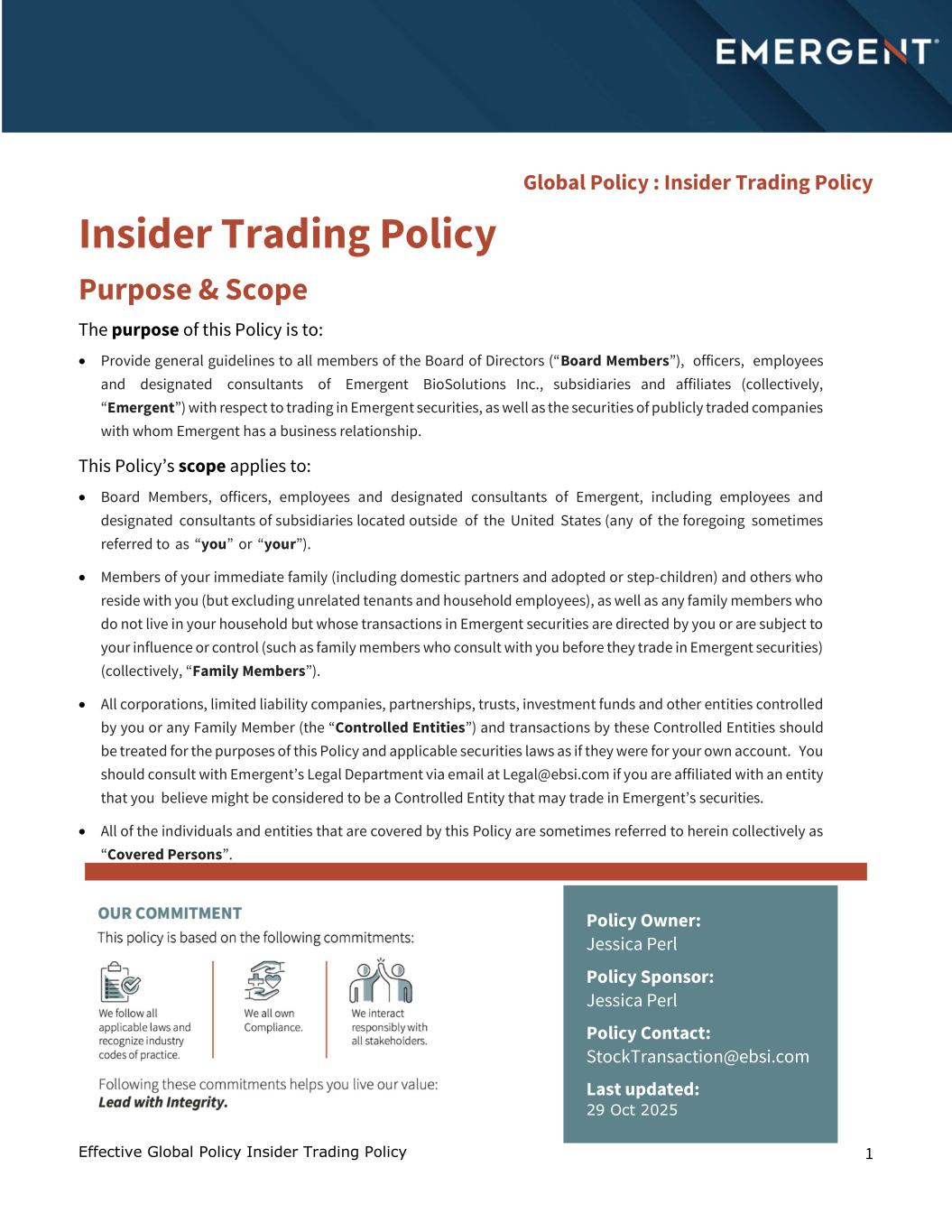 Effective Global Policy Insider Trading Policy 1 Global Policy : Insider Trading Policy Insider Trading Policy Purpose & Scope The purpose of this Policy is to: Provide general guidelines to all members of the Board of Directors (“Board Members”), officers, employees and designated consultants of Emergent BioSolutions Inc., subsidiaries and affiliates (collectively, “Emergent”) with respect to trading in Emergent securities, as well as the securities of publicly traded companies with whom Emergent has a business relationship. This Policy’s scope applies to: Board Members, officers, employees and designated consultants of Emergent, including employees and designated consultants of subsidiaries located outside of the United States (any of the foregoing sometimes referred to as “you” or “your”). Members of your immediate family (including domestic partners and adopted or step-children) and others who reside with you (but excluding unrelated tenants and household employees), as well as any family members who do not live in your household but whose transactions in Emergent securities are directed by you or are subject to your influence or control (such as family members who consult with you before they trade in Emergent securities) (collectively, “Family Members”). All corporations, limited liability companies, partnerships, trusts, investment funds and other entities controlled by you or any Family Member (the “Controlled Entities”) and transactions by these Controlled Entities should be treated for the purposes of this Policy and applicable securities laws as if they were for your own account. You should consult with Emergent’s Legal Department via email at Legal@ebsi.com if you are affiliated with an entity that you believe might be considered to be a Controlled Entity that may trade in Emergent’s securities. All of the individuals and entities that are covered by this Policy are sometimes referred to herein collectively as “Covered Persons”. Policy Owner: Jessica Perl Policy Sponsor: Jessica Perl Policy Contact: StockTransaction@ebsi.com Last updated: 29 Oct 2025