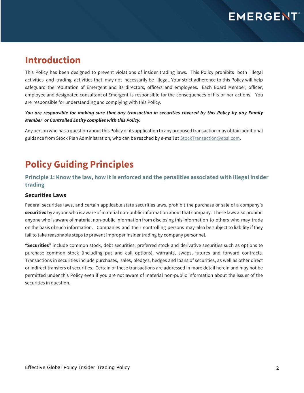 Effective Global Policy Insider Trading Policy 2 Introduction This Policy has been designed to prevent violations of insider trading laws. This Policy prohibits both illegal activities and trading activities that may not necessarily be illegal. Your strict adherence to this Policy will help safeguard the reputation of Emergent and its directors, officers and employees. Each Board Member, officer, employee and designated consultant of Emergent is responsible for the consequences of his or her actions. You are responsible for understanding and complying with this Policy. You are responsible for making sure that any transaction in securities covered by this Policy by any Family Member or Controlled Entity complies with this Policy. Any person who has a question about this Policy or its application to any proposed transaction may obtain additional guidance from Stock Plan Administration, who can be reached by e-mail at StockTransaction@ebsi.com. Policy Guiding Principles Principle 1: Know the law, how it is enforced and the penalities associated with illegal insider trading Securities Laws Federal securities laws, and certain applicable state securities laws, prohibit the purchase or sale of a company’s securities by anyone who is aware of material non-public information about that company. These laws also prohibit anyone who is aware of material non-public information from disclosing this information to others who may trade on the basis of such information. Companies and their controlling persons may also be subject to liability if they fail to take reasonable steps to prevent improper insider trading by company personnel. “Securities” include common stock, debt securities, preferred stock and derivative securities such as options to purchase common stock (including put and call options), warrants, swaps, futures and forward contracts. Transactions in securities include purchases, sales, pledges, hedges and loans of securities, as well as other direct or indirect transfers of securities. Certain of these transactions are addressed in more detail herein and may not be permitted under this Policy even if you are not aware of material non-public information about the issuer of the securities in question.