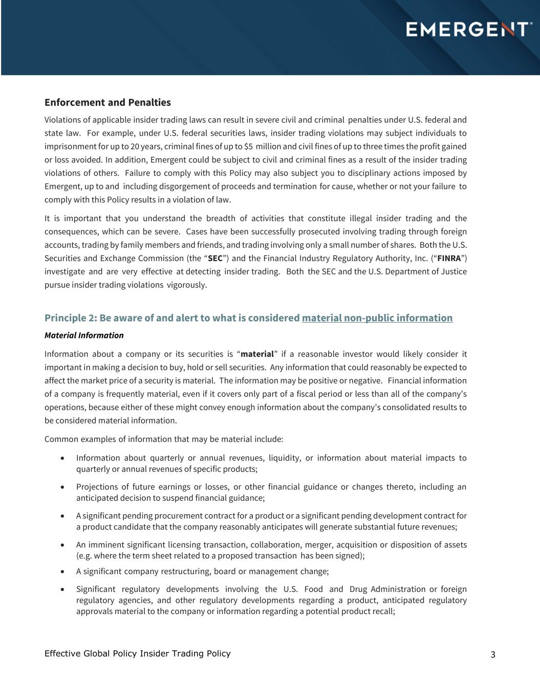 Effective Global Policy Insider Trading Policy 3 Enforcement and Penalties Violations of applicable insider trading laws can result in severe civil and criminal penalties under U.S. federal and state law. For example, under U.S. federal securities laws, insider trading violations may subject individuals to imprisonment for up to 20 years, criminal fines of up to $5 million and civil fines of up to three times the profit gained or loss avoided. In addition, Emergent could be subject to civil and criminal fines as a result of the insider trading violations of others. Failure to comply with this Policy may also subject you to disciplinary actions imposed by Emergent, up to and including disgorgement of proceeds and termination for cause, whether or not your failure to comply with this Policy results in a violation of law. It is important that you understand the breadth of activities that constitute illegal insider trading and the consequences, which can be severe. Cases have been successfully prosecuted involving trading through foreign accounts, trading by family members and friends, and trading involving only a small number of shares. Both the U.S. Securities and Exchange Commission (the “SEC”) and the Financial Industry Regulatory Authority, Inc. (“FINRA”) investigate and are very effective at detecting insider trading. Both the SEC and the U.S. Department of Justice pursue insider trading violations vigorously. Principle 2: Be aware of and alert to what is considered material non-public information Material Information Information about a company or its securities is “material” if a reasonable investor would likely consider it important in making a decision to buy, hold or sell securities. Any information that could reasonably be expected to affect the market price of a security is material. The information may be positive or negative. Financial information of a company is frequently material, even if it covers only part of a fiscal period or less than all of the company’s operations, because either of these might convey enough information about the company’s consolidated results to be considered material information. Common examples of information that may be material include: Information about quarterly or annual revenues, liquidity, or information about material impacts to quarterly or annual revenues of specific products; Projections of future earnings or losses, or other financial guidance or changes thereto, including an anticipated decision to suspend financial guidance; A significant pending procurement contract for a product or a significant pending development contract for a product candidate that the company reasonably anticipates will generate substantial future revenues; An imminent significant licensing transaction, collaboration, merger, acquisition or disposition of assets (e.g. where the term sheet related to a proposed transaction has been signed); A significant company restructuring, board or management change; Significant regulatory developments involving the U.S. Food and Drug Administration or foreign regulatory agencies, and other regulatory developments regarding a product, anticipated regulatory approvals material to the company or information regarding a potential product recall;