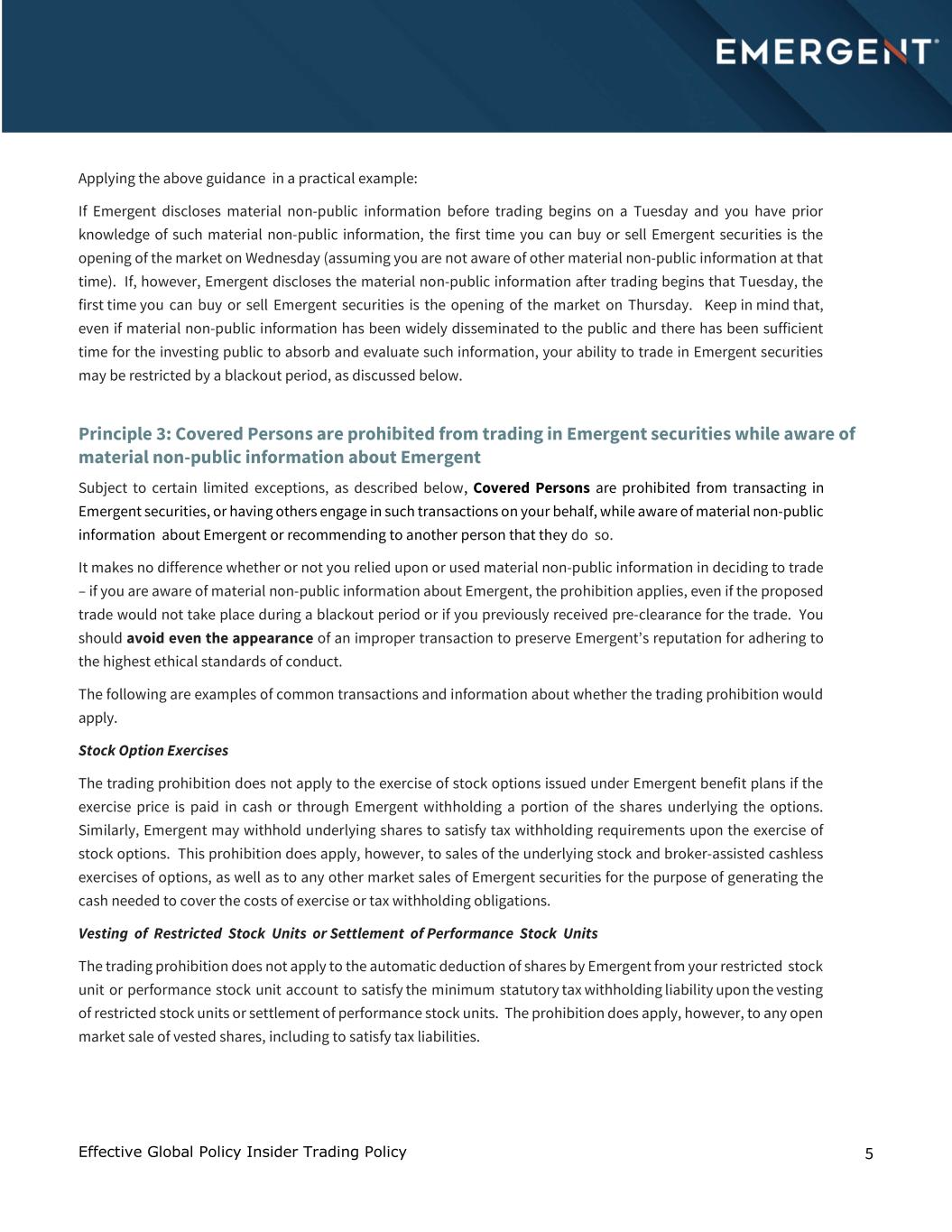 Effective Global Policy Insider Trading Policy 5 Applying the above guidance in a practical example: If Emergent discloses material non-public information before trading begins on a Tuesday and you have prior knowledge of such material non-public information, the first time you can buy or sell Emergent securities is the opening of the market on Wednesday (assuming you are not aware of other material non-public information at that time). If, however, Emergent discloses the material non-public information after trading begins that Tuesday, the first time you can buy or sell Emergent securities is the opening of the market on Thursday. Keep in mind that, even if material non-public information has been widely disseminated to the public and there has been sufficient time for the investing public to absorb and evaluate such information, your ability to trade in Emergent securities may be restricted by a blackout period, as discussed below. Principle 3: Covered Persons are prohibited from trading in Emergent securities while aware of material non-public information about Emergent Subject to certain limited exceptions, as described below, Covered Persons are prohibited from transacting in Emergent securities, or having others engage in such transactions on your behalf, while aware of material non-public information about Emergent or recommending to another person that they do so. It makes no difference whether or not you relied upon or used material non-public information in deciding to trade – if you are aware of material non-public information about Emergent, the prohibition applies, even if the proposed trade would not take place during a blackout period or if you previously received pre-clearance for the trade. You should avoid even the appearance of an improper transaction to preserve Emergent’s reputation for adhering to the highest ethical standards of conduct. The following are examples of common transactions and information about whether the trading prohibition would apply. Stock Option Exercises The trading prohibition does not apply to the exercise of stock options issued under Emergent benefit plans if the exercise price is paid in cash or through Emergent withholding a portion of the shares underlying the options. Similarly, Emergent may withhold underlying shares to satisfy tax withholding requirements upon the exercise of stock options. This prohibition does apply, however, to sales of the underlying stock and broker-assisted cashless exercises of options, as well as to any other market sales of Emergent securities for the purpose of generating the cash needed to cover the costs of exercise or tax withholding obligations. Vesting of Restricted Stock Units or Settlement of Performance Stock Units The trading prohibition does not apply to the automatic deduction of shares by Emergent from your restricted stock unit or performance stock unit account to satisfy the minimum statutory tax withholding liability upon the vesting of restricted stock units or settlement of performance stock units. The prohibition does apply, however, to any open market sale of vested shares, including to satisfy tax liabilities.