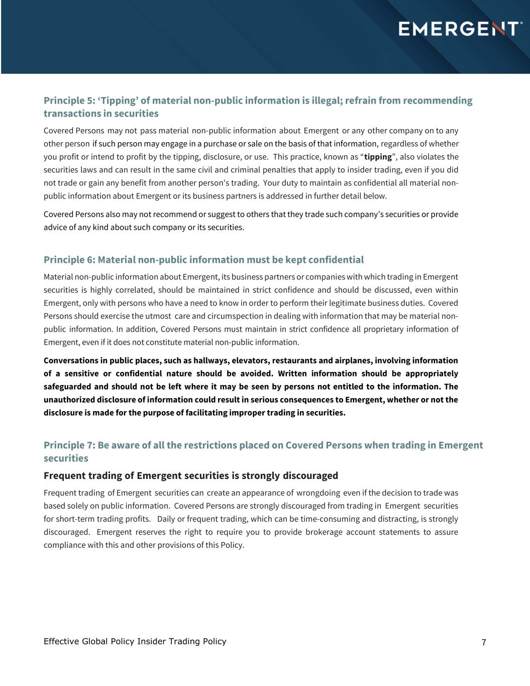 Effective Global Policy Insider Trading Policy 7 Principle 5: ‘Tipping’ of material non-public information is illegal; refrain from recommending transactions in securities Covered Persons may not pass material non-public information about Emergent or any other company on to any other person if such person may engage in a purchase or sale on the basis of that information, regardless of whether you profit or intend to profit by the tipping, disclosure, or use. This practice, known as “tipping”, also violates the securities laws and can result in the same civil and criminal penalties that apply to insider trading, even if you did not trade or gain any benefit from another person's trading. Your duty to maintain as confidential all material non- public information about Emergent or its business partners is addressed in further detail below. Covered Persons also may not recommend or suggest to others that they trade such company’s securities or provide advice of any kind about such company or its securities. Principle 6: Material non-public information must be kept confidential Material non-public information about Emergent, its business partners or companies with which trading in Emergent securities is highly correlated, should be maintained in strict confidence and should be discussed, even within Emergent, only with persons who have a need to know in order to perform their legitimate business duties. Covered Persons should exercise the utmost care and circumspection in dealing with information that may be material non- public information. In addition, Covered Persons must maintain in strict confidence all proprietary information of Emergent, even if it does not constitute material non-public information. Conversations in public places, such as hallways, elevators, restaurants and airplanes, involving information of a sensitive or confidential nature should be avoided. Written information should be appropriately safeguarded and should not be left where it may be seen by persons not entitled to the information. The unauthorized disclosure of information could result in serious consequences to Emergent, whether or not the disclosure is made for the purpose of facilitating improper trading in securities. Principle 7: Be aware of all the restrictions placed on Covered Persons when trading in Emergent securities Frequent trading of Emergent securities is strongly discouraged Frequent trading of Emergent securities can create an appearance of wrongdoing even if the decision to trade was based solely on public information. Covered Persons are strongly discouraged from trading in Emergent securities for short-term trading profits. Daily or frequent trading, which can be time-consuming and distracting, is strongly discouraged. Emergent reserves the right to require you to provide brokerage account statements to assure compliance with this and other provisions of this Policy.