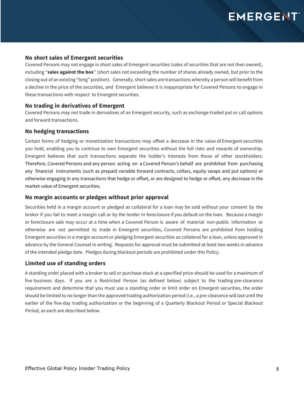 Effective Global Policy Insider Trading Policy 8 No short sales of Emergent securities Covered Persons may not engage in short sales of Emergent securities (sales of securities that are not then owned), including “sales against the box” (short sales not exceeding the number of shares already owned, but prior to the closing out of an existing “long” position). Generally, short sales are transactions whereby a person will benefit from a decline in the price of the securities, and Emergent believes it is inappropriate for Covered Persons to engage in these transactions with respect to Emergent securities. No trading in derivatives of Emergent Covered Persons may not trade in derivatives of an Emergent security, such as exchange-traded put or call options and forward transactions. No hedging transactions Certain forms of hedging or monetization transactions may offset a decrease in the value of Emergent securities you hold, enabling you to continue to own Emergent securities without the full risks and rewards of ownership. Emergent believes that such transactions separate the holder's interests from those of other stockholders. Therefore, Covered Persons and any person acting on a Covered Person’s behalf are prohibited from purchasing any financial instruments (such as prepaid variable forward contracts, collars, equity swaps and put options) or otherwise engaging in any transactions that hedge or offset, or are designed to hedge or offset, any decrease in the market value of Emergent securities. No margin accounts or pledges without prior approval Securities held in a margin account or pledged as collateral for a loan may be sold without your consent by the broker if you fail to meet a margin call or by the lender in foreclosure if you default on the loan. Because a margin or foreclosure sale may occur at a time when a Covered Person is aware of material non-public information or otherwise are not permitted to trade in Emergent securities, Covered Persons are prohibited from holding Emergent securities in a margin account or pledging Emergent securities as collateral for a loan, unless approved in advance by the General Counsel in writing. Requests for approval must be submitted at least two weeks in advance of the intended pledge date. Pledges during blackout periods are prohibited under this Policy. Limited use of standing orders A standing order placed with a broker to sell or purchase stock at a specified price should be used for a maximum of five business days. If you are a Restricted Person (as defined below) subject to the trading pre-clearance requirement and determine that you must use a standing order or limit order on Emergent securities, the order should be limited to no longer than the approved trading authorization period (i.e., a pre-clearance will last until the earlier of the five-day trading authorization or the beginning of a Quarterly Blackout Period or Special Blackout Period, as each are described below.