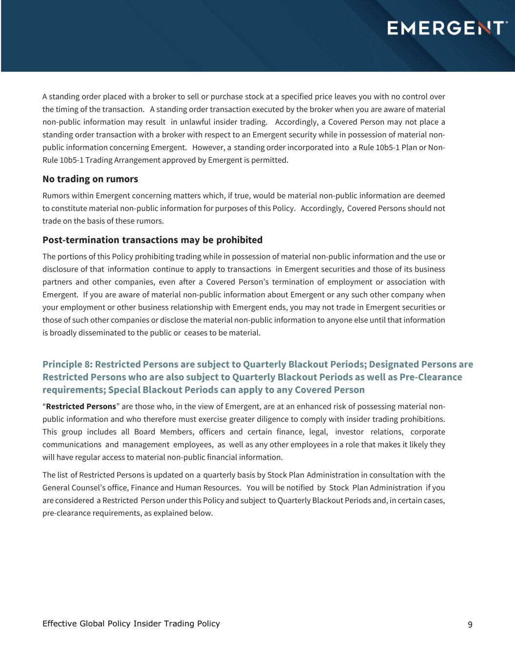 Effective Global Policy Insider Trading Policy 9 A standing order placed with a broker to sell or purchase stock at a specified price leaves you with no control over the timing of the transaction. A standing order transaction executed by the broker when you are aware of material non-public information may result in unlawful insider trading. Accordingly, a Covered Person may not place a standing order transaction with a broker with respect to an Emergent security while in possession of material non- public information concerning Emergent. However, a standing order incorporated into a Rule 10b5-1 Plan or Non- Rule 10b5-1 Trading Arrangement approved by Emergent is permitted. No trading on rumors Rumors within Emergent concerning matters which, if true, would be material non-public information are deemed to constitute material non-public information for purposes of this Policy. Accordingly, Covered Persons should not trade on the basis of these rumors. Post-termination transactions may be prohibited The portions of this Policy prohibiting trading while in possession of material non-public information and the use or disclosure of that information continue to apply to transactions in Emergent securities and those of its business partners and other companies, even after a Covered Person’s termination of employment or association with Emergent. If you are aware of material non-public information about Emergent or any such other company when your employment or other business relationship with Emergent ends, you may not trade in Emergent securities or those of such other companies or disclose the material non-public information to anyone else until that information is broadly disseminated to the public or ceases to be material. Principle 8: Restricted Persons are subject to Quarterly Blackout Periods; Designated Persons are Restricted Persons who are also subject to Quarterly Blackout Periods as well as Pre-Clearance requirements; Special Blackout Periods can apply to any Covered Person “Restricted Persons” are those who, in the view of Emergent, are at an enhanced risk of possessing material non- public information and who therefore must exercise greater diligence to comply with insider trading prohibitions. This group includes all Board Members, officers and certain finance, legal, investor relations, corporate communications and management employees, as well as any other employees in a role that makes it likely they will have regular access to material non-public financial information. The list of Restricted Persons is updated on a quarterly basis by Stock Plan Administration in consultation with the General Counsel’s office, Finance and Human Resources. You will be notified by Stock Plan Administration if you are considered a Restricted Person under this Policy and subject to Quarterly Blackout Periods and, in certain cases, pre-clearance requirements, as explained below.