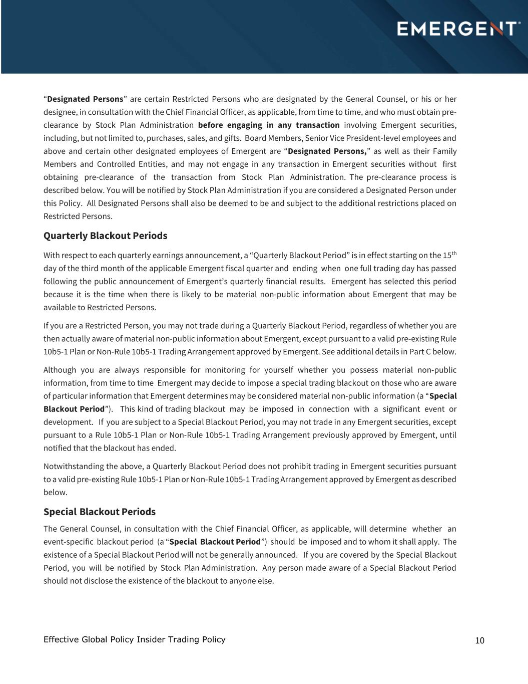 Effective Global Policy Insider Trading Policy 10 “Designated Persons” are certain Restricted Persons who are designated by the General Counsel, or his or her designee, in consultation with the Chief Financial Officer, as applicable, from time to time, and who must obtain pre- clearance by Stock Plan Administration before engaging in any transaction involving Emergent securities, including, but not limited to, purchases, sales, and gifts. Board Members, Senior Vice President-level employees and above and certain other designated employees of Emergent are “Designated Persons,” as well as their Family Members and Controlled Entities, and may not engage in any transaction in Emergent securities without first obtaining pre-clearance of the transaction from Stock Plan Administration. The pre-clearance process is described below. You will be notified by Stock Plan Administration if you are considered a Designated Person under this Policy. All Designated Persons shall also be deemed to be and subject to the additional restrictions placed on Restricted Persons. Quarterly Blackout Periods With respect to each quarterly earnings announcement, a “Quarterly Blackout Period” is in effect starting on the 15th day of the third month of the applicable Emergent fiscal quarter and ending when one full trading day has passed following the public announcement of Emergent’s quarterly financial results. Emergent has selected this period because it is the time when there is likely to be material non-public information about Emergent that may be available to Restricted Persons. If you are a Restricted Person, you may not trade during a Quarterly Blackout Period, regardless of whether you are then actually aware of material non-public information about Emergent, except pursuant to a valid pre-existing Rule 10b5-1 Plan or Non-Rule 10b5-1 Trading Arrangement approved by Emergent. See additional details in Part C below. Although you are always responsible for monitoring for yourself whether you possess material non-public information, from time to time Emergent may decide to impose a special trading blackout on those who are aware of particular information that Emergent determines may be considered material non-public information (a “Special Blackout Period”). This kind of trading blackout may be imposed in connection with a significant event or development. If you are subject to a Special Blackout Period, you may not trade in any Emergent securities, except pursuant to a Rule 10b5-1 Plan or Non-Rule 10b5-1 Trading Arrangement previously approved by Emergent, until notified that the blackout has ended. Notwithstanding the above, a Quarterly Blackout Period does not prohibit trading in Emergent securities pursuant to a valid pre-existing Rule 10b5-1 Plan or Non-Rule 10b5-1 Trading Arrangement approved by Emergent as described below. Special Blackout Periods The General Counsel, in consultation with the Chief Financial Officer, as applicable, will determine whether an event-specific blackout period (a “Special Blackout Period”) should be imposed and to whom it shall apply. The existence of a Special Blackout Period will not be generally announced. If you are covered by the Special Blackout Period, you will be notified by Stock Plan Administration. Any person made aware of a Special Blackout Period should not disclose the existence of the blackout to anyone else.