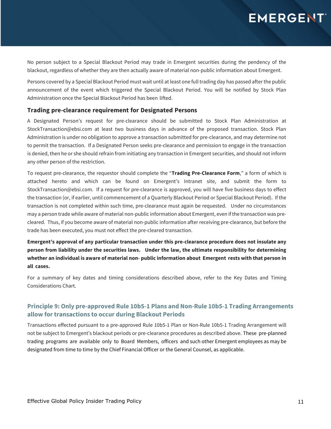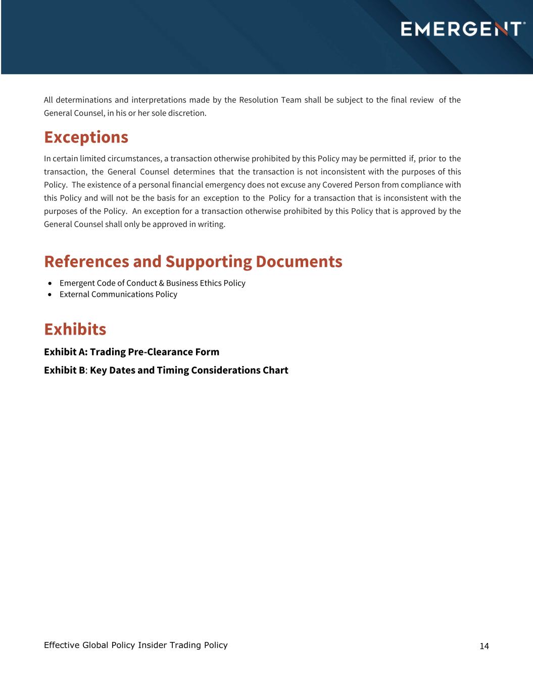 Effective Global Policy Insider Trading Policy 14 All determinations and interpretations made by the Resolution Team shall be subject to the final review of the General Counsel, in his or her sole discretion. Exceptions In certain limited circumstances, a transaction otherwise prohibited by this Policy may be permitted if, prior to the transaction, the General Counsel determines that the transaction is not inconsistent with the purposes of this Policy. The existence of a personal financial emergency does not excuse any Covered Person from compliance with this Policy and will not be the basis for an exception to the Policy for a transaction that is inconsistent with the purposes of the Policy. An exception for a transaction otherwise prohibited by this Policy that is approved by the General Counsel shall only be approved in writing. References and Supporting Documents Emergent Code of Conduct & Business Ethics Policy External Communications Policy Exhibits Exhibit A: Trading Pre-Clearance Form Exhibit B: Key Dates and Timing Considerations Chart