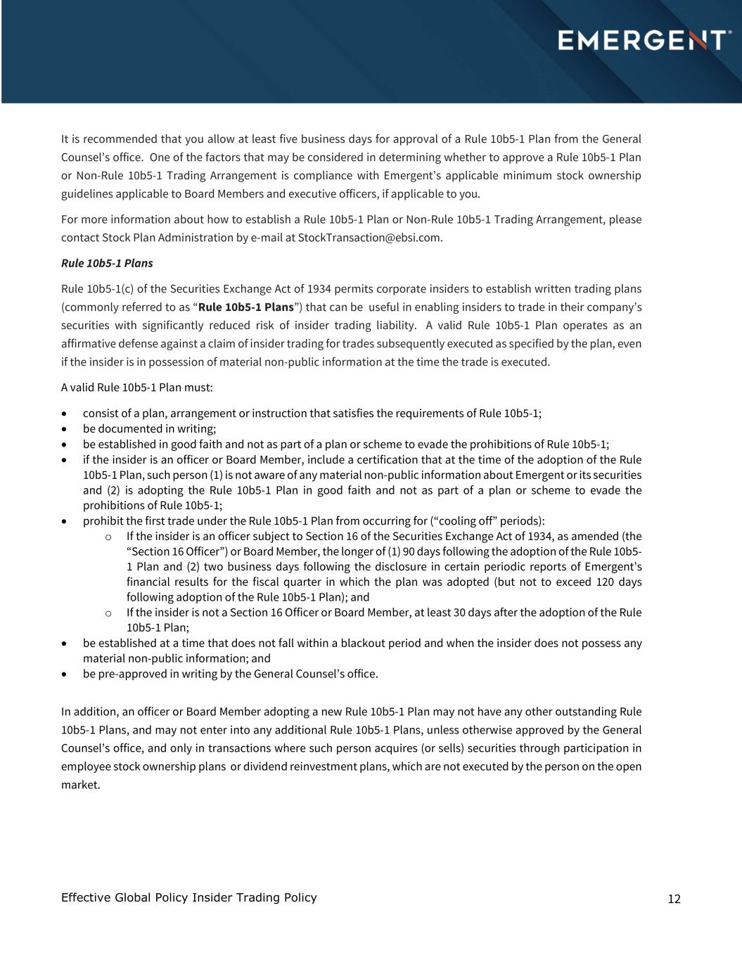 Effective Global Policy Insider Trading Policy 12 It is recommended that you allow at least five business days for approval of a Rule 10b5-1 Plan from the General Counsel’s office. One of the factors that may be considered in determining whether to approve a Rule 10b5-1 Plan or Non-Rule 10b5-1 Trading Arrangement is compliance with Emergent’s applicable minimum stock ownership guidelines applicable to Board Members and executive officers, if applicable to you. For more information about how to establish a Rule 10b5-1 Plan or Non-Rule 10b5-1 Trading Arrangement, please contact Stock Plan Administration by e-mail at StockTransaction@ebsi.com. Rule 10b5-1 Plans Rule 10b5-1(c) of the Securities Exchange Act of 1934 permits corporate insiders to establish written trading plans (commonly referred to as “Rule 10b5-1 Plans”) that can be useful in enabling insiders to trade in their company’s securities with significantly reduced risk of insider trading liability. A valid Rule 10b5-1 Plan operates as an affirmative defense against a claim of insider trading for trades subsequently executed as specified by the plan, even if the insider is in possession of material non-public information at the time the trade is executed. A valid Rule 10b5-1 Plan must: consist of a plan, arrangement or instruction that satisfies the requirements of Rule 10b5-1; be documented in writing; be established in good faith and not as part of a plan or scheme to evade the prohibitions of Rule 10b5-1; if the insider is an officer or Board Member, include a certification that at the time of the adoption of the Rule 10b5-1 Plan, such person (1) is not aware of any material non-public information about Emergent or its securities and (2) is adopting the Rule 10b5-1 Plan in good faith and not as part of a plan or scheme to evade the prohibitions of Rule 10b5-1; prohibit the first trade under the Rule 10b5-1 Plan from occurring for (“cooling off” periods): o If the insider is an officer subject to Section 16 of the Securities Exchange Act of 1934, as amended (the “Section 16 Officer”) or Board Member, the longer of (1) 90 days following the adoption of the Rule 10b5- 1 Plan and (2) two business days following the disclosure in certain periodic reports of Emergent’s financial results for the fiscal quarter in which the plan was adopted (but not to exceed 120 days following adoption of the Rule 10b5-1 Plan); and o If the insider is not a Section 16 Officer or Board Member, at least 30 days after the adoption of the Rule 10b5-1 Plan; be established at a time that does not fall within a blackout period and when the insider does not possess any material non-public information; and be pre-approved in writing by the General Counsel’s office. In addition, an officer or Board Member adopting a new Rule 10b5-1 Plan may not have any other outstanding Rule 10b5-1 Plans, and may not enter into any additional Rule 10b5-1 Plans, unless otherwise approved by the General Counsel’s office, and only in transactions where such person acquires (or sells) securities through participation in employee stock ownership plans or dividend reinvestment plans, which are not executed by the person on the open market.