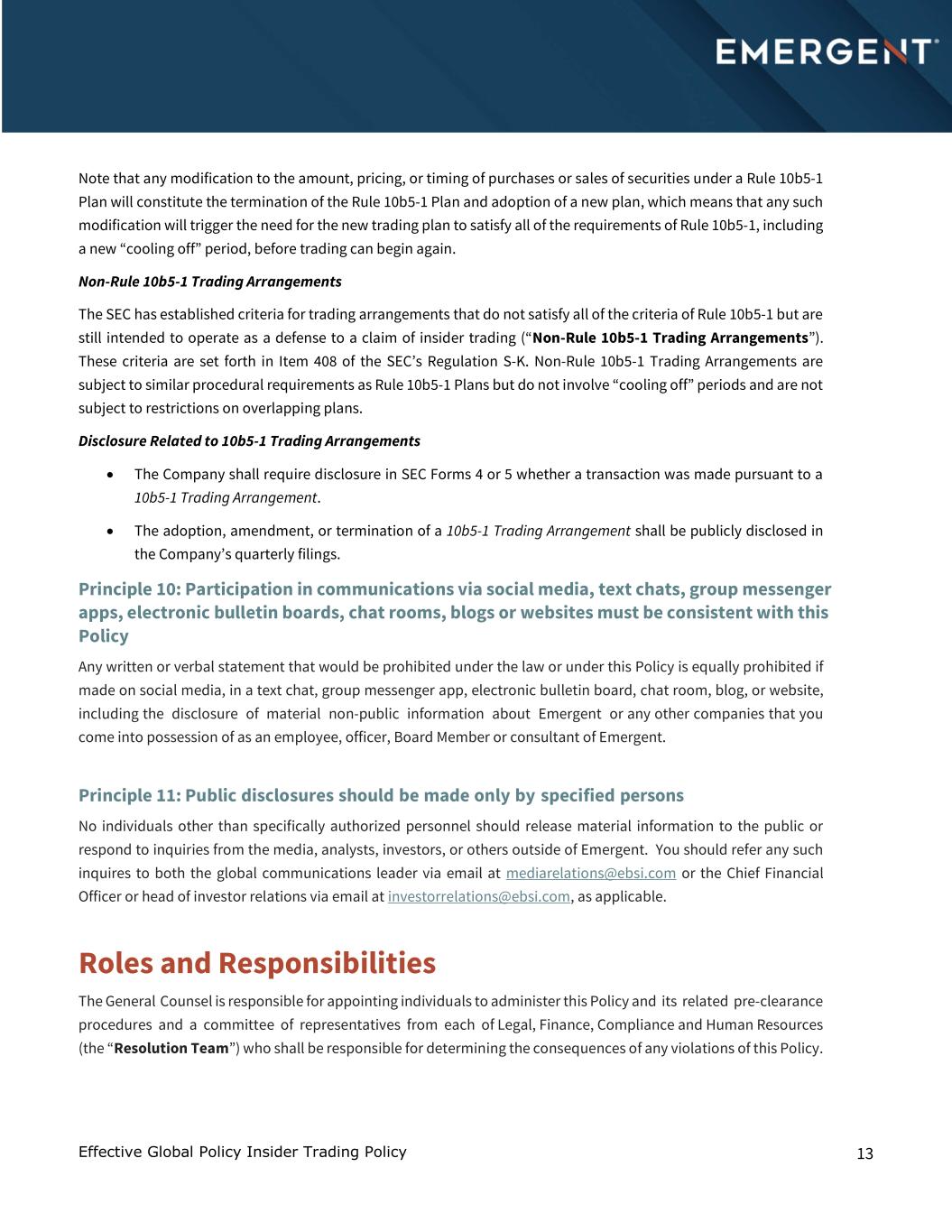 Effective Global Policy Insider Trading Policy 13 Note that any modification to the amount, pricing, or timing of purchases or sales of securities under a Rule 10b5-1 Plan will constitute the termination of the Rule 10b5-1 Plan and adoption of a new plan, which means that any such modification will trigger the need for the new trading plan to satisfy all of the requirements of Rule 10b5-1, including a new “cooling off” period, before trading can begin again. Non-Rule 10b5-1 Trading Arrangements The SEC has established criteria for trading arrangements that do not satisfy all of the criteria of Rule 10b5-1 but are still intended to operate as a defense to a claim of insider trading (“Non-Rule 10b5-1 Trading Arrangements”). These criteria are set forth in Item 408 of the SEC’s Regulation S-K. Non-Rule 10b5-1 Trading Arrangements are subject to similar procedural requirements as Rule 10b5-1 Plans but do not involve “cooling off” periods and are not subject to restrictions on overlapping plans. Disclosure Related to 10b5-1 Trading Arrangements The Company shall require disclosure in SEC Forms 4 or 5 whether a transaction was made pursuant to a 10b5-1 Trading Arrangement. The adoption, amendment, or termination of a 10b5-1 Trading Arrangement shall be publicly disclosed in the Company’s quarterly filings. Principle 10: Participation in communications via social media, text chats, group messenger apps, electronic bulletin boards, chat rooms, blogs or websites must be consistent with this Policy Any written or verbal statement that would be prohibited under the law or under this Policy is equally prohibited if made on social media, in a text chat, group messenger app, electronic bulletin board, chat room, blog, or website, including the disclosure of material non-public information about Emergent or any other companies that you come into possession of as an employee, officer, Board Member or consultant of Emergent. Principle 11: Public disclosures should be made only by specified persons No individuals other than specifically authorized personnel should release material information to the public or respond to inquiries from the media, analysts, investors, or others outside of Emergent. You should refer any such inquires to both the global communications leader via email at mediarelations@ebsi.com or the Chief Financial Officer or head of investor relations via email at investorrelations@ebsi.com, as applicable. Roles and Responsibilities The General Counsel is responsible for appointing individuals to administer this Policy and its related pre-clearance procedures and a committee of representatives from each of Legal, Finance, Compliance and Human Resources (the “Resolution Team”) who shall be responsible for determining the consequences of any violations of this Policy.