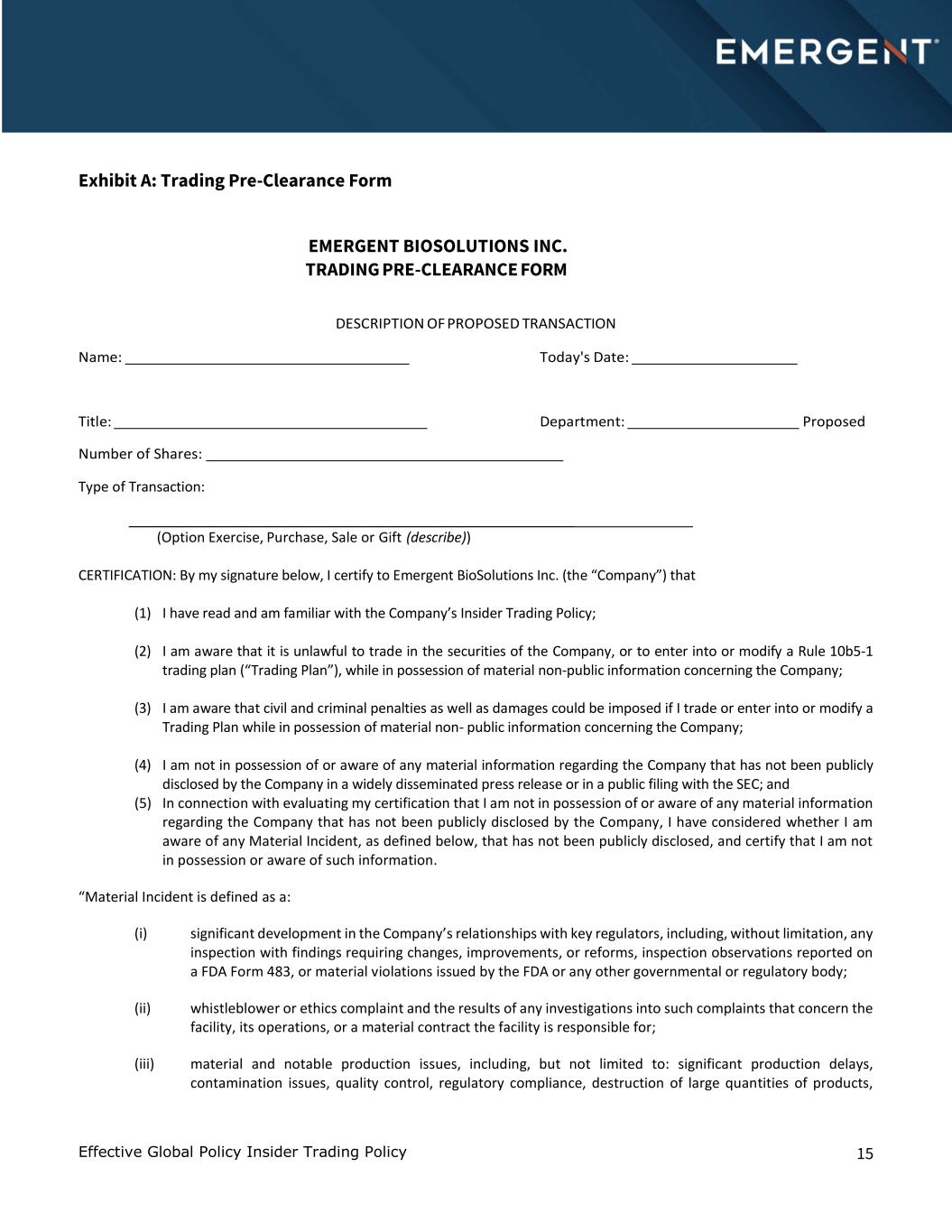 Effective Global Policy Insider Trading Policy 15 Exhibit A: Trading Pre-Clearance Form EMERGENT BIOSOLUTIONS INC. TRADING PRE-CLEARANCE FORM DESCRIPTION OF PROPOSED TRANSACTION Name: Today's Date: Title: Department: Proposed Number of Shares: Type of Transaction: (Option Exercise, Purchase, Sale or Gift (describe)) CERTIFICATION: By my signature below, I certify to Emergent BioSolutions Inc. (the “Company”) that (1) I have read and am familiar with the Company’s Insider Trading Policy; (2) I am aware that it is unlawful to trade in the securities of the Company, or to enter into or modify a Rule 10b5-1 trading plan (“Trading Plan”), while in possession of material non-public information concerning the Company; (3) I am aware that civil and criminal penalties as well as damages could be imposed if I trade or enter into or modify a Trading Plan while in possession of material non- public information concerning the Company; (4) I am not in possession of or aware of any material information regarding the Company that has not been publicly disclosed by the Company in a widely disseminated press release or in a public filing with the SEC; and (5) In connection with evaluating my certification that I am not in possession of or aware of any material information regarding the Company that has not been publicly disclosed by the Company, I have considered whether I am aware of any Material Incident, as defined below, that has not been publicly disclosed, and certify that I am not in possession or aware of such information. “Material Incident is defined as a: (i) significant development in the Company’s relationships with key regulators, including, without limitation, any inspection with findings requiring changes, improvements, or reforms, inspection observations reported on a FDA Form 483, or material violations issued by the FDA or any other governmental or regulatory body; (ii) whistleblower or ethics complaint and the results of any investigations into such complaints that concern the facility, its operations, or a material contract the facility is responsible for; (iii) material and notable production issues, including, but not limited to: significant production delays, contamination issues, quality control, regulatory compliance, destruction of large quantities of products,
