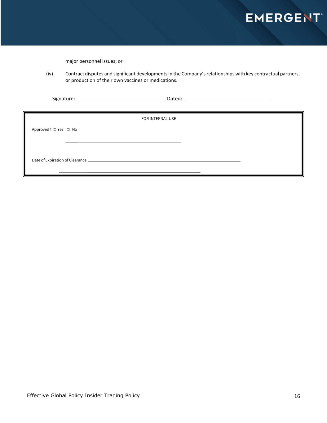 Effective Global Policy Insider Trading Policy 16 major personnel issues; or (iv) Contract disputes and significant developments in the Company’s relationships with key contractual partners, or production of their own vaccines or medications. Signature: Dated: FOR INTERNAL USE Approved? □ Yes □ No Date of Expiration of Clearance