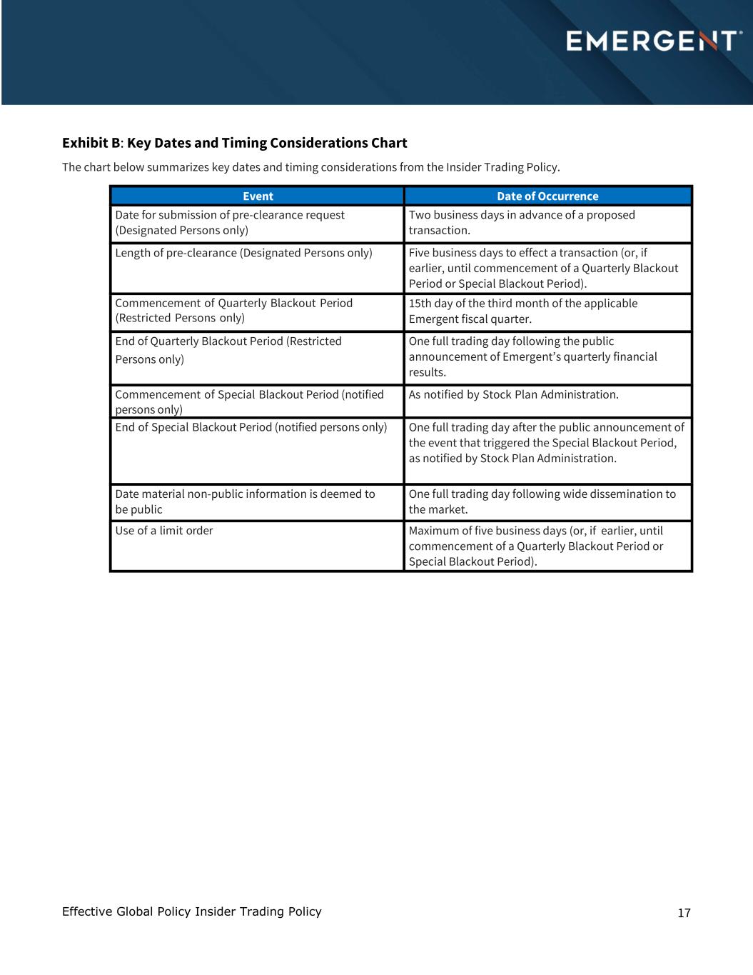 Effective Global Policy Insider Trading Policy 17 Exhibit B: Key Dates and Timing Considerations Chart The chart below summarizes key dates and timing considerations from the Insider Trading Policy. Event Date of Occurrence Date for submission of pre-clearance request (Designated Persons only) Two business days in advance of a proposed transaction. Length of pre-clearance (Designated Persons only) Five business days to effect a transaction (or, if earlier, until commencement of a Quarterly Blackout Period or Special Blackout Period). Commencement of Quarterly Blackout Period (Restricted Persons only) 15th day of the third month of the applicable Emergent fiscal quarter. End of Quarterly Blackout Period (Restricted Persons only) One full trading day following the public announcement of Emergent’s quarterly financial results. Commencement of Special Blackout Period (notified persons only) As notified by Stock Plan Administration. End of Special Blackout Period (notified persons only) One full trading day after the public announcement of the event that triggered the Special Blackout Period, as notified by Stock Plan Administration. Date material non-public information is deemed to be public One full trading day following wide dissemination to the market. Use of a limit order Maximum of five business days (or, if earlier, until commencement of a Quarterly Blackout Period or Special Blackout Period).