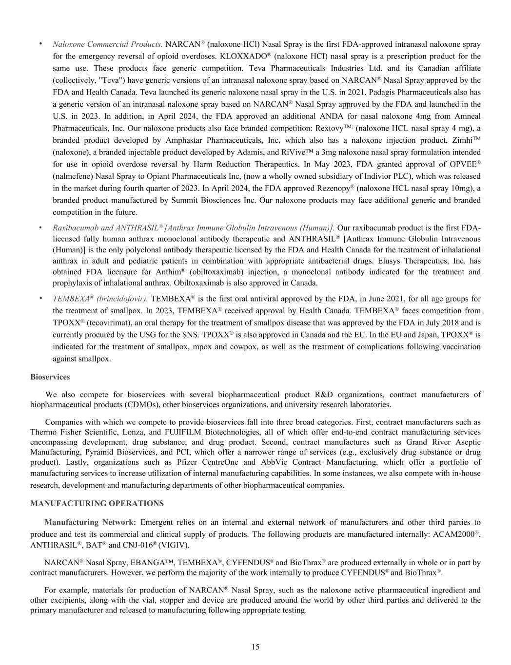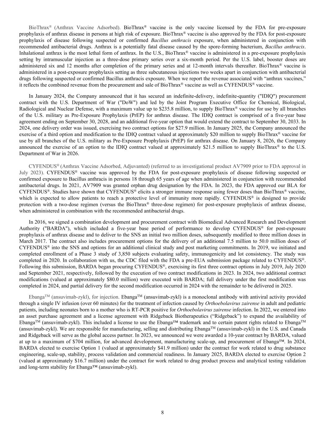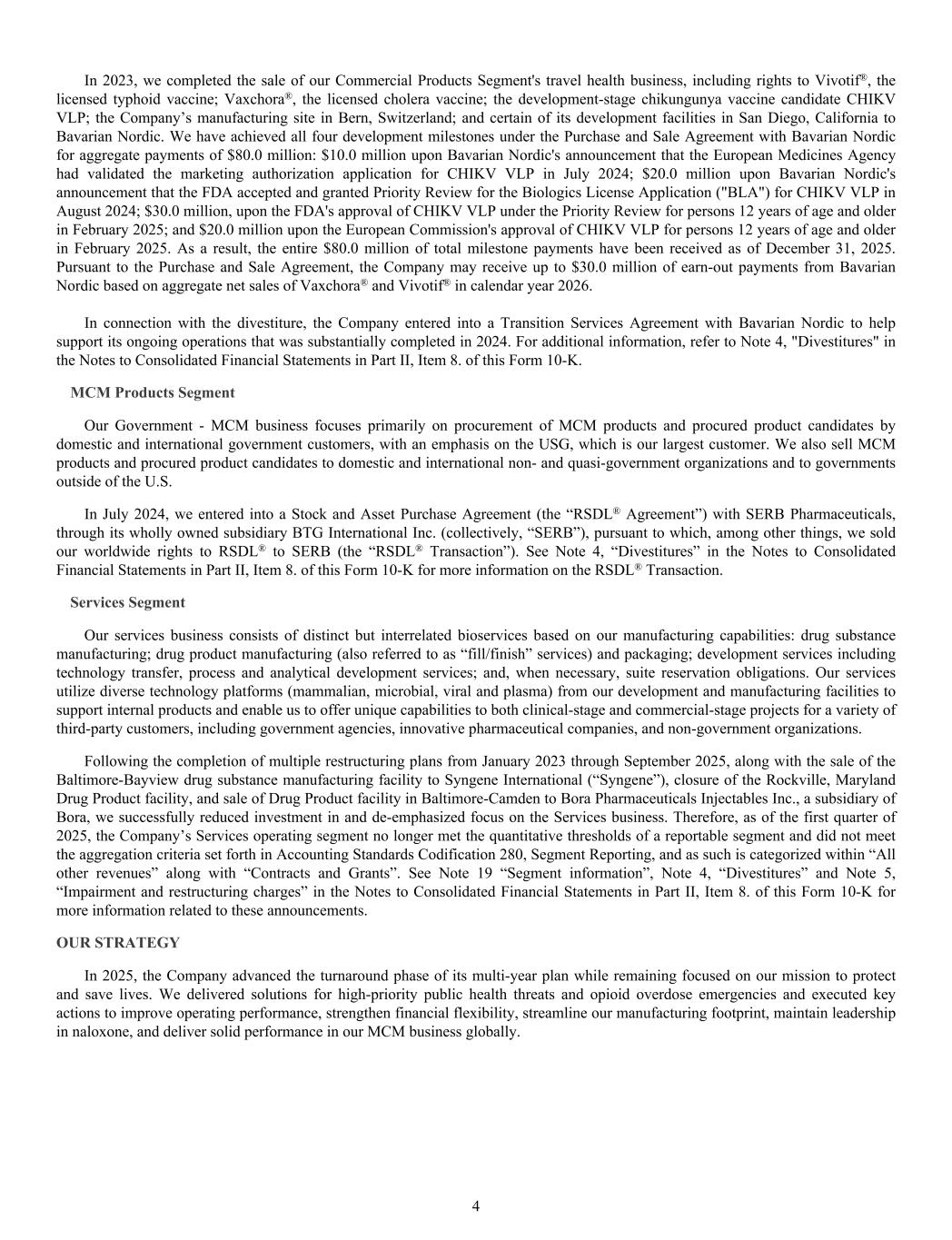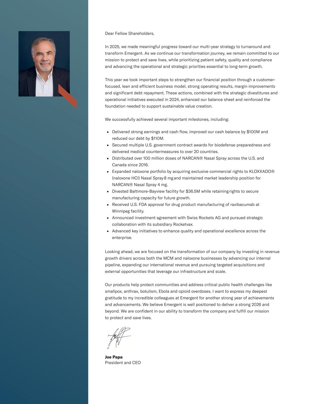 Dear Fellow Shareholders, In 2025, we made meaningful progress toward our multi-year strategy to turnaround and transform Emergent. As we continue our transformation journey, we remain committed to our mission to protect and save lives, while prioritizing patient safety, quality and compliance and advancing the operational and strategic priorities essential to long-term growth. This year we took important steps to strengthen our financial position through a customer- focused, lean and efficient business model, strong operating results, margin improvements and significant debt repayment. These actions, combined with the strategic divestitures and operational initiatives executed in 2024, enhanced our balance sheet and reinforced the foundation needed to support sustainable value creation. We successfully achieved several important milestones, including: Looking ahead, we are focused on the transformation of our company by investing in revenue growth drivers across both the MCM and naloxone businesses by advancing our internal pipeline, expanding our international revenue and pursuing targeted acquisitions and external opportunities that leverage our infrastructure and scale. Our products help protect communities and address critical public health challenges like smallpox, anthrax, botulism, Ebola and opioid overdoses. I want to express my deepest gratitude to my incredible colleagues at Emergent for another strong year of achievements and advancements. We believe Emergent is well positioned to deliver a strong 2026 and beyond. We are confident in our ability to transform the company and fulfill our mission to protect and save lives. Joe Papa President and CEO Delivered strong earnings and cash flow, improved our cash balance by $100M and reduced our debt by $110M. Secured multiple U.S. government contract awards for biodefense preparedness and delivered medical countermeasures to over 20 countries. Distributed over 100 million doses of NARCAN® Nasal Spray across the U.S. and Canada since 2016. Expanded naloxone portfolio by acquiring exclusive commercial rights to KLOXXADO® (naloxone HCI) Nasal Spray 8 mg and maintained market leadership position for NARCAN® Nasal Spray 4 mg. Divested Baltimore-Bayview facility for $36.5M while retaining rights to secure manufacturing capacity for future growth. Received U.S. FDA approval for drug product manufacturing of raxibacumab at Winnipeg facility. Announced investment agreement with Swiss Rockets AG and pursued strategic collaboration with its subsidiary Rocketvax. Advanced key initiatives to enhance quality and operational excellence across the enterprise.