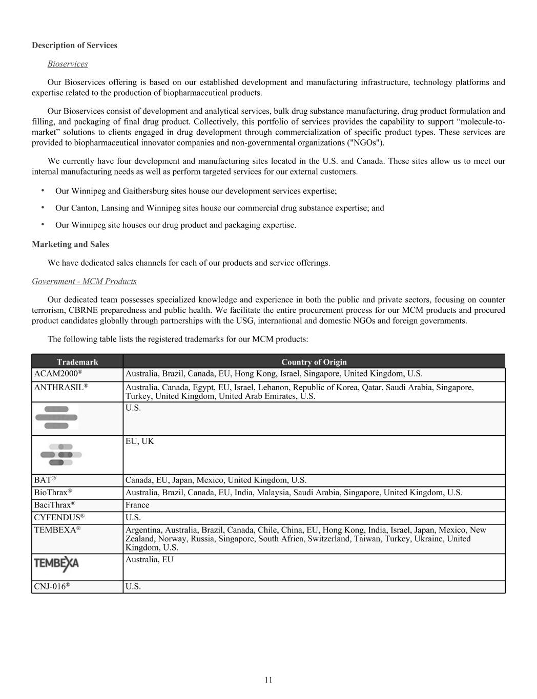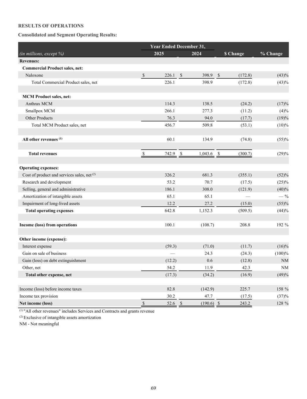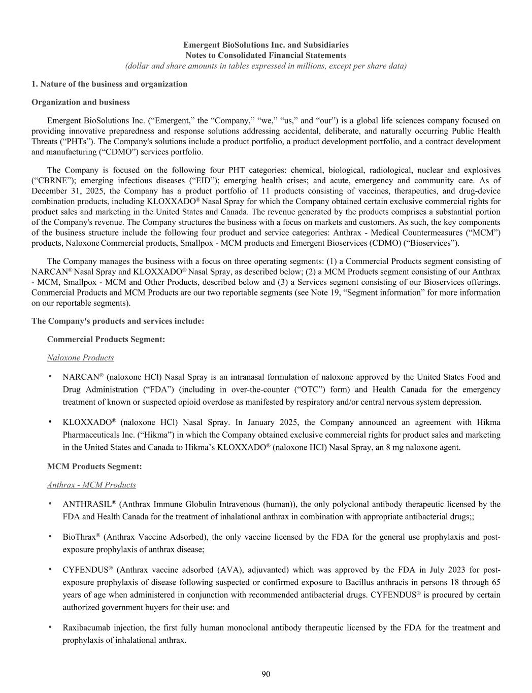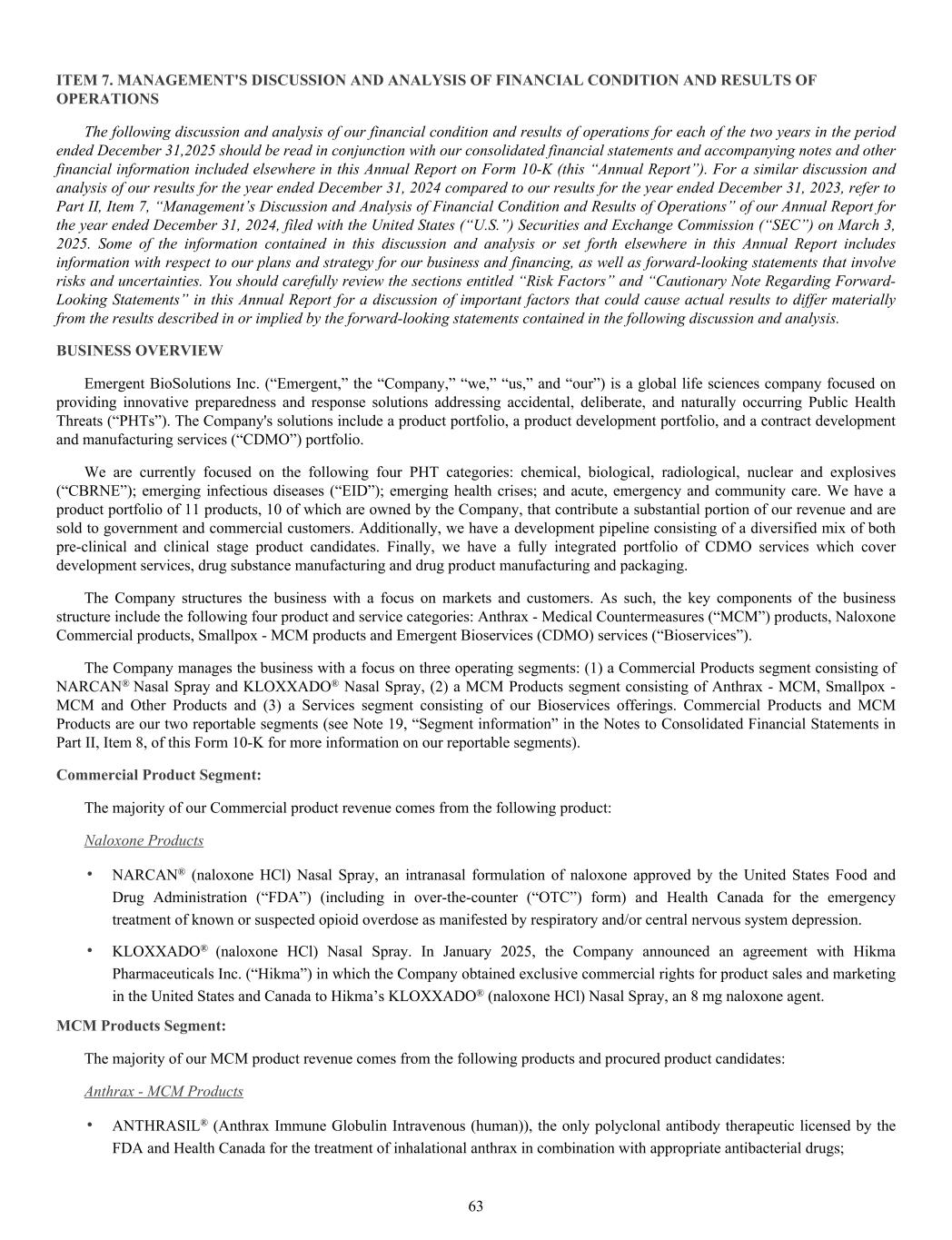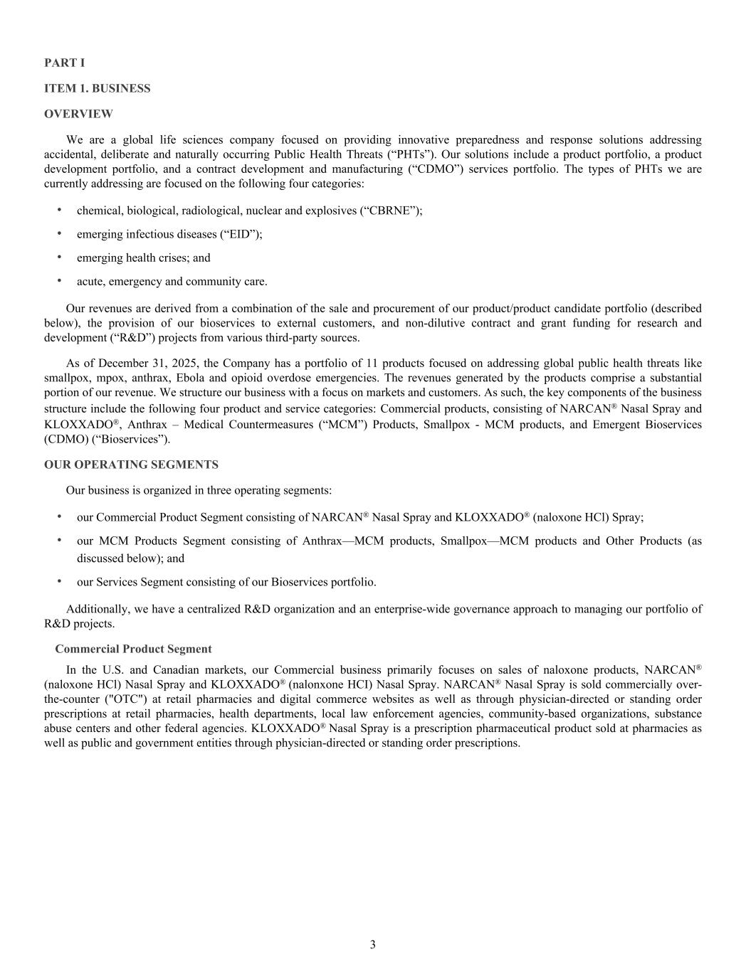 Dear Fellow Shareholders, In 2025, we made meaningful progress toward our multi-year strategy to turnaround and transform Emergent. As we continue our transformation journey, we remain committed to our mission to protect and save lives, while prioritizing patient safety, quality and compliance and advancing the operational and strategic priorities essential to long-term growth. This year we took important steps to strengthen our financial position through a customer- focused, lean and efficient business model, strong operating results, margin improvements and significant debt repayment. These actions, combined with the strategic divestitures and operational initiatives executed in 2024, enhanced our balance sheet and reinforced the foundation needed to support sustainable value creation. We successfully achieved several important milestones, including: Looking ahead, we are focused on the transformation of our company by investing in revenue growth drivers across both the MCM and naloxone businesses by advancing our internal pipeline, expanding our international revenue and pursuing targeted acquisitions and external opportunities that leverage our infrastructure and scale. Our products help protect communities and address critical public health challenges like smallpox, anthrax, botulism, Ebola and opioid overdoses. I want to express my deepest gratitude to my incredible colleagues at Emergent for another strong year of achievements and advancements. We believe Emergent is well positioned to deliver a strong 2026 and beyond. We are confident in our ability to transform the company and fulfill our mission to protect and save lives. Joe Papa President and CEO Delivered strong earnings and cash flow, improved our cash balance by $100M and reduced our debt by $110M. Secured multiple U.S. government contract awards for biodefense preparedness and delivered medical countermeasures to over 20 countries. Distributed over 100 million doses of NARCAN® Nasal Spray across the U.S. and Canada since 2016. Expanded naloxone portfolio by acquiring exclusive commercial rights to KLOXXADO® (naloxone HCI) Nasal Spray 8 mg and maintained market leadership position for NARCAN® Nasal Spray 4 mg. Divested Baltimore-Bayview facility for $36.5M while retaining rights to secure manufacturing capacity for future growth. Received U.S. FDA approval for drug product manufacturing of raxibacumab at Winnipeg facility. Announced investment agreement with Swiss Rockets AG and pursued strategic collaboration with its subsidiary Rocketvax. Advanced key initiatives to enhance quality and operational excellence across the enterprise.
