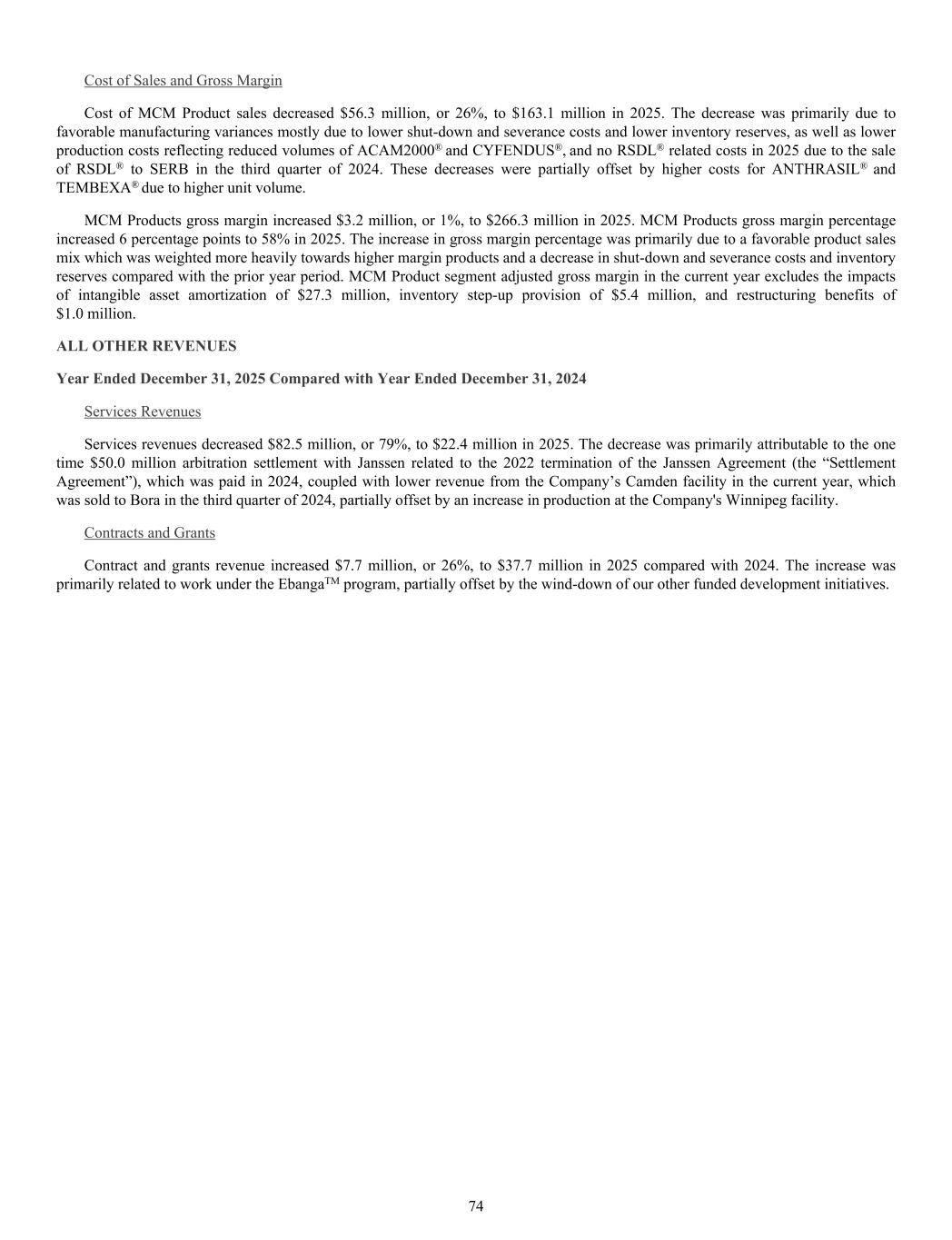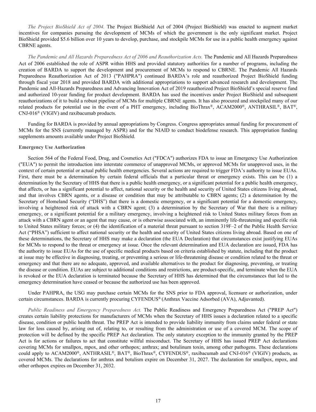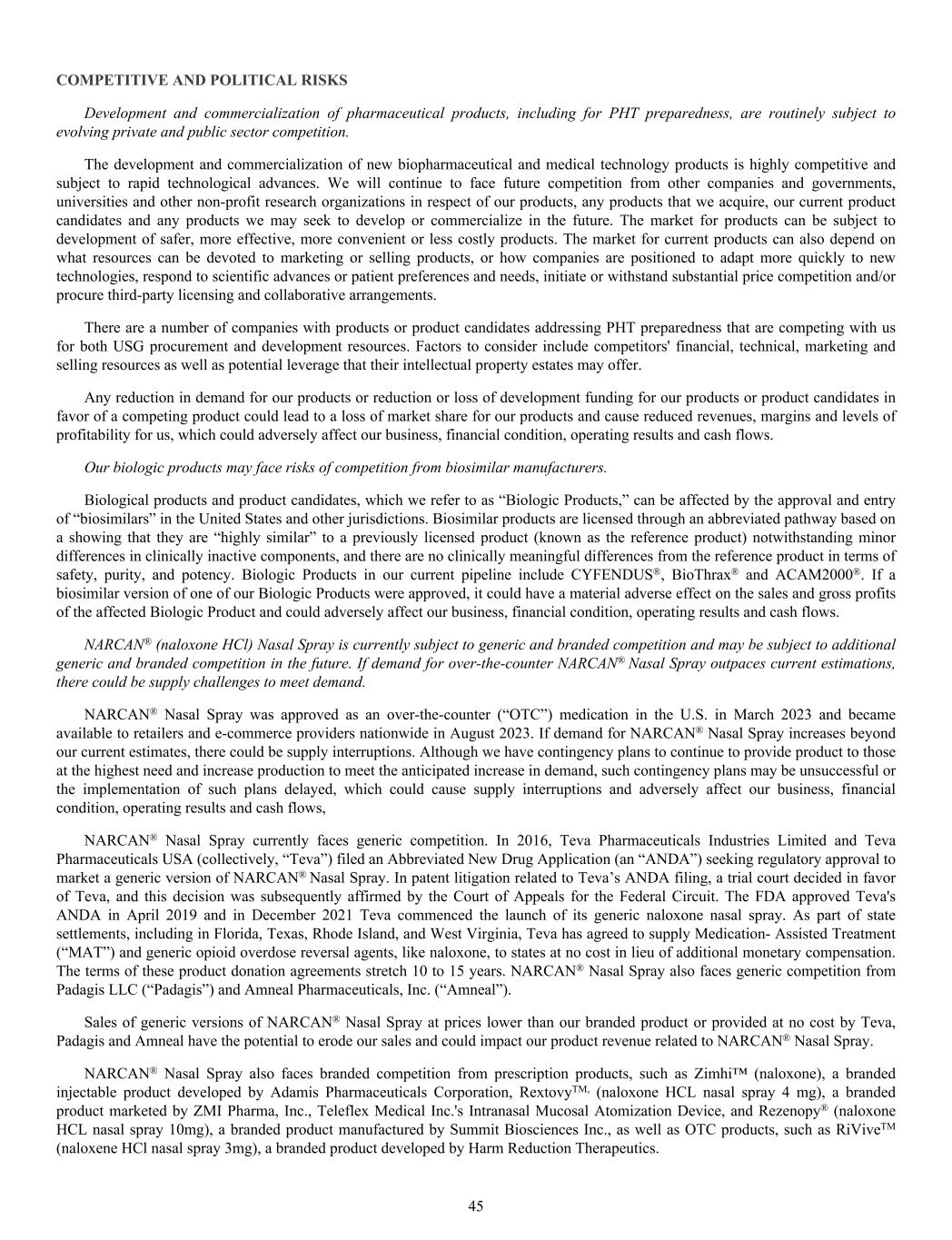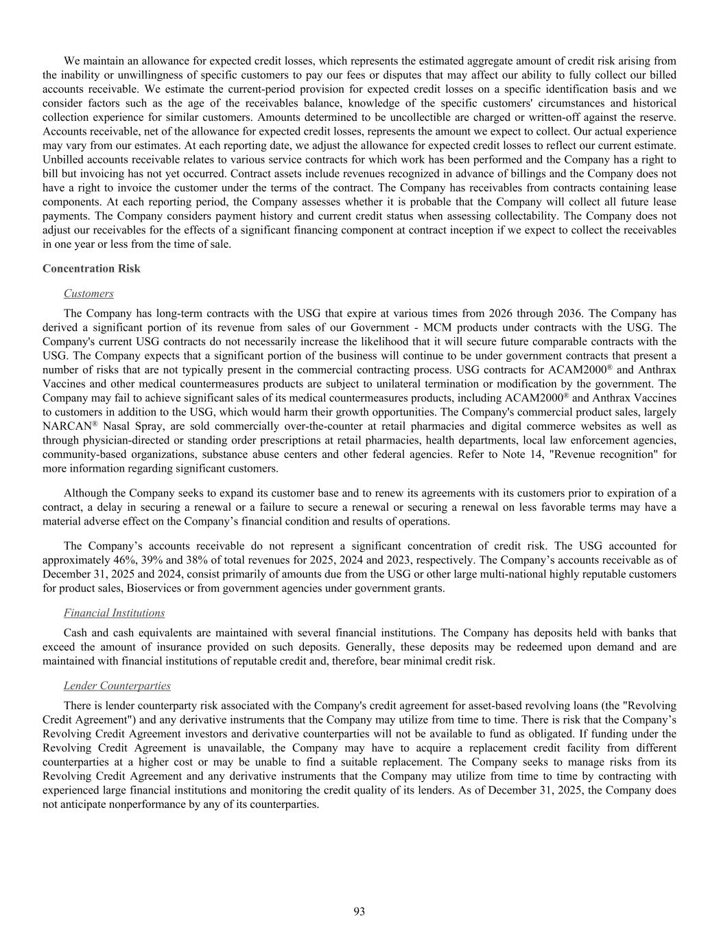 Dear Fellow Shareholders, In 2025, we made meaningful progress toward our multi-year strategy to turnaround and transform Emergent. As we continue our transformation journey, we remain committed to our mission to protect and save lives, while prioritizing patient safety, quality and compliance and advancing the operational and strategic priorities essential to long-term growth. This year we took important steps to strengthen our financial position through a customer- focused, lean and efficient business model, strong operating results, margin improvements and significant debt repayment. These actions, combined with the strategic divestitures and operational initiatives executed in 2024, enhanced our balance sheet and reinforced the foundation needed to support sustainable value creation. We successfully achieved several important milestones, including: Looking ahead, we are focused on the transformation of our company by investing in revenue growth drivers across both the MCM and naloxone businesses by advancing our internal pipeline, expanding our international revenue and pursuing targeted acquisitions and external opportunities that leverage our infrastructure and scale. Our products help protect communities and address critical public health challenges like smallpox, anthrax, botulism, Ebola and opioid overdoses. I want to express my deepest gratitude to my incredible colleagues at Emergent for another strong year of achievements and advancements. We believe Emergent is well positioned to deliver a strong 2026 and beyond. We are confident in our ability to transform the company and fulfill our mission to protect and save lives. Joe Papa President and CEO Delivered strong earnings and cash flow, improved our cash balance by $100M and reduced our debt by $110M. Secured multiple U.S. government contract awards for biodefense preparedness and delivered medical countermeasures to over 20 countries. Distributed over 100 million doses of NARCAN® Nasal Spray across the U.S. and Canada since 2016. Expanded naloxone portfolio by acquiring exclusive commercial rights to KLOXXADO® (naloxone HCI) Nasal Spray 8 mg and maintained market leadership position for NARCAN® Nasal Spray 4 mg. Divested Baltimore-Bayview facility for $36.5M while retaining rights to secure manufacturing capacity for future growth. Received U.S. FDA approval for drug product manufacturing of raxibacumab at Winnipeg facility. Announced investment agreement with Swiss Rockets AG and pursued strategic collaboration with its subsidiary Rocketvax. Advanced key initiatives to enhance quality and operational excellence across the enterprise.