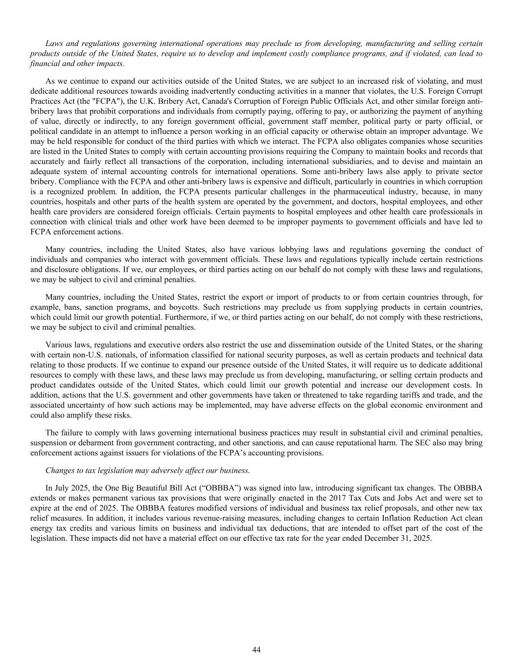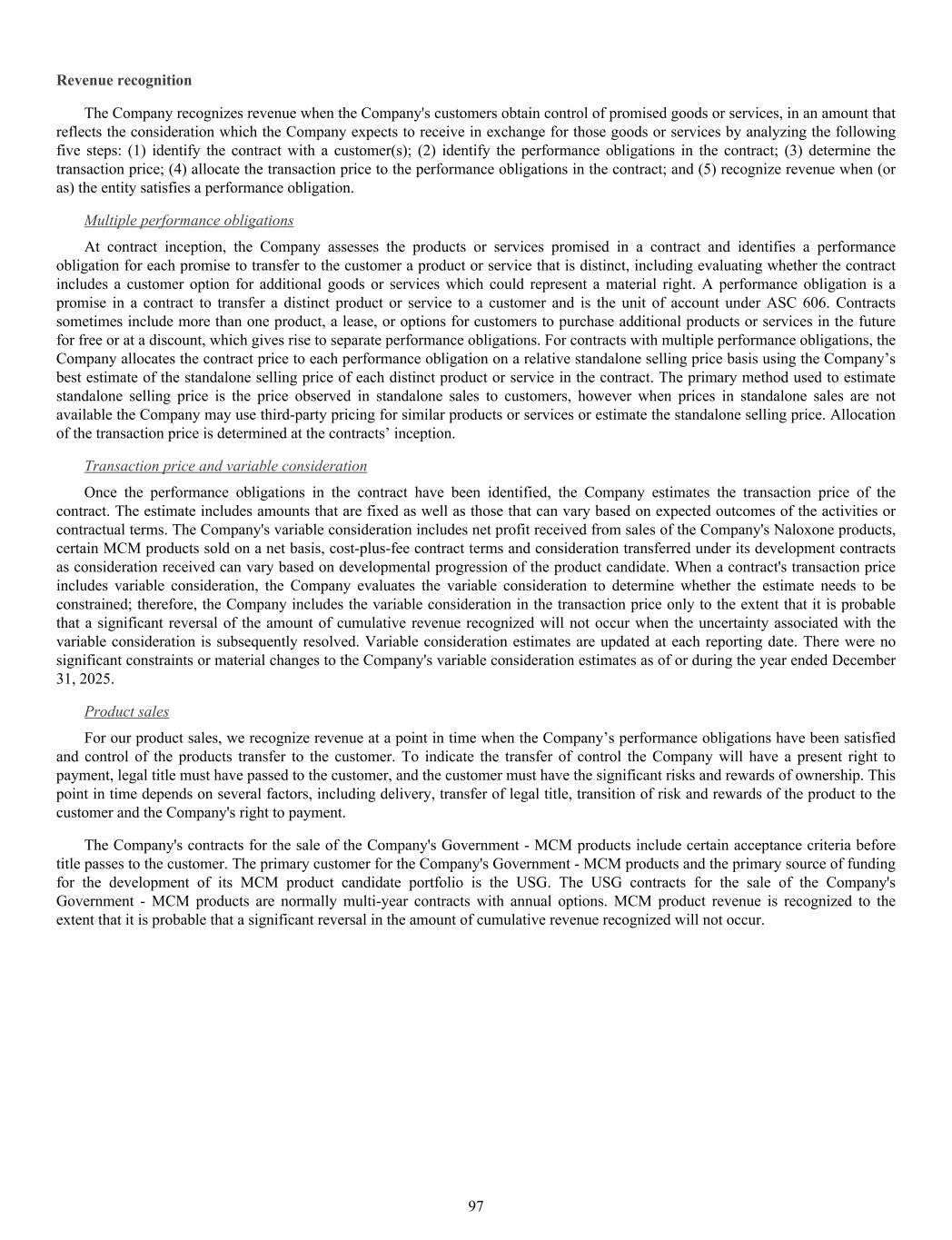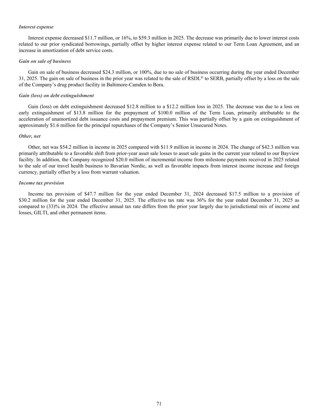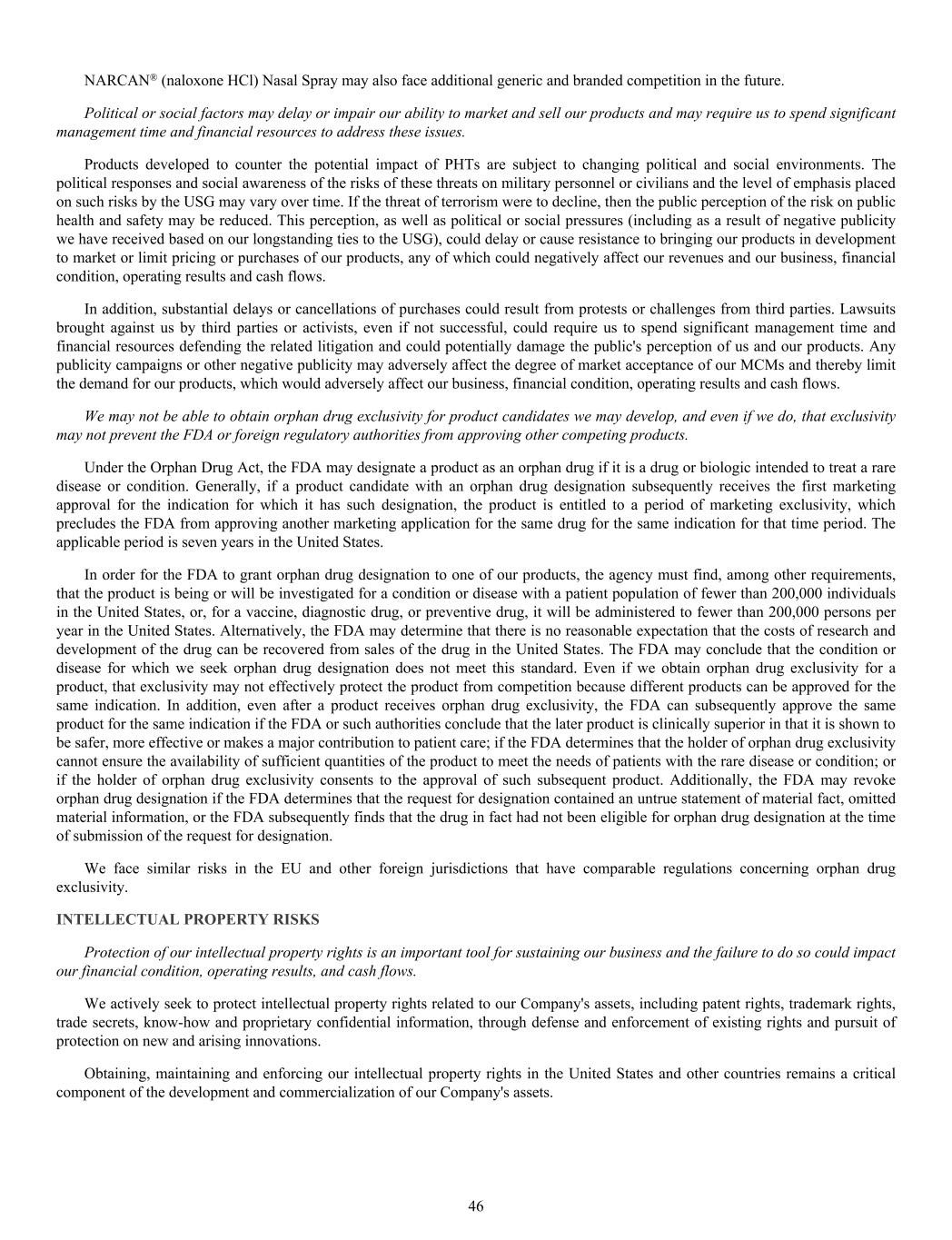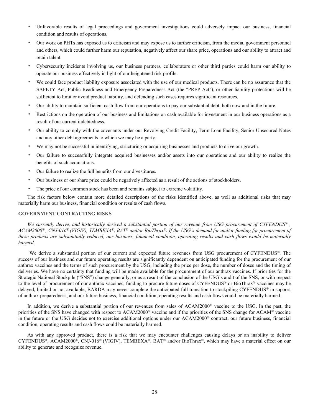 Dear Fellow Shareholders, In 2025, we made meaningful progress toward our multi-year strategy to turnaround and transform Emergent. As we continue our transformation journey, we remain committed to our mission to protect and save lives, while prioritizing patient safety, quality and compliance and advancing the operational and strategic priorities essential to long-term growth. This year we took important steps to strengthen our financial position through a customer- focused, lean and efficient business model, strong operating results, margin improvements and significant debt repayment. These actions, combined with the strategic divestitures and operational initiatives executed in 2024, enhanced our balance sheet and reinforced the foundation needed to support sustainable value creation. We successfully achieved several important milestones, including: Looking ahead, we are focused on the transformation of our company by investing in revenue growth drivers across both the MCM and naloxone businesses by advancing our internal pipeline, expanding our international revenue and pursuing targeted acquisitions and external opportunities that leverage our infrastructure and scale. Our products help protect communities and address critical public health challenges like smallpox, anthrax, botulism, Ebola and opioid overdoses. I want to express my deepest gratitude to my incredible colleagues at Emergent for another strong year of achievements and advancements. We believe Emergent is well positioned to deliver a strong 2026 and beyond. We are confident in our ability to transform the company and fulfill our mission to protect and save lives. Joe Papa President and CEO Delivered strong earnings and cash flow, improved our cash balance by $100M and reduced our debt by $110M. Secured multiple U.S. government contract awards for biodefense preparedness and delivered medical countermeasures to over 20 countries. Distributed over 100 million doses of NARCAN® Nasal Spray across the U.S. and Canada since 2016. Expanded naloxone portfolio by acquiring exclusive commercial rights to KLOXXADO® (naloxone HCI) Nasal Spray 8 mg and maintained market leadership position for NARCAN® Nasal Spray 4 mg. Divested Baltimore-Bayview facility for $36.5M while retaining rights to secure manufacturing capacity for future growth. Received U.S. FDA approval for drug product manufacturing of raxibacumab at Winnipeg facility. Announced investment agreement with Swiss Rockets AG and pursued strategic collaboration with its subsidiary Rocketvax. Advanced key initiatives to enhance quality and operational excellence across the enterprise.