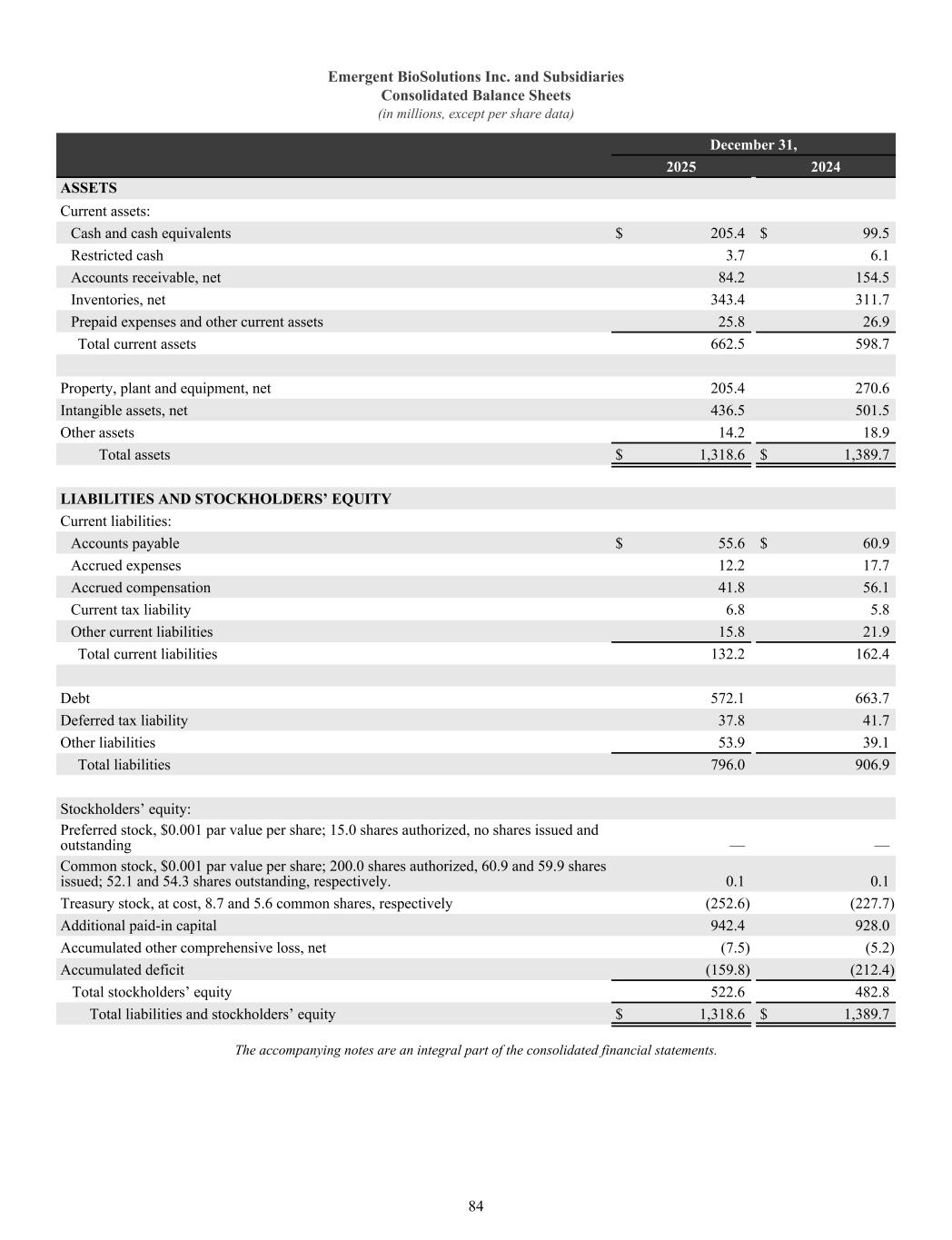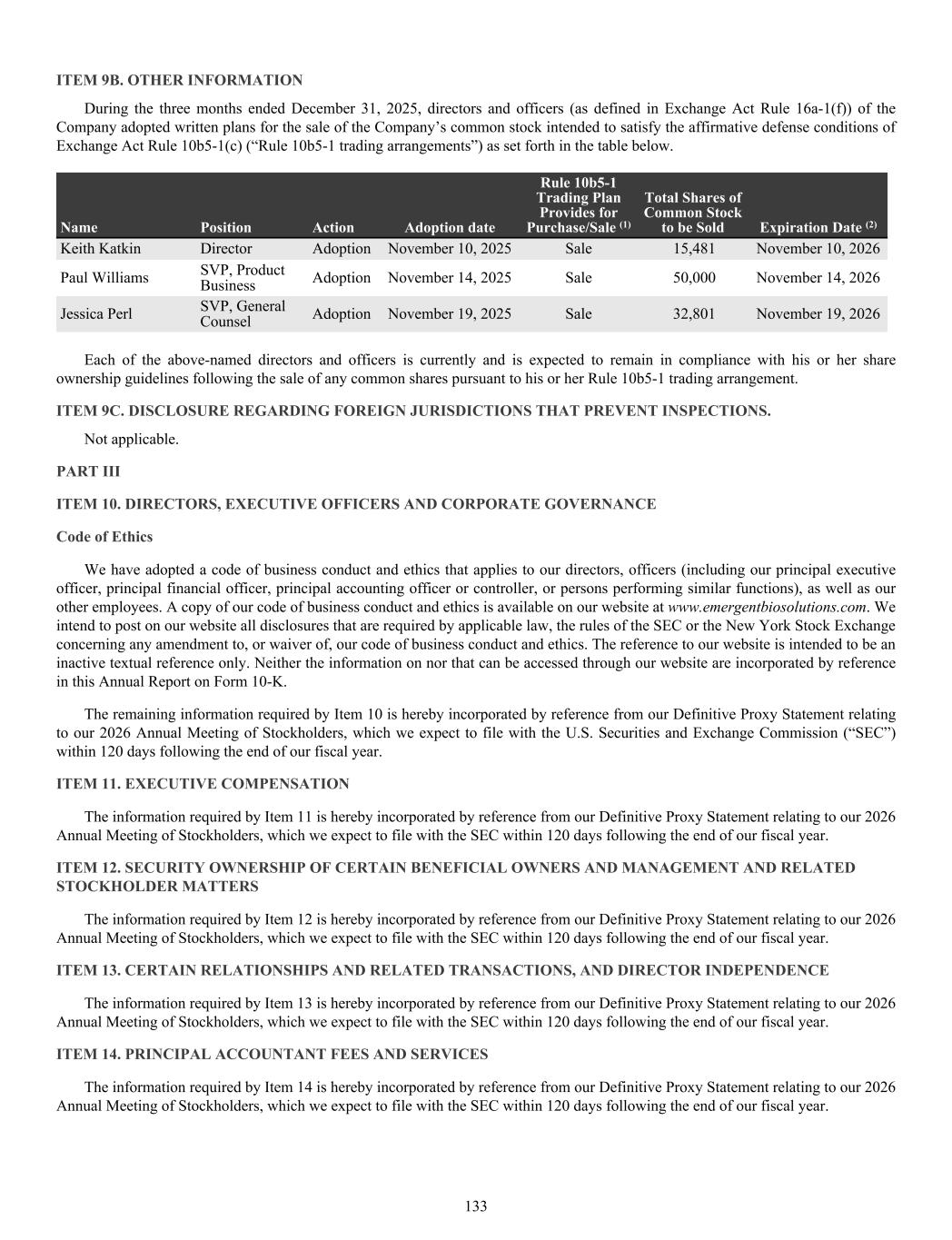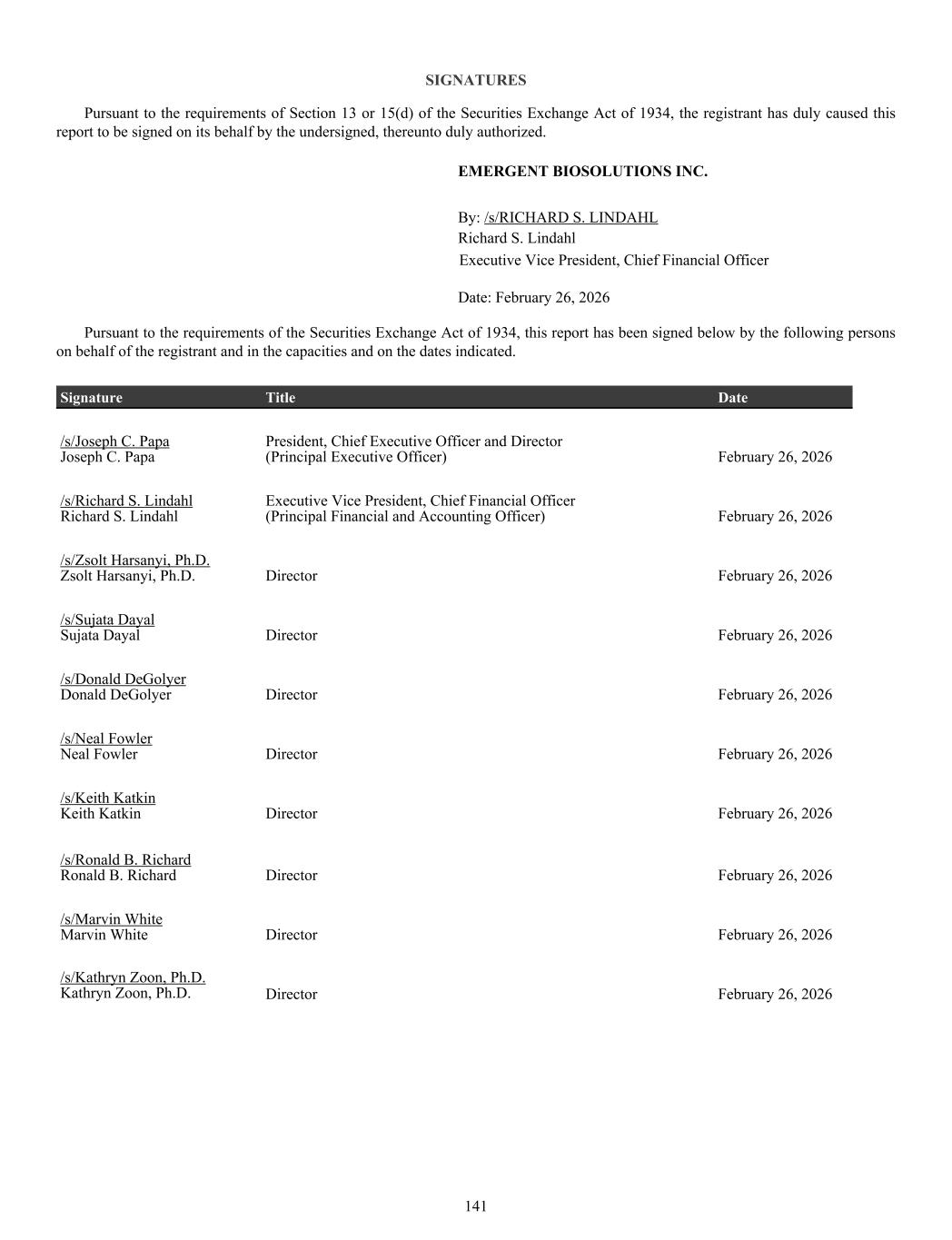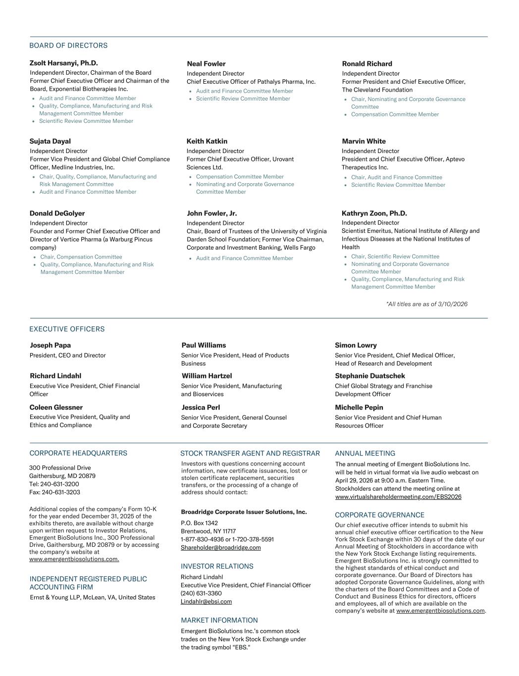 EXECUTIVE OFFICERS BOARD OF DIRECTORS CORPORATE HEADQUARTERS INDEPENDENT REGISTERED PUBLIC ACCOUNTING FIRM INVESTOR RELATIONS STOCK TRANSFER AGENT AND REGISTRAR ANNUAL MEETING MARKET INFORMATION CORPORATE GOVERNANCE Investors with questions concerning account information, new certificate issuances, lost or stolen certificate replacement, securities transfers, or the processing of a change of address should contact: . Our chief executive officer intends to submit his annual chief executive officer certification to the New York Stock Exchange within 30 days of the date of our Annual Meeting of Stockholders in accordance with the New York Stock Exchange listing requirements. Emergent BioSolutions Inc. is strongly committed to the highest standards of ethical conduct and corporate governance. Our Board of Directors has adopted Corporate Governance Guidelines, along with the charters of the Board Committees and a Code of Conduct and Business Ethics for directors, officers and employees, all of which are available on the company’s website at www.emergentbiosolutions.com. Additional copies of the company’s Form 10-K for the year ended December 31, 2025 of the exhibits thereto, are available without charge upon written request to Investor Relations, Emergent BioSolutions Inc., 300 Professional Drive, Gaithersburg, MD 20879 or by accessing the company's website at www.emergentbiosolutions.com. Broadridge Corporate Issuer Solutions, Inc. *All titles are as of 3/10/2026 Joseph Papa President, CEO and Director Richard Lindahl Executive Vice President, Chief Financial Officer Coleen Glessner Executive Vice President, Quality and Ethics and Compliance Jessica Perl Senior Vice President, General Counsel and Corporate Secretary William Hartzel Senior Vice President, Manufacturing and Bioservices Paul Williams Senior Vice President, Head of Products Business Simon Lowry Senior Vice President, Chief Medical Officer, Head of Research and Development Stephanie Duatschek Chief Global Strategy and Franchise Development Officer Michelle Pepin Senior Vice President and Chief Human Resources Officer Zsolt Harsanyi, Ph.D. Independent Director, Chairman of the Board Former Chief Executive Officer and Chairman of the Board, Exponential Biotherapies Inc. Audit and Finance Committee Member Quality, Compliance, Manufacturing and Risk Management Committee Member Scientific Review Committee Member Neal Fowler Independent Director Chief Executive Officer of Pathalys Pharma, Inc. Audit and Finance Committee Member Scientific Review Committee Member Sujata Dayal Independent Director Former Vice President and Global Chief Compliance Officer, Medline Industries, Inc. Chair, Quality, Compliance, Manufacturing and Risk Management Committee Audit and Finance Committee Member Keith Katkin Independent Director Former Chief Executive Officer, Urovant Sciences Ltd. Compensation Committee Member Nominating and Corporate Governance Committee Member Marvin White Independent Director President and Chief Executive Officer, Aptevo Therapeutics Inc. Chair, Audit and Finance Committee Scientific Review Committee Member Donald DeGolyer Independent Director Founder and Former Chief Executive Officer and Director of Vertice Pharma (a Warburg Pincus company) Chair, Compensation Committee Quality, Compliance, Manufacturing and Risk Management Committee Member Ronald Richard Independent Director Former President and Chief Executive Officer, The Cleveland Foundation Chair, Nominating and Corporate Governance Committee Compensation Committee Member Kathryn Zoon, Ph.D. Independent Director Scientist Emeritus, National Institute of Allergy and Infectious Diseases at the National Institutes of Health Chair, Scientific Review Committee Nominating and Corporate Governance Committee Member Quality, Compliance, Manufacturing and Risk Management Committee Member 300 Professional Drive Gaithersburg, MD 20879 Tel: 240-631-3200 Fax: 240-631-3203 Ernst & Young LLP, McLean, VA, United States P.O. Box 1342 Brentwood, NY 11717 1-877-830-4936 or 1-720-378-5591 Shareholder@broadridge.com Richard Lindahl Executive Vice President, Chief Financial Officer (240) 631-3360 Lindahlr@ebsi.com Emergent BioSolutions Inc.’s common stock trades on the New York Stock Exchange under the trading symbol "EBS." The annual meeting of Emergent BioSolutions Inc. will be held in virtual format via live audio webcast on April 29, 2026 at 9:00 a.m. Eastern Time. Stockholders can attend the meeting online at www.virtualshareholdermeeting.com/EBS2026 John Fowler, Jr. Independent Director Chair, Board of Trustees of the University of Virginia Darden School Foundation; Former Vice Chairman, Corporate and Investment Banking, Wells Fargo Audit and Finance Committee Member