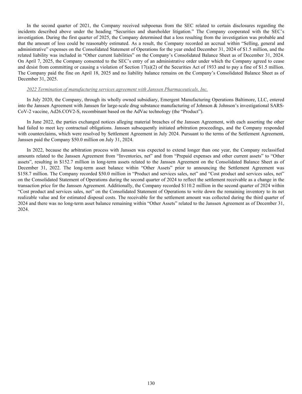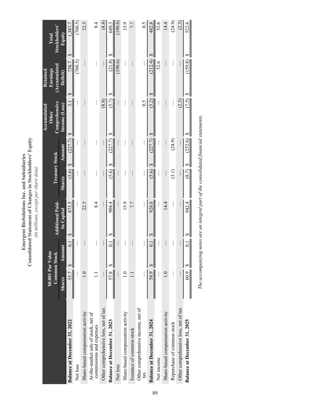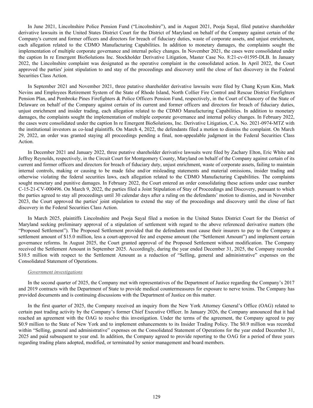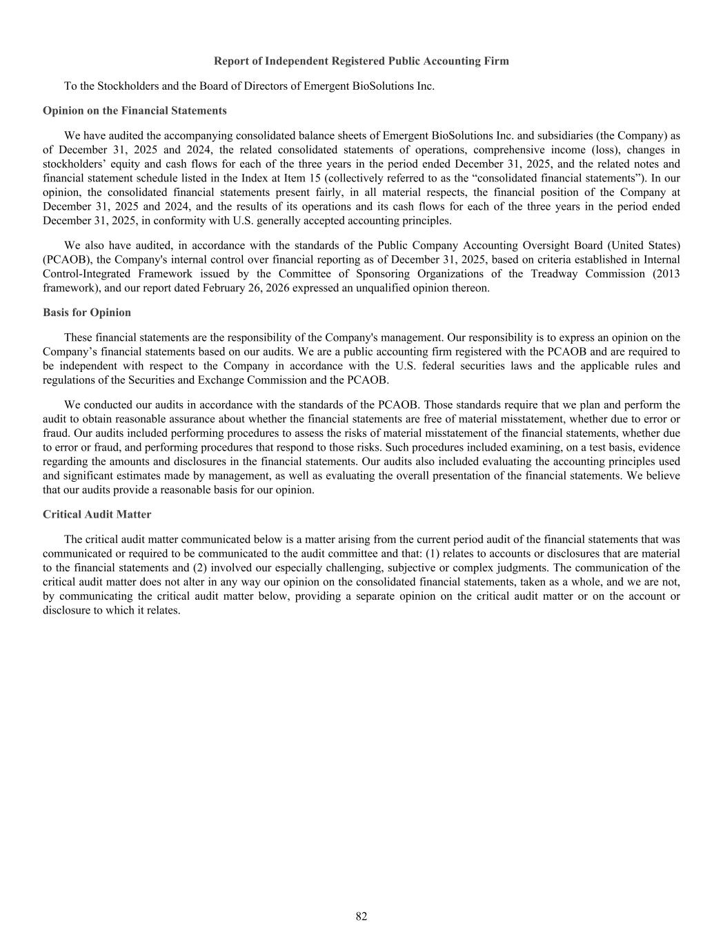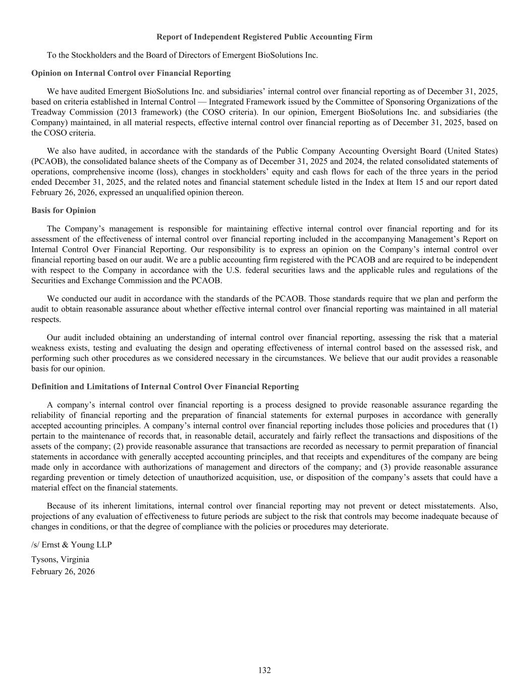 EXECUTIVE OFFICERS BOARD OF DIRECTORS CORPORATE HEADQUARTERS INDEPENDENT REGISTERED PUBLIC ACCOUNTING FIRM INVESTOR RELATIONS STOCK TRANSFER AGENT AND REGISTRAR ANNUAL MEETING MARKET INFORMATION CORPORATE GOVERNANCE Investors with questions concerning account information, new certificate issuances, lost or stolen certificate replacement, securities transfers, or the processing of a change of address should contact: . Our chief executive officer intends to submit his annual chief executive officer certification to the New York Stock Exchange within 30 days of the date of our Annual Meeting of Stockholders in accordance with the New York Stock Exchange listing requirements. Emergent BioSolutions Inc. is strongly committed to the highest standards of ethical conduct and corporate governance. Our Board of Directors has adopted Corporate Governance Guidelines, along with the charters of the Board Committees and a Code of Conduct and Business Ethics for directors, officers and employees, all of which are available on the company’s website at www.emergentbiosolutions.com. Additional copies of the company’s Form 10-K for the year ended December 31, 2025 of the exhibits thereto, are available without charge upon written request to Investor Relations, Emergent BioSolutions Inc., 300 Professional Drive, Gaithersburg, MD 20879 or by accessing the company's website at www.emergentbiosolutions.com. Broadridge Corporate Issuer Solutions, Inc. *All titles are as of 3/10/2026 Joseph Papa President, CEO and Director Richard Lindahl Executive Vice President, Chief Financial Officer Coleen Glessner Executive Vice President, Quality and Ethics and Compliance Jessica Perl Senior Vice President, General Counsel and Corporate Secretary William Hartzel Senior Vice President, Manufacturing and Bioservices Paul Williams Senior Vice President, Head of Products Business Simon Lowry Senior Vice President, Chief Medical Officer, Head of Research and Development Stephanie Duatschek Chief Global Strategy and Franchise Development Officer Michelle Pepin Senior Vice President and Chief Human Resources Officer Zsolt Harsanyi, Ph.D. Independent Director, Chairman of the Board Former Chief Executive Officer and Chairman of the Board, Exponential Biotherapies Inc. Audit and Finance Committee Member Quality, Compliance, Manufacturing and Risk Management Committee Member Scientific Review Committee Member Neal Fowler Independent Director Chief Executive Officer of Pathalys Pharma, Inc. Audit and Finance Committee Member Scientific Review Committee Member Sujata Dayal Independent Director Former Vice President and Global Chief Compliance Officer, Medline Industries, Inc. Chair, Quality, Compliance, Manufacturing and Risk Management Committee Audit and Finance Committee Member Keith Katkin Independent Director Former Chief Executive Officer, Urovant Sciences Ltd. Compensation Committee Member Nominating and Corporate Governance Committee Member Marvin White Independent Director President and Chief Executive Officer, Aptevo Therapeutics Inc. Chair, Audit and Finance Committee Scientific Review Committee Member Donald DeGolyer Independent Director Founder and Former Chief Executive Officer and Director of Vertice Pharma (a Warburg Pincus company) Chair, Compensation Committee Quality, Compliance, Manufacturing and Risk Management Committee Member Ronald Richard Independent Director Former President and Chief Executive Officer, The Cleveland Foundation Chair, Nominating and Corporate Governance Committee Compensation Committee Member Kathryn Zoon, Ph.D. Independent Director Scientist Emeritus, National Institute of Allergy and Infectious Diseases at the National Institutes of Health Chair, Scientific Review Committee Nominating and Corporate Governance Committee Member Quality, Compliance, Manufacturing and Risk Management Committee Member 300 Professional Drive Gaithersburg, MD 20879 Tel: 240-631-3200 Fax: 240-631-3203 Ernst & Young LLP, McLean, VA, United States P.O. Box 1342 Brentwood, NY 11717 1-877-830-4936 or 1-720-378-5591 Shareholder@broadridge.com Richard Lindahl Executive Vice President, Chief Financial Officer (240) 631-3360 Lindahlr@ebsi.com Emergent BioSolutions Inc.’s common stock trades on the New York Stock Exchange under the trading symbol "EBS." The annual meeting of Emergent BioSolutions Inc. will be held in virtual format via live audio webcast on April 29, 2026 at 9:00 a.m. Eastern Time. Stockholders can attend the meeting online at www.virtualshareholdermeeting.com/EBS2026 John Fowler, Jr. Independent Director Chair, Board of Trustees of the University of Virginia Darden School Foundation; Former Vice Chairman, Corporate and Investment Banking, Wells Fargo Audit and Finance Committee Member