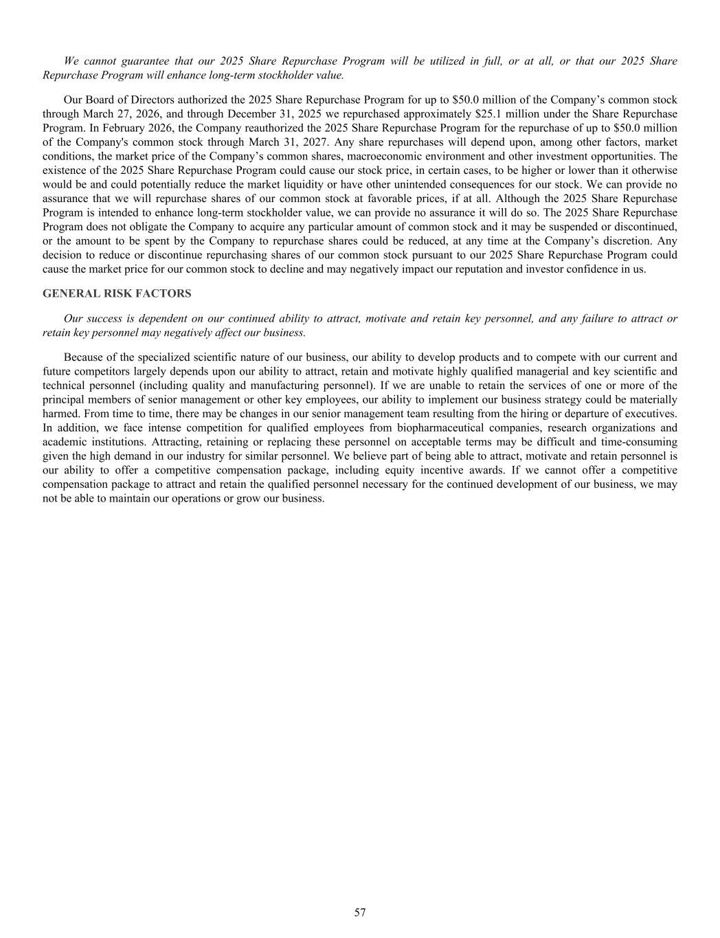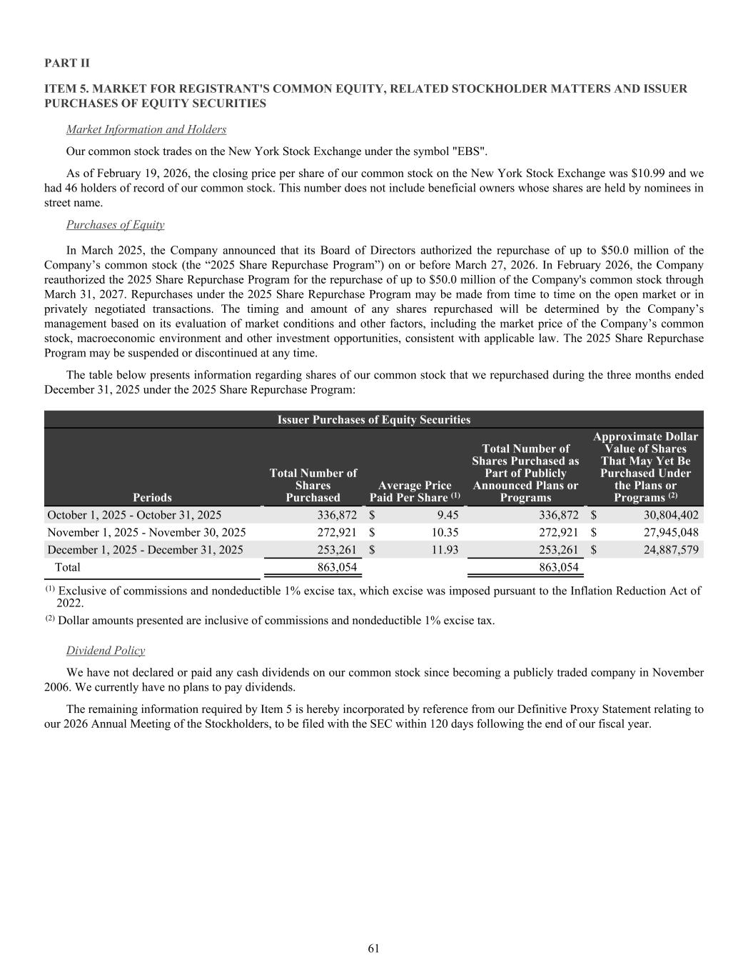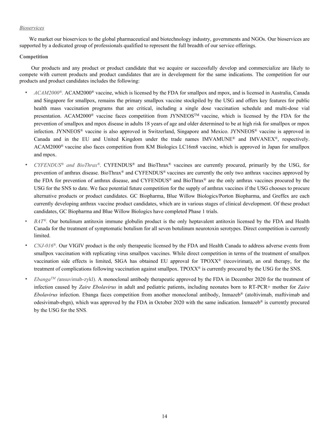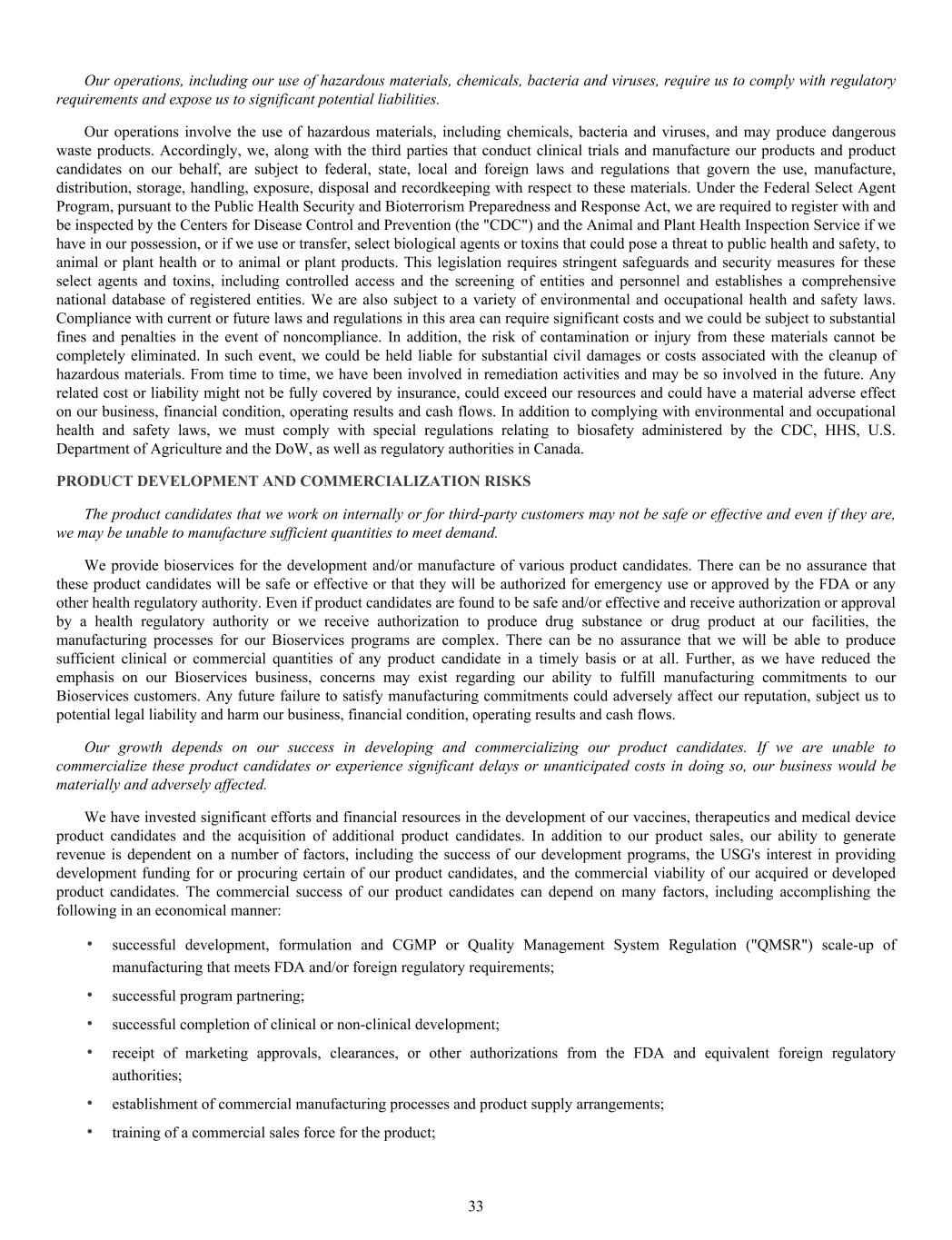 EXECUTIVE OFFICERS BOARD OF DIRECTORS CORPORATE HEADQUARTERS INDEPENDENT REGISTERED PUBLIC ACCOUNTING FIRM INVESTOR RELATIONS STOCK TRANSFER AGENT AND REGISTRAR ANNUAL MEETING MARKET INFORMATION CORPORATE GOVERNANCE Investors with questions concerning account information, new certificate issuances, lost or stolen certificate replacement, securities transfers, or the processing of a change of address should contact: . Our chief executive officer intends to submit his annual chief executive officer certification to the New York Stock Exchange within 30 days of the date of our Annual Meeting of Stockholders in accordance with the New York Stock Exchange listing requirements. Emergent BioSolutions Inc. is strongly committed to the highest standards of ethical conduct and corporate governance. Our Board of Directors has adopted Corporate Governance Guidelines, along with the charters of the Board Committees and a Code of Conduct and Business Ethics for directors, officers and employees, all of which are available on the company’s website at www.emergentbiosolutions.com. Additional copies of the company’s Form 10-K for the year ended December 31, 2025 of the exhibits thereto, are available without charge upon written request to Investor Relations, Emergent BioSolutions Inc., 300 Professional Drive, Gaithersburg, MD 20879 or by accessing the company's website at www.emergentbiosolutions.com. Broadridge Corporate Issuer Solutions, Inc. *All titles are as of 3/10/2026 Joseph Papa President, CEO and Director Richard Lindahl Executive Vice President, Chief Financial Officer Coleen Glessner Executive Vice President, Quality and Ethics and Compliance Jessica Perl Senior Vice President, General Counsel and Corporate Secretary William Hartzel Senior Vice President, Manufacturing and Bioservices Paul Williams Senior Vice President, Head of Products Business Simon Lowry Senior Vice President, Chief Medical Officer, Head of Research and Development Stephanie Duatschek Chief Global Strategy and Franchise Development Officer Michelle Pepin Senior Vice President and Chief Human Resources Officer Zsolt Harsanyi, Ph.D. Independent Director, Chairman of the Board Former Chief Executive Officer and Chairman of the Board, Exponential Biotherapies Inc. Audit and Finance Committee Member Quality, Compliance, Manufacturing and Risk Management Committee Member Scientific Review Committee Member Neal Fowler Independent Director Chief Executive Officer of Pathalys Pharma, Inc. Audit and Finance Committee Member Scientific Review Committee Member Sujata Dayal Independent Director Former Vice President and Global Chief Compliance Officer, Medline Industries, Inc. Chair, Quality, Compliance, Manufacturing and Risk Management Committee Audit and Finance Committee Member Keith Katkin Independent Director Former Chief Executive Officer, Urovant Sciences Ltd. Compensation Committee Member Nominating and Corporate Governance Committee Member Marvin White Independent Director President and Chief Executive Officer, Aptevo Therapeutics Inc. Chair, Audit and Finance Committee Scientific Review Committee Member Donald DeGolyer Independent Director Founder and Former Chief Executive Officer and Director of Vertice Pharma (a Warburg Pincus company) Chair, Compensation Committee Quality, Compliance, Manufacturing and Risk Management Committee Member Ronald Richard Independent Director Former President and Chief Executive Officer, The Cleveland Foundation Chair, Nominating and Corporate Governance Committee Compensation Committee Member Kathryn Zoon, Ph.D. Independent Director Scientist Emeritus, National Institute of Allergy and Infectious Diseases at the National Institutes of Health Chair, Scientific Review Committee Nominating and Corporate Governance Committee Member Quality, Compliance, Manufacturing and Risk Management Committee Member 300 Professional Drive Gaithersburg, MD 20879 Tel: 240-631-3200 Fax: 240-631-3203 Ernst & Young LLP, McLean, VA, United States P.O. Box 1342 Brentwood, NY 11717 1-877-830-4936 or 1-720-378-5591 Shareholder@broadridge.com Richard Lindahl Executive Vice President, Chief Financial Officer (240) 631-3360 Lindahlr@ebsi.com Emergent BioSolutions Inc.’s common stock trades on the New York Stock Exchange under the trading symbol "EBS." The annual meeting of Emergent BioSolutions Inc. will be held in virtual format via live audio webcast on April 29, 2026 at 9:00 a.m. Eastern Time. Stockholders can attend the meeting online at www.virtualshareholdermeeting.com/EBS2026 John Fowler, Jr. Independent Director Chair, Board of Trustees of the University of Virginia Darden School Foundation; Former Vice Chairman, Corporate and Investment Banking, Wells Fargo Audit and Finance Committee Member