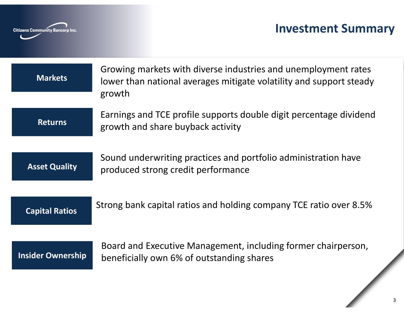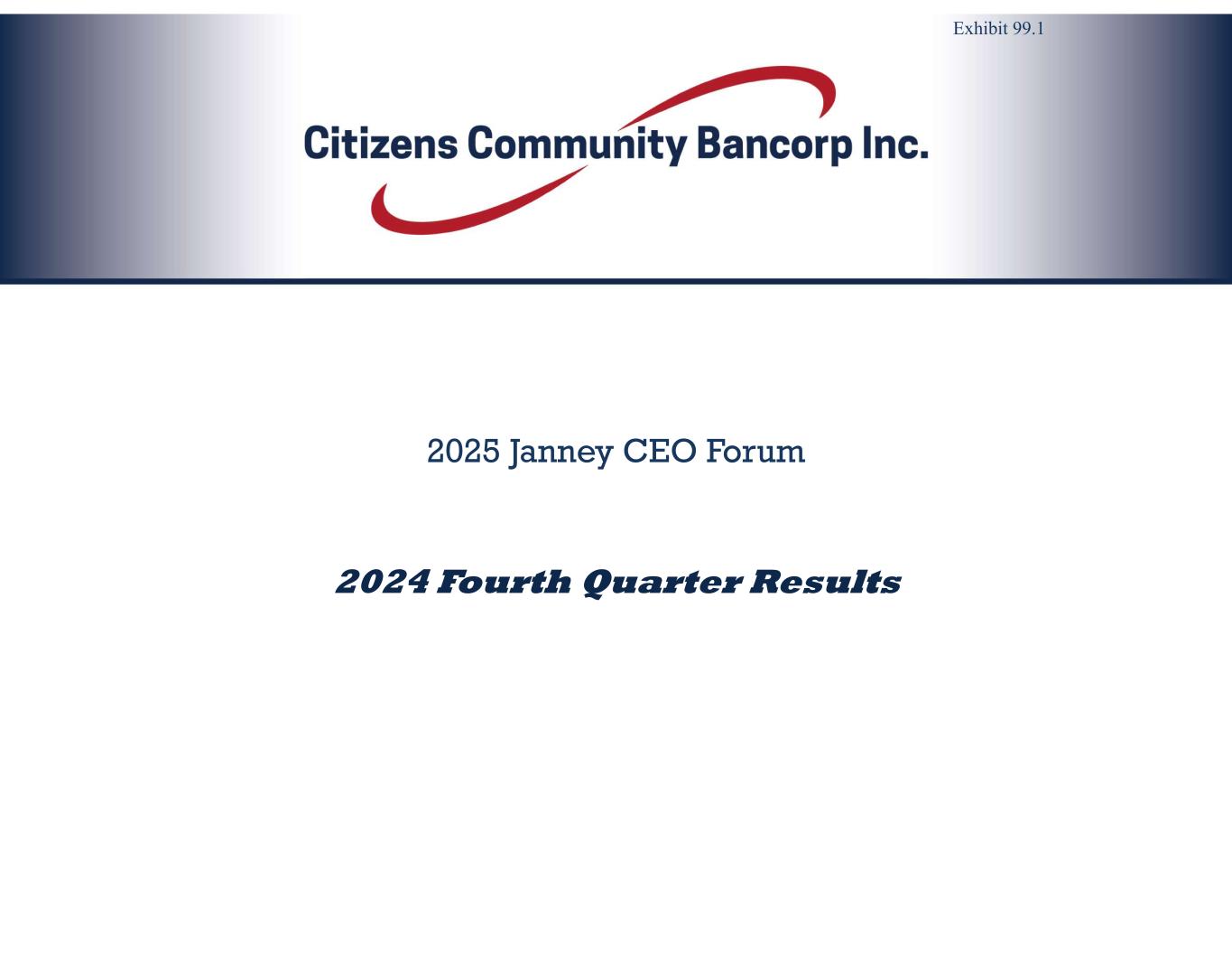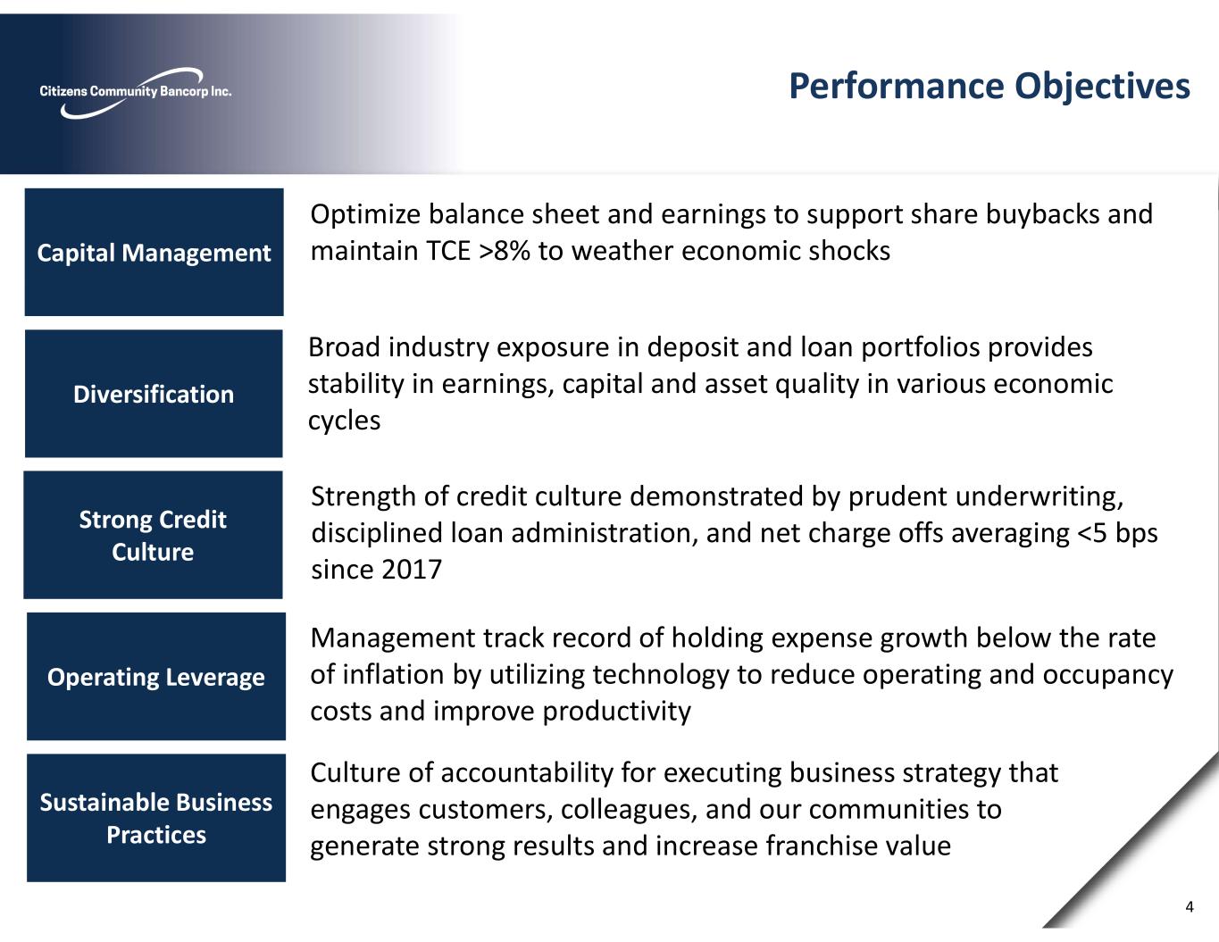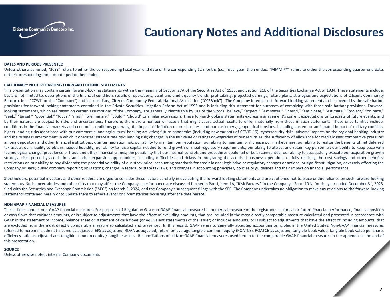 Cautionary Notes and Additional Disclosures 2 DATES AND PERIODS PRESENTED Unless otherwise noted, “20YY” refers to either the corresponding fiscal year-end date or the corresponding 12-months (i.e., fiscal year) then ended. “MMM-YY” refers to either the corresponding quarter-end date, or the corresponding three-month period then ended. CAUTIONARY NOTE REGARDING FORWARD LOOKING STATEMENTS This presentation may contain certain forward-looking statements within the meaning of Section 27A of the Securities Act of 1933, and Section 21E of the Securities Exchange Act of 1934. These statements include, but are not limited to, descriptions of the financial condition, results of operations, asset and credit quality trends, profitability, projected earnings, future plans, strategies and expectations of Citizens Community Bancorp, Inc. (“CZWI” or the “Company”) and its subsidiary, Citizens Community Federal, National Association (“CCFBank”) . The Company intends such forward-looking statements to be covered by the safe harbor provisions for forward-looking statements contained in the Private Securities Litigation Reform Act of 1995 and is including this statement for purposes of complying with those safe harbor provisions. Forward- looking statements, which are based on certain assumptions of the Company, are generally identifiable by use of the words “believe,” “expect,” “estimates,” “intend,” “anticipate,” “estimate,” “project,” “on pace,” “seek,” “target,” “potential,” “focus,” “may,” “preliminary,” “could,” “should” or similar expressions. These forward-looking statements express management’s current expectations or forecasts of future events, and by their nature, are subject to risks and uncertainties. Therefore, there are a number of factors that might cause actual results to differ materially from those in such statements. These uncertainties include: conditions in the financial markets and economic conditions generally; the impact of inflation on our business and our customers; geopolitical tensions, including current or anticipated impact of military conflicts; higher lending risks associated with our commercial and agricultural banking activities; future pandemics (including new variants of COVID-19); cybersecurity risks; adverse impacts on the regional banking industry and the business environment in which it operates; interest rate risk; lending risk; changes in the fair value or ratings downgrades of our securities; the sufficiency of allowance for credit losses; competitive pressures among depository and other financial institutions; disintermediation risk; our ability to maintain our reputation; our ability to maintain or increase our market share; our ability to realize the benefits of net deferred tax assets; our inability to obtain needed liquidity; our ability to raise capital needed to fund growth or meet regulatory requirements; our ability to attract and retain key personnel; our ability to keep pace with technological change; prevalence of fraud and other financial crimes; the possibility that our internal controls and procedures could fail or be circumvented; our ability to successfully execute our acquisition growth strategy; risks posed by acquisitions and other expansion opportunities, including difficulties and delays in integrating the acquired business operations or fully realizing the cost savings and other benefits; restrictions on our ability to pay dividends; the potential volatility of our stock price; accounting standards for credit losses; legislative or regulatory changes or actions, or significant litigation, adversely affecting the Company or Bank; public company reporting obligations; changes in federal or state tax laws; and changes in accounting principles, policies or guidelines and their impact on financial performance. Stockholders, potential investors and other readers are urged to consider these factors carefully in evaluating the forward-looking statements and are cautioned not to place undue reliance on such forward-looking statements. Such uncertainties and other risks that may affect the Company's performance are discussed further in Part I, Item 1A, "Risk Factors," in the Company's Form 10-K, for the year ended December 31, 2023, filed with the Securities and Exchange Commission ("SEC") on March 5, 2024, and the Company's subsequent filings with the SEC. The Company undertakes no obligation to make any revisions to the forward-looking statements contained herein or to update them to reflect events or circumstances occurring after the date hereof. NON-GAAP FINANCIAL MEASURES These slides contain non-GAAP financial measures. For purposes of Regulation G, a non-GAAP financial measure is a numerical measure of the registrant's historical or future financial performance, financial position or cash flows that excludes amounts, or is subject to adjustments that have the effect of excluding amounts, that are included in the most directly comparable measure calculated and presented in accordance with GAAP in the statement of income, balance sheet or statement of cash flows (or equivalent statements) of the issuer; or includes amounts, or is subject to adjustments that have the effect of including amounts, that are excluded from the most directly comparable measure so calculated and presented. In this regard, GAAP refers to generally accepted accounting principles in the United States. Non·GAAP financial measures referred to herein include net income as adjusted, EPS as adjusted, ROAA as adjusted, return on average tangible common equity (ROATCE), ROATCE as adjusted, tangible book value, tangible book value per share, efficiency ratio as adjusted and tangible common equity / tangible assets. Reconciliations of all Non·GAAP financial measures used herein to the comparable GAAP financial measures in the appendix at the end of this presentation. SOURCE Unless otherwise not