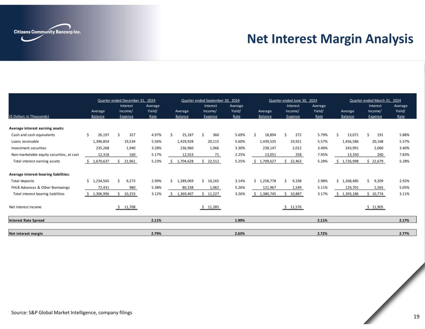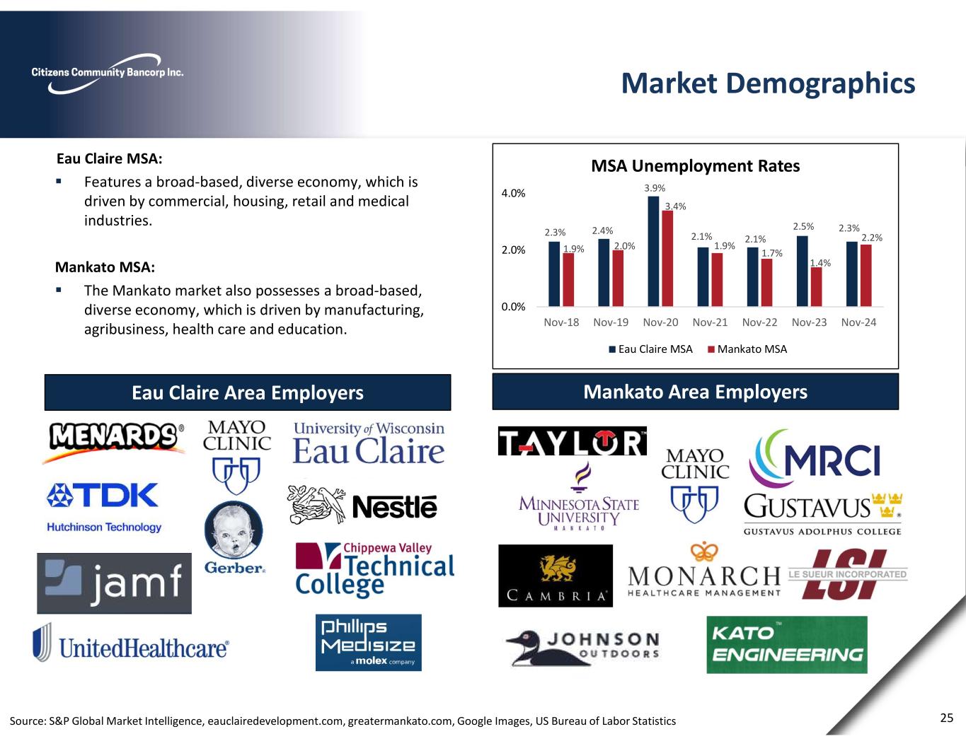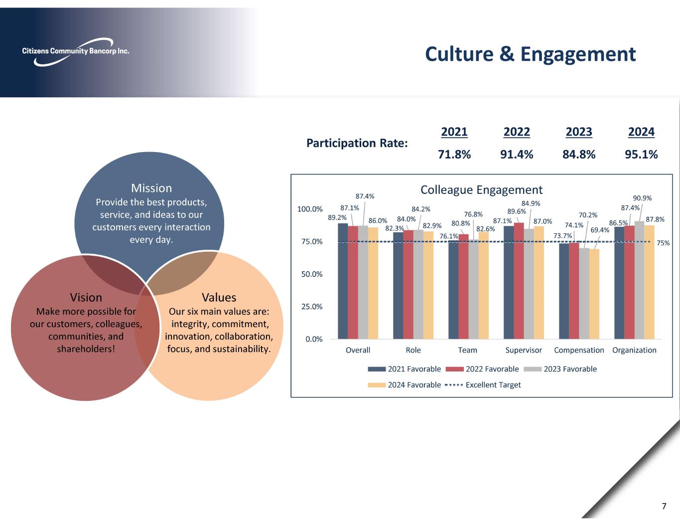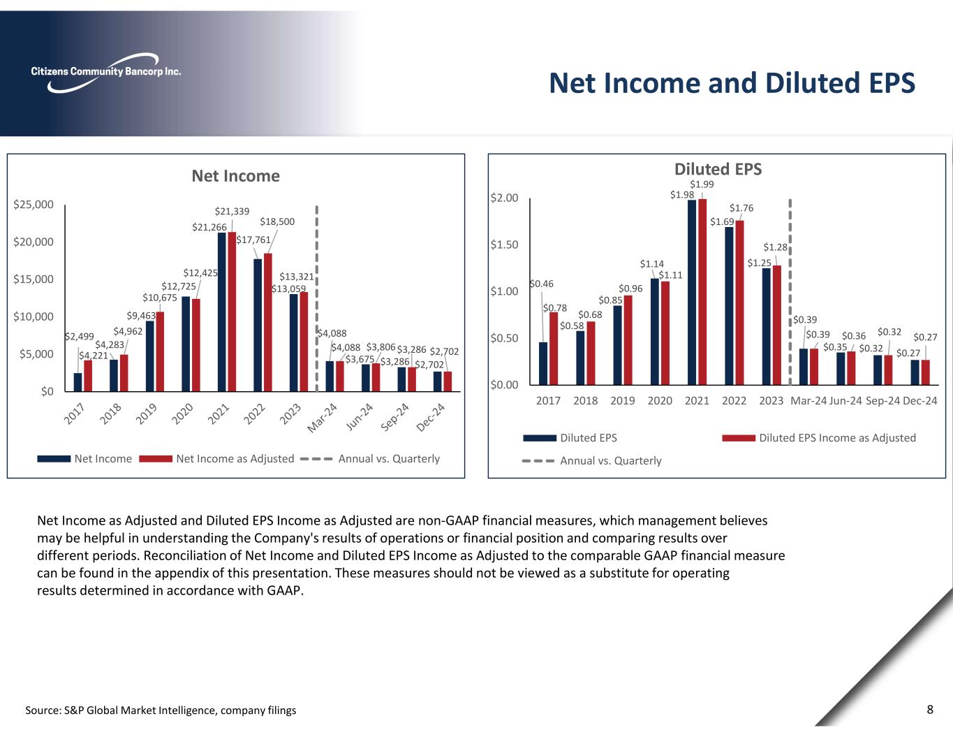 Cautionary Notes and Additional Disclosures 2 DATES AND PERIODS PRESENTED Unless otherwise noted, “20YY” refers to either the corresponding fiscal year-end date or the corresponding 12-months (i.e., fiscal year) then ended. “MMM-YY” refers to either the corresponding quarter-end date, or the corresponding three-month period then ended. CAUTIONARY NOTE REGARDING FORWARD LOOKING STATEMENTS This presentation may contain certain forward-looking statements within the meaning of Section 27A of the Securities Act of 1933, and Section 21E of the Securities Exchange Act of 1934. These statements include, but are not limited to, descriptions of the financial condition, results of operations, asset and credit quality trends, profitability, projected earnings, future plans, strategies and expectations of Citizens Community Bancorp, Inc. (“CZWI” or the “Company”) and its subsidiary, Citizens Community Federal, National Association (“CCFBank”) . The Company intends such forward-looking statements to be covered by the safe harbor provisions for forward-looking statements contained in the Private Securities Litigation Reform Act of 1995 and is including this statement for purposes of complying with those safe harbor provisions. Forward- looking statements, which are based on certain assumptions of the Company, are generally identifiable by use of the words “believe,” “expect,” “estimates,” “intend,” “anticipate,” “estimate,” “project,” “on pace,” “seek,” “target,” “potential,” “focus,” “may,” “preliminary,” “could,” “should” or similar expressions. These forward-looking statements express management’s current expectations or forecasts of future events, and by their nature, are subject to risks and uncertainties. Therefore, there are a number of factors that might cause actual results to differ materially from those in such statements. These uncertainties include: conditions in the financial markets and economic conditions generally; the impact of inflation on our business and our customers; geopolitical tensions, including current or anticipated impact of military conflicts; higher lending risks associated with our commercial and agricultural banking activities; future pandemics (including new variants of COVID-19); cybersecurity risks; adverse impacts on the regional banking industry and the business environment in which it operates; interest rate risk; lending risk; changes in the fair value or ratings downgrades of our securities; the sufficiency of allowance for credit losses; competitive pressures among depository and other financial institutions; disintermediation risk; our ability to maintain our reputation; our ability to maintain or increase our market share; our ability to realize the benefits of net deferred tax assets; our inability to obtain needed liquidity; our ability to raise capital needed to fund growth or meet regulatory requirements; our ability to attract and retain key personnel; our ability to keep pace with technological change; prevalence of fraud and other financial crimes; the possibility that our internal controls and procedures could fail or be circumvented; our ability to successfully execute our acquisition growth strategy; risks posed by acquisitions and other expansion opportunities, including difficulties and delays in integrating the acquired business operations or fully realizing the cost savings and other benefits; restrictions on our ability to pay dividends; the potential volatility of our stock price; accounting standards for credit losses; legislative or regulatory changes or actions, or significant litigation, adversely affecting the Company or Bank; public company reporting obligations; changes in federal or state tax laws; and changes in accounting principles, policies or guidelines and their impact on financial performance. Stockholders, potential investors and other readers are urged to consider these factors carefully in evaluating the forward-looking statements and are cautioned not to place undue reliance on such forward-looking statements. Such uncertainties and other risks that may affect the Company's performance are discussed further in Part I, Item 1A, "Risk Factors," in the Company's Form 10-K, for the year ended December 31, 2023, filed with the Securities and Exchange Commission ("SEC") on March 5, 2024, and the Company's subsequent filings with the SEC. The Company undertakes no obligation to make any revisions to the forward-looking statements contained herein or to update them to reflect events or circumstances occurring after the date hereof. NON-GAAP FINANCIAL MEASURES These slides contain non-GAAP financial measures. For purposes of Regulation G, a non-GAAP financial measure is a numerical measure of the registrant's historical or future financial performance, financial position or cash flows that excludes amounts, or is subject to adjustments that have the effect of excluding amounts, that are included in the most directly comparable measure calculated and presented in accordance with GAAP in the statement of income, balance sheet or statement of cash flows (or equivalent statements) of the issuer; or includes amounts, or is subject to adjustments that have the effect of including amounts, that are excluded from the most directly comparable measure so calculated and presented. In this regard, GAAP refers to generally accepted accounting principles in the United States. Non·GAAP financial measures referred to herein include net income as adjusted, EPS as adjusted, ROAA as adjusted, return on average tangible common equity (ROATCE), ROATCE as adjusted, tangible book value, tangible book value per share, efficiency ratio as adjusted and tangible common equity / tangible assets. Reconciliations of all Non·GAAP financial measures used herein to the comparable GAAP financial measures in the appendix at the end of this presentation. SOURCE Unless otherwise not