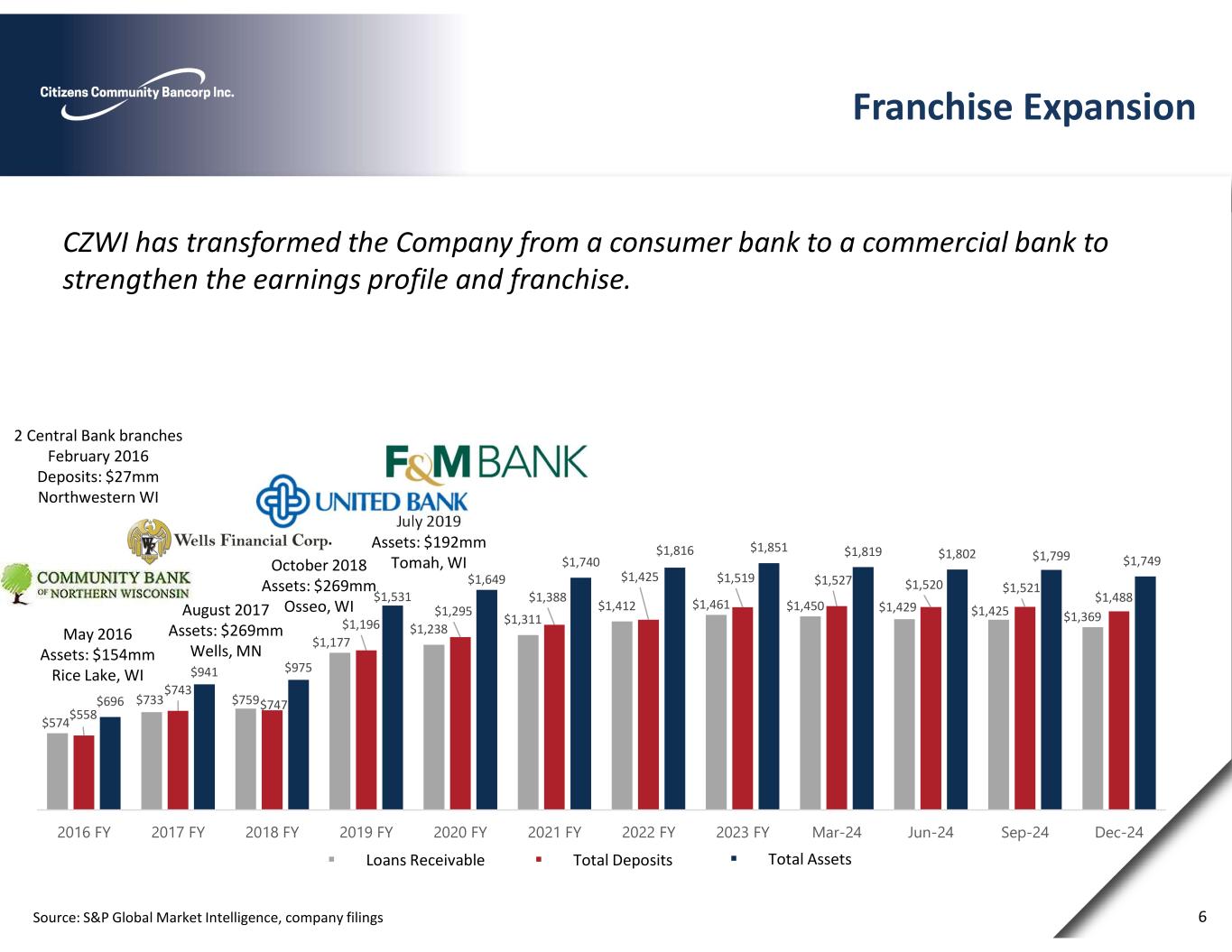 Operating Market Overview CZWI Operates in diverse markets within the northwestern region of Wisconsin, metro Twin Cities and the Mankato, Minnesota MSA Source: S&P Global Market Intelligence 0 0 0 0 0 5