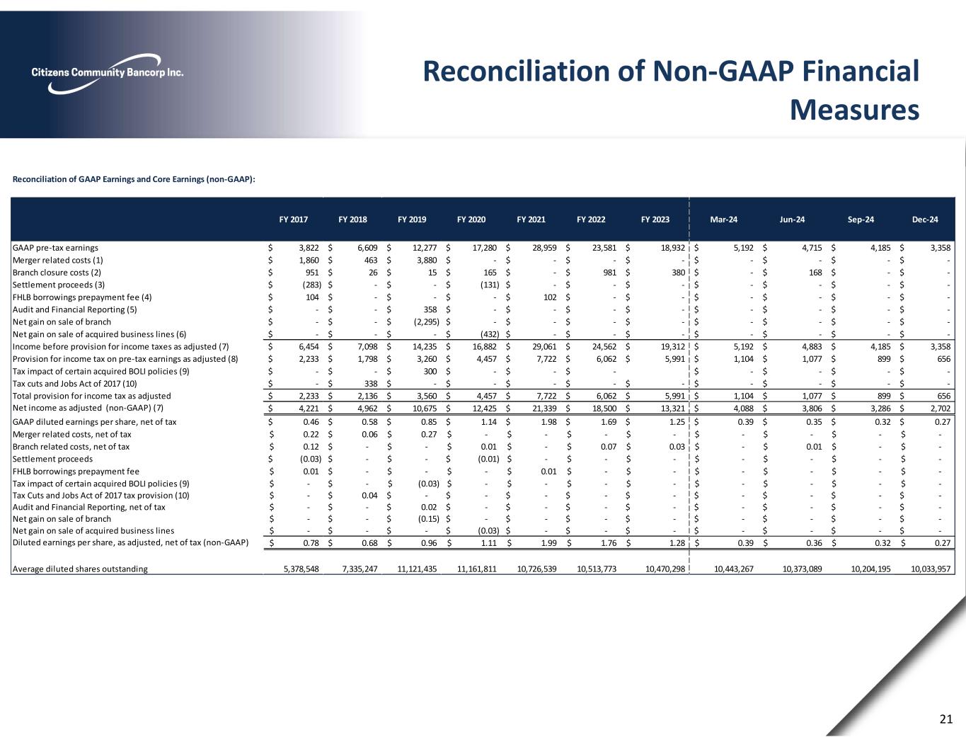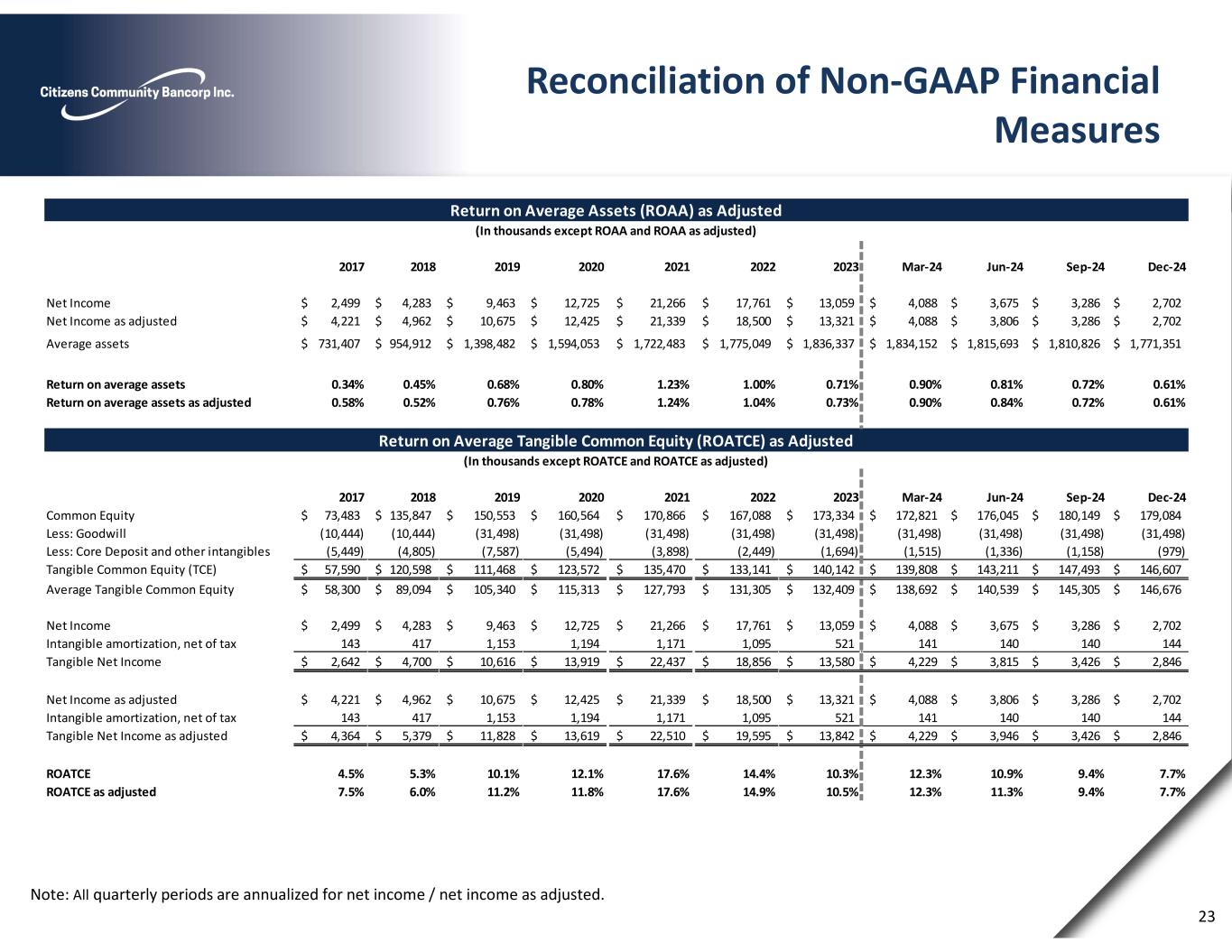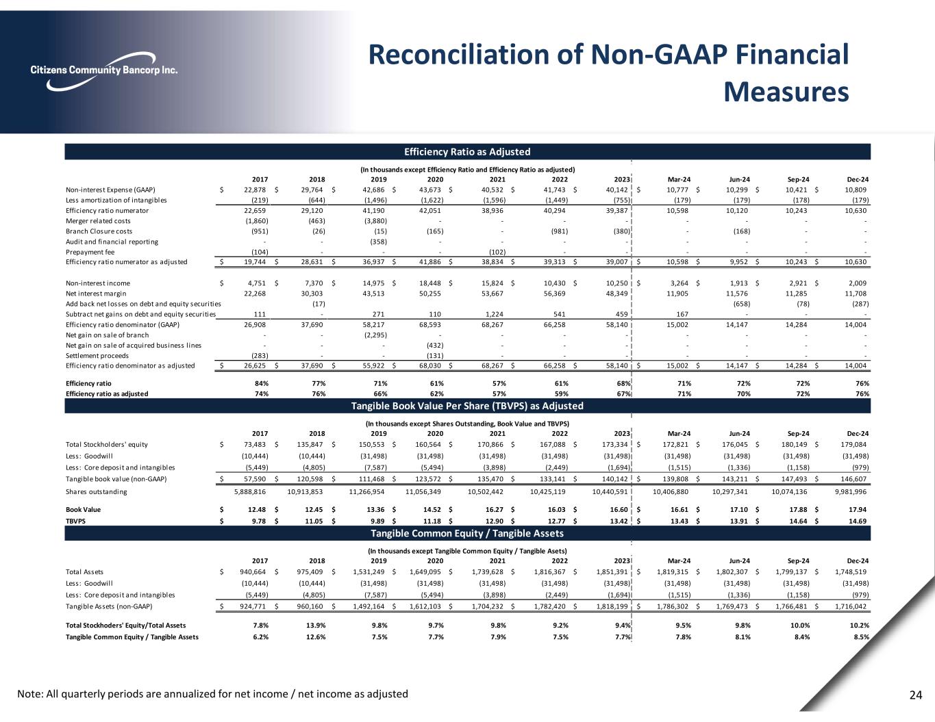 Reconciliation of Non-GAAP Financial Measures Note: All quarterly periods are annualized for net income / net income as adjusted 24 2017 2018 2019 2020 2021 2022 2023 Mar-24 Jun-24 Sep-24 Dec-24 Non-interest Expense (GAAP) 22,878$ 29,764$ 42,686$ 43,673$ 40,532$ 41,743$ 40,142$ 10,777$ 10,299$ 10,421$ 10,809$ Less amortization of intangibles (219) (644) (1,496) (1,622) (1,596) (1,449) (755) (179) (179) (178) (179) Efficiency ratio numerator 22,659 29,120 41,190 42,051 38,936 40,294 39,387 10,598 10,120 10,243 10,630 Merger related costs (1,860) (463) (3,880) - - - - - - - - Branch Closure costs (951) (26) (15) (165) - (981) (380) - (168) - - Audit and financial reporting - - (358) - - - - - - - - Prepayment fee (104) - - - (102) - - - - - - Efficiency ratio numerator as adjusted 19,744$ 28,631$ 36,937$ 41,886$ 38,834$ 39,313$ 39,007$ 10,598$ 9,952$ 10,243$ 10,630$ Non-interest income 4,751$ 7,370$ 14,975$ 18,448$ 15,824$ 10,430$ 10,250$ 3,264$ 1,913$ 2,921$ 2,009$ Net interest margin 22,268 30,303 43,513 50,255 53,667 56,369 48,349 11,905 11,576 11,285 11,708 Add back net losses on debt and equity securities (17) (658) (78) (287) Subtract net gains on debt and equity securities 111 - 271 110 1,224 541 459 167 - - - Efficiency ratio denominator (GAAP) 26,908 37,690 58,217 68,593 68,267 66,258 58,140 15,002 14,147 14,284 14,004 Net gain on sale of branch - - (2,295) - - - - - - - - Net gain on sale of acquired business l ines - - - (432) - - - - - - - Settlement proceeds (283) - - (131) - - - - - - - Efficiency ratio denominator as adjusted 26,625$ 37,690$ 55,922$ 68,030$ 68,267$ 66,258$ 58,140$ 15,002$ 14,147$ 14,284$ 14,004$ Efficiency ratio 84% 77% 71% 61% 57% 61% 68% 71% 72% 72% 76% Efficiency ratio as adjusted 74% 76% 66% 62% 57% 59% 67% 71% 70% 72% 76% 2017 2018 2019 2020 2021 2022 2023 Mar-24 Jun-24 Sep-24 Dec-24 Total Stockholders' equity 73,483$ 135,847$ 150,553$ 160,564$ 170,866$ 167,088$ 173,334$ 172,821$ 176,045$ 180,149$ 179,084$ Less: Goodwil l (10,444) (10,444) (31,498) (31,498) (31,498) (31,498) (31,498) (31,498) (31,498) (31,498) (31,498) Less: Core deposit and intangibles (5,449) (4,805) (7,587) (5,494) (3,898) (2,449) (1,694) (1,515) (1,336) (1,158) (979) Tangible book value (non-GAAP) 57,590$ 120,598$ 111,468$ 123,572$ 135,470$ 133,141$ 140,142$ 139,808$ 143,211$ 147,493$ 146,607$ Shares outstanding 5,888,816 10,913,853 11,266,954 11,056,349 10,502,442 10,425,119 10,440,591 10,406,880 10,297,341 10,074,136 9,981,996 Book Value 12.48$ 12.45$ 13.36$ 14.52$ 16.27$ 16.03$ 16.60$ 16.61$ 17.10$ 17.88$ 17.94$ TBVPS 9.78$ 11.05$ 9.89$ 11.18$ 12.90$ 12.77$ 13.42$ 13.43$ 13.91$ 14.64$ 14.69$ 2017 2018 2019 2020 2021 2022 2023 Mar-24 Jun-24 Sep-24 Dec-24 Total Assets 940,664$ 975,409$ 1,531,249$ 1,649,095$ 1,739,628$ 1,816,367$ 1,851,391$ 1,819,315$ 1,802,307$ 1,799,137$ 1,748,519$ Less: Goodwil l (10,444) (10,444) (31,498) (31,498) (31,498) (31,498) (31,498) (31,498) (31,498) (31,498) (31,498) Less: Core deposit and intangibles (5,449) (4,805) (7,587) (5,494) (3,898) (2,449) (1,694) (1,515) (1,336) (1,158) (979) Tangible Assets (non-GAAP) 924,771$ 960,160$ 1,492,164$ 1,612,103$ 1,704,232$ 1,782,420$ 1,818,199$ 1,786,302$ 1,769,473$ 1,766,481$ 1,716,042$ Total Stockhoders' Equity/Total Assets 7.8% 13.9% 9.8% 9.7% 9.8% 9.2% 9.4% 9.5% 9.8% 10.0% 10.2% Tangible Common Equity / Tangible Assets 6.2% 12.6% 7.5% 7.7% 7.9% 7.5% 7.7% 7.8% 8.1% 8.4% 8.5% (In thousands except Tangible Common Equity / Tangible Asets) Efficiency Ratio as Adjusted Tangible Book Value Per Share (TBVPS) as Adjusted Tangible Common Equity / Tangible Assets (In thousands except Shares Outstanding, Book Value and TBVPS) (In thousands except Efficiency Ratio and Efficiency Ratio as adjusted)
