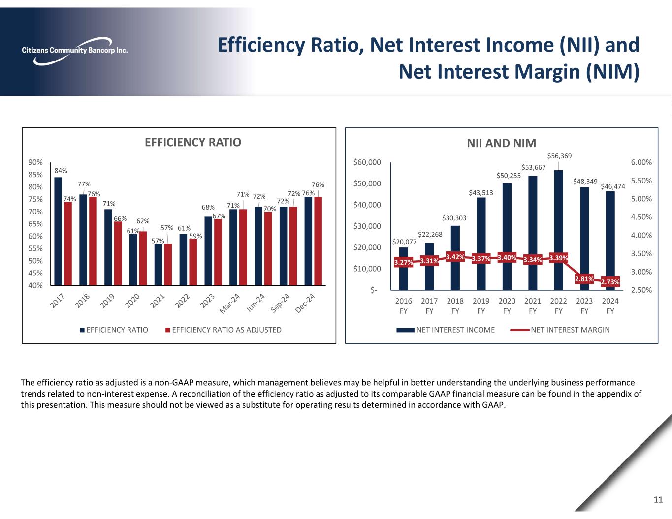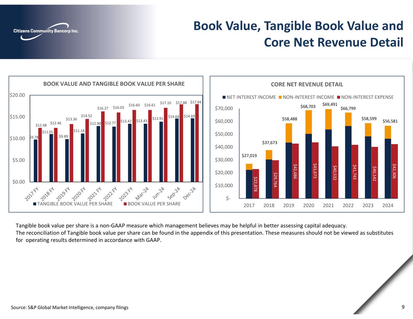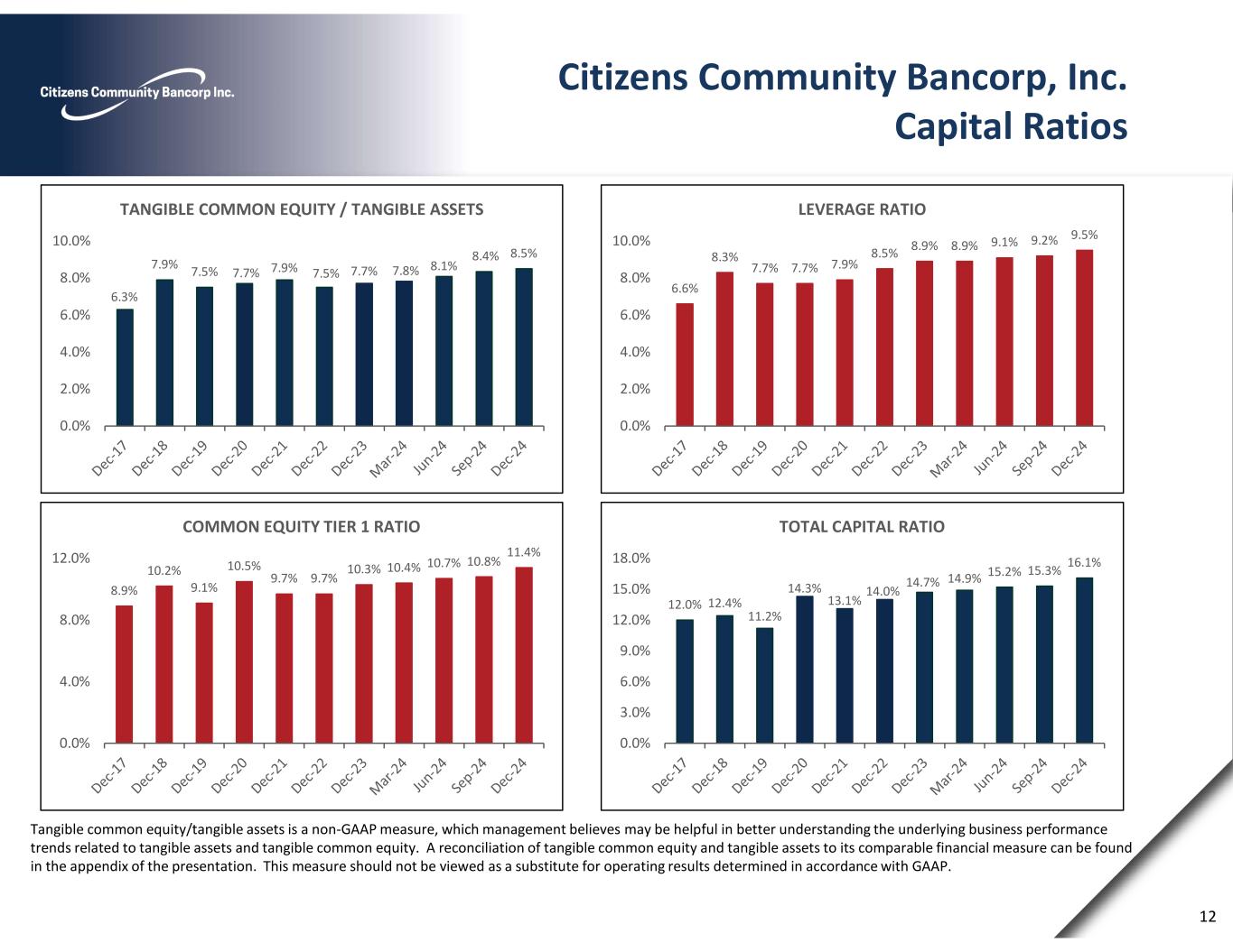 Reconciliation of Non-GAAP Financial Measures Note: All quarterly periods are annualized for net income / net income as adjusted 24 2017 2018 2019 2020 2021 2022 2023 Mar-24 Jun-24 Sep-24 Dec-24 Non-interest Expense (GAAP) 22,878$ 29,764$ 42,686$ 43,673$ 40,532$ 41,743$ 40,142$ 10,777$ 10,299$ 10,421$ 10,809$ Less amortization of intangibles (219) (644) (1,496) (1,622) (1,596) (1,449) (755) (179) (179) (178) (179) Efficiency ratio numerator 22,659 29,120 41,190 42,051 38,936 40,294 39,387 10,598 10,120 10,243 10,630 Merger related costs (1,860) (463) (3,880) - - - - - - - - Branch Closure costs (951) (26) (15) (165) - (981) (380) - (168) - - Audit and financial reporting - - (358) - - - - - - - - Prepayment fee (104) - - - (102) - - - - - - Efficiency ratio numerator as adjusted 19,744$ 28,631$ 36,937$ 41,886$ 38,834$ 39,313$ 39,007$ 10,598$ 9,952$ 10,243$ 10,630$ Non-interest income 4,751$ 7,370$ 14,975$ 18,448$ 15,824$ 10,430$ 10,250$ 3,264$ 1,913$ 2,921$ 2,009$ Net interest margin 22,268 30,303 43,513 50,255 53,667 56,369 48,349 11,905 11,576 11,285 11,708 Add back net losses on debt and equity securities (17) (658) (78) (287) Subtract net gains on debt and equity securities 111 - 271 110 1,224 541 459 167 - - - Efficiency ratio denominator (GAAP) 26,908 37,690 58,217 68,593 68,267 66,258 58,140 15,002 14,147 14,284 14,004 Net gain on sale of branch - - (2,295) - - - - - - - - Net gain on sale of acquired business l ines - - - (432) - - - - - - - Settlement proceeds (283) - - (131) - - - - - - - Efficiency ratio denominator as adjusted 26,625$ 37,690$ 55,922$ 68,030$ 68,267$ 66,258$ 58,140$ 15,002$ 14,147$ 14,284$ 14,004$ Efficiency ratio 84% 77% 71% 61% 57% 61% 68% 71% 72% 72% 76% Efficiency ratio as adjusted 74% 76% 66% 62% 57% 59% 67% 71% 70% 72% 76% 2017 2018 2019 2020 2021 2022 2023 Mar-24 Jun-24 Sep-24 Dec-24 Total Stockholders' equity 73,483$ 135,847$ 150,553$ 160,564$ 170,866$ 167,088$ 173,334$ 172,821$ 176,045$ 180,149$ 179,084$ Less: Goodwil l (10,444) (10,444) (31,498) (31,498) (31,498) (31,498) (31,498) (31,498) (31,498) (31,498) (31,498) Less: Core deposit and intangibles (5,449) (4,805) (7,587) (5,494) (3,898) (2,449) (1,694) (1,515) (1,336) (1,158) (979) Tangible book value (non-GAAP) 57,590$ 120,598$ 111,468$ 123,572$ 135,470$ 133,141$ 140,142$ 139,808$ 143,211$ 147,493$ 146,607$ Shares outstanding 5,888,816 10,913,853 11,266,954 11,056,349 10,502,442 10,425,119 10,440,591 10,406,880 10,297,341 10,074,136 9,981,996 Book Value 12.48$ 12.45$ 13.36$ 14.52$ 16.27$ 16.03$ 16.60$ 16.61$ 17.10$ 17.88$ 17.94$ TBVPS 9.78$ 11.05$ 9.89$ 11.18$ 12.90$ 12.77$ 13.42$ 13.43$ 13.91$ 14.64$ 14.69$ 2017 2018 2019 2020 2021 2022 2023 Mar-24 Jun-24 Sep-24 Dec-24 Total Assets 940,664$ 975,409$ 1,531,249$ 1,649,095$ 1,739,628$ 1,816,367$ 1,851,391$ 1,819,315$ 1,802,307$ 1,799,137$ 1,748,519$ Less: Goodwil l (10,444) (10,444) (31,498) (31,498) (31,498) (31,498) (31,498) (31,498) (31,498) (31,498) (31,498) Less: Core deposit and intangibles (5,449) (4,805) (7,587) (5,494) (3,898) (2,449) (1,694) (1,515) (1,336) (1,158) (979) Tangible Assets (non-GAAP) 924,771$ 960,160$ 1,492,164$ 1,612,103$ 1,704,232$ 1,782,420$ 1,818,199$ 1,786,302$ 1,769,473$ 1,766,481$ 1,716,042$ Total Stockhoders' Equity/Total Assets 7.8% 13.9% 9.8% 9.7% 9.8% 9.2% 9.4% 9.5% 9.8% 10.0% 10.2% Tangible Common Equity / Tangible Assets 6.2% 12.6% 7.5% 7.7% 7.9% 7.5% 7.7% 7.8% 8.1% 8.4% 8.5% (In thousands except Tangible Common Equity / Tangible Asets) Efficiency Ratio as Adjusted Tangible Book Value Per Share (TBVPS) as Adjusted Tangible Common Equity / Tangible Assets (In thousands except Shares Outstanding, Book Value and TBVPS) (In thousands except Efficiency Ratio and Efficiency Ratio as adjusted)