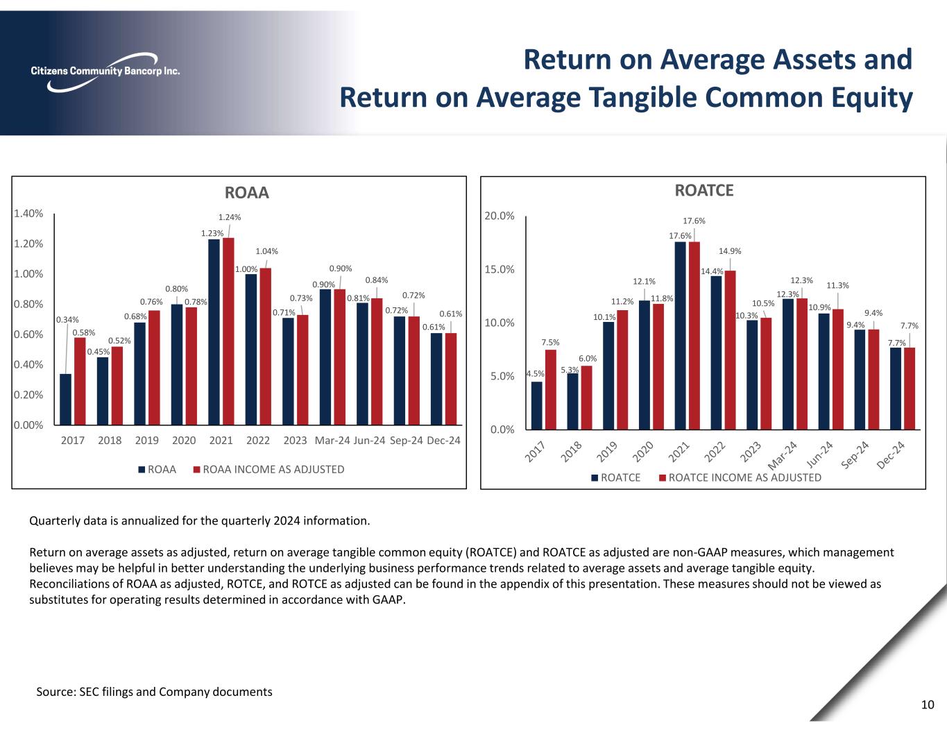Book Value, Tangible Book Value and Core Net Revenue Detail Source: S&P Global Market Intelligence, company filings Tangible book value per share is a non-GAAP measure which management believes may be helpful in better assessing capital adequacy. The reconciliation of Tangible book value per share can be found in the appendix of this presentation. These measures should not be viewed as substitutes for operating results determined in accordance with GAAP. 9 $9.78 $11.05 $9.89 $11.18 $12.90 $12.77 $13.42 $13.43 $13.91 $14.64 $14.69 $12.48 $12.46 $13.36 $14.52 $16.27 $16.03 $16.60 $16.61 $17.10 $17.88 $17.94 $0.00 $5.00 $10.00 $15.00 $20.00 BOOK VALUE AND TANGIBLE BOOK VALUE PER SHARE TANGIBLE BOOK VALUE PER SHARE BOOK VALUE PER SHARE $22,878 $29,764 $42,686 $43,673 $40,532 $41,743 $40,142 $42,306 $- $10,000 $20,000 $30,000 $40,000 $50,000 $60,000 $70,000 2017 2018 2019 2020 2021 2022 2023 2024 CORE NET REVENUE DETAIL NET INTEREST INCOME NON-INTEREST INCOME NON-INTEREST EXPENSE $58,488 $68,703 $69,491 $56,581$58,599 $27,019 $37,673 $66,799