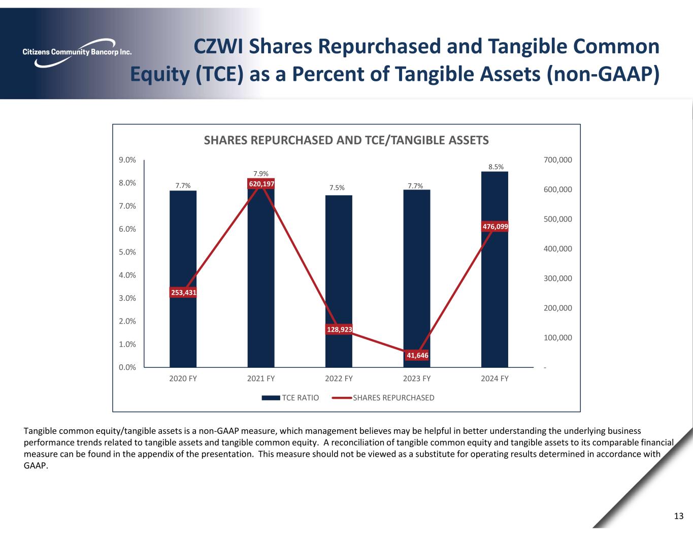 Citizens Community Bancorp, Inc. Capital Ratios 12 6.6% 8.3% 7.7% 7.7% 7.9% 8.5% 8.9% 8.9% 9.1% 9.2% 9.5% 0.0% 2.0% 4.0% 6.0% 8.0% 10.0% LEVERAGE RATIO 8.9% 10.2% 9.1% 10.5% 9.7% 9.7% 10.3% 10.4% 10.7% 10.8% 11.4% 0.0% 4.0% 8.0% 12.0% COMMON EQUITY TIER 1 RATIO 12.0% 12.4% 11.2% 14.3% 13.1% 14.0% 14.7% 14.9% 15.2% 15.3% 16.1% 0.0% 3.0% 6.0% 9.0% 12.0% 15.0% 18.0% TOTAL CAPITAL RATIO Tangible common equity/tangible assets is a non-GAAP measure, which management believes may be helpful in better understanding the underlying business performance trends related to tangible assets and tangible common equity. A reconciliation of tangible common equity and tangible assets to its comparable financial measure can be found in the appendix of the presentation. This measure should not be viewed as a substitute for operating results determined in accordance with GAAP. 6.3% 7.9% 7.5% 7.7% 7.9% 7.5% 7.7% 7.8% 8.1% 8.4% 8.5% 0.0% 2.0% 4.0% 6.0% 8.0% 10.0% TANGIBLE COMMON EQUITY / TANGIBLE ASSETS