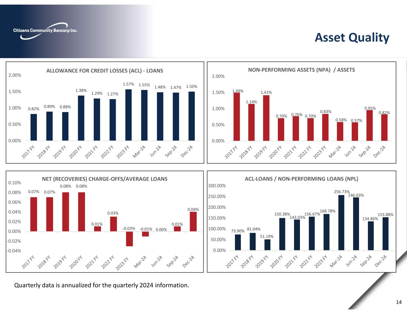 CZWI Shares Repurchased and Tangible Common Equity (TCE) as a Percent of Tangible Assets (non-GAAP) Tangible common equity/tangible assets is a non-GAAP measure, which management believes may be helpful in better understanding the underlying business performance trends related to tangible assets and tangible common equity. A reconciliation of tangible common equity and tangible assets to its comparable financial measure can be found in the appendix of the presentation. This measure should not be viewed as a substitute for operating results determined in accordance with GAAP. 13 7.7% 7.9% 7.5% 7.7% 8.5% 253,431 620,197 128,923 41,646 476,099 - 100,000 200,000 300,000 400,000 500,000 600,000 700,000 0.0% 1.0% 2.0% 3.0% 4.0% 5.0% 6.0% 7.0% 8.0% 9.0% 2020 FY 2021 FY 2022 FY 2023 FY 2024 FY SHARES REPURCHASED AND TCE/TANGIBLE ASSETS TCE RATIO SHARES REPURCHASED