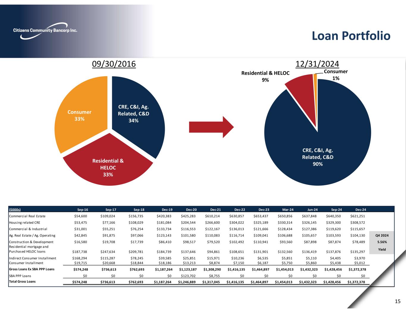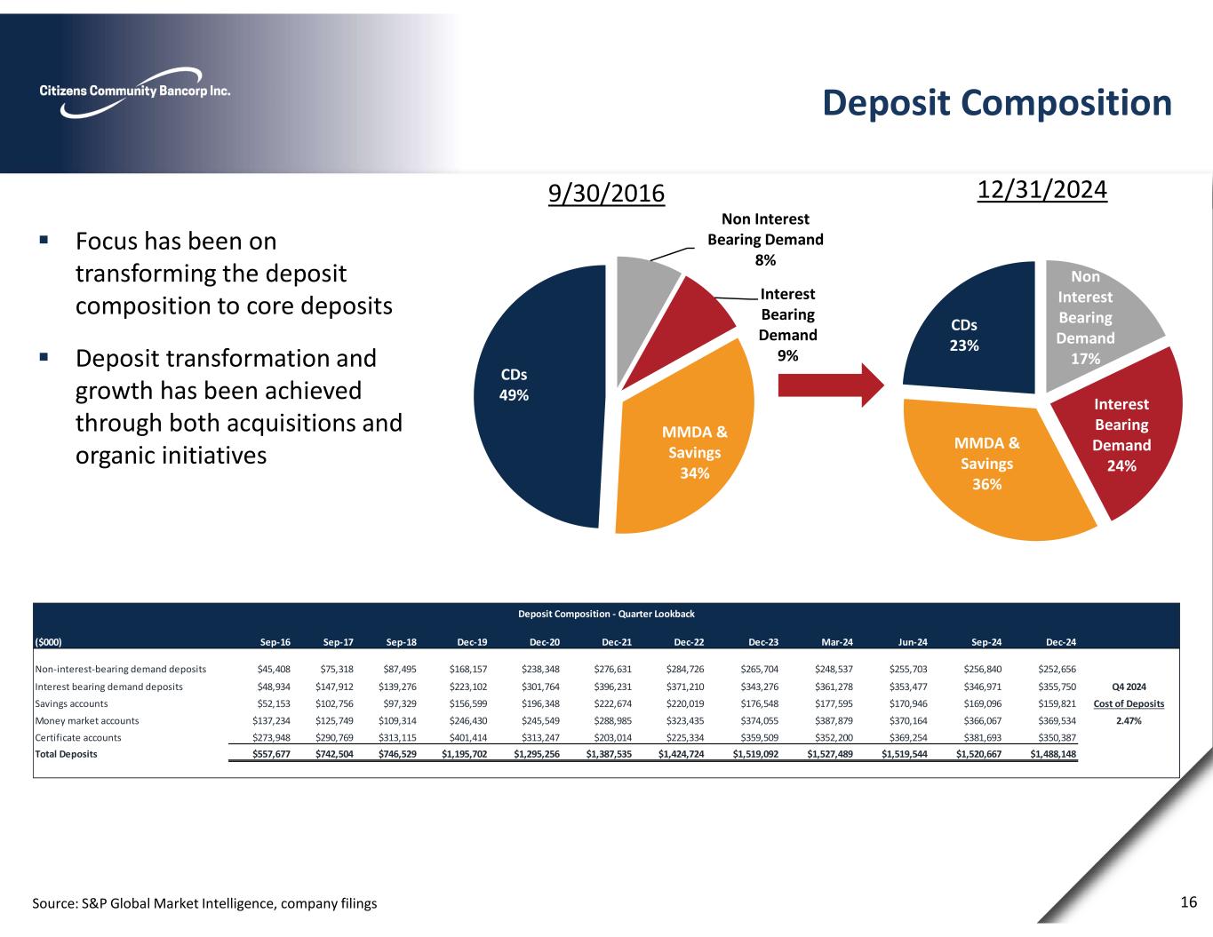 CRE, C&I, Ag. Related, C&D 90% Residential & HELOC 9% Consumer 1% Loan Portfolio 09/30/2016 12/31/2024 CRE, C&I, Ag. Related, C&D 34% Residential & HELOC 33% Consumer 33% 15 ($000s) Sep-16 Sep-17 Sep-18 Dec-19 Dec-20 Dec-21 Dec-22 Dec-23 Mar-24 Jun-24 Sep-24 Dec-24 Commercial Real Estate $54,600 $109,024 $156,735 $420,383 $425,283 $610,214 $630,857 $653,437 $650,856 $637,848 $640,350 $621,251 Housing related CRE $53,475 $77,166 $108,029 $181,084 $204,544 $266,600 $304,022 $325,189 $330,314 $326,145 $329,300 $308,572 Commercial & Industrial $31,001 $55,251 $76,254 $133,734 $116,553 $122,167 $136,013 $121,666 $128,434 $127,386 $119,620 $115,657 Ag. Real Estate / Ag. Operating $42,845 $91,875 $97,066 $123,143 $101,580 $110,083 $116,714 $109,041 $106,688 $105,657 $103,593 $104,130 Q4 2024 Construction & Development $16,580 $19,708 $17,739 $86,410 $98,517 $79,520 $102,492 $110,941 $93,560 $87,898 $87,874 $78,489 5.56% Residential mortgage and Purchased HELOC loans $187,738 $247,634 $209,781 $184,739 $137,646 $94,861 $108,651 $131,901 $132,560 $136,419 $137,876 $135,297 Yield Indirect Consumer Installment $168,294 $115,287 $78,245 $39,585 $25,851 $15,971 $10,236 $6,535 $5,851 $5,110 $4,405 $3,970 Consumer Installment $19,715 $20,668 $18,844 $18,186 $13,213 $8,874 $7,150 $6,187 $5,750 $5,860 $5,438 $5,012 Gross Loans Ex SBA PPP Loans $574,248 $736,613 $762,693 $1,187,264 $1,123,187 $1,308,290 $1,416,135 $1,464,897 $1,454,013 $1,432,323 $1,428,456 $1,372,378 SBA PPP Loans $0 $0 $0 $0 $123,702 $8,755 $0 $0 $0 $0 $0 $0 Total Gross Loans $574,248 $736,613 $762,693 $1,187,264 $1,246,889 $1,317,045 $1,416,135 $1,464,897 $1,454,013 $1,432,323 $1,428,456 $1,372,378