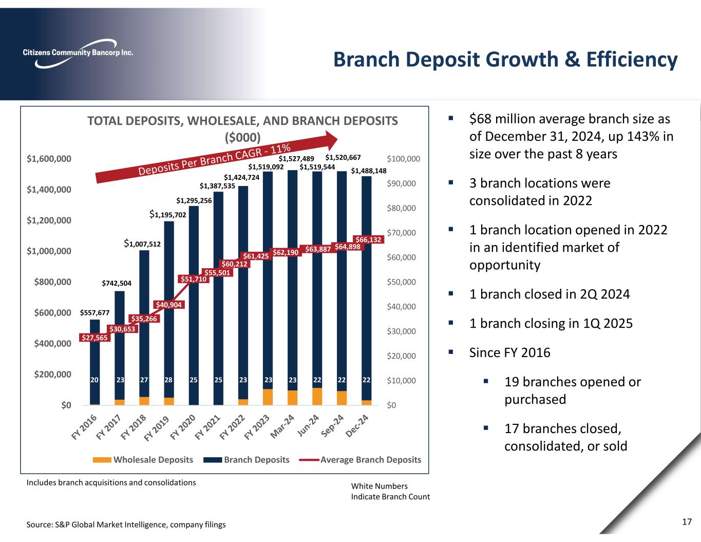 $27,565 $30,653 $35,266 $40,904 $51,710 $55,501 $60,212 $61,425 $62,190 $63,887 $64,898 $66,132 $0 $10,000 $20,000 $30,000 $40,000 $50,000 $60,000 $70,000 $80,000 $90,000 $100,000 $0 $200,000 $400,000 $600,000 $800,000 $1,000,000 $1,200,000 $1,400,000 $1,600,000 TOTAL DEPOSITS, WHOLESALE, AND BRANCH DEPOSITS ($000) Wholesale Deposits Branch Deposits Average Branch Deposits 23 27 28 25 25 23 23 23 22 22 $557,677 $742,504 $1,007,512 $1,195,702 $1,295,256 $1,519,092 $1,520,667 $1,488,148 Branch Deposit Growth & Efficiency $68 million average branch size as of December 31, 2024, up 143% in size over the past 8 years 3 branch locations were consolidated in 2022 1 branch location opened in 2022 in an identified market of opportunity 1 branch closed in 2Q 2024 1 branch closing in 1Q 2025 Since FY 2016 19 branches opened or purchased 17 branches closed, consolidated, or sold Includes branch acquisitions and consolidations Source: S&P Global Market Intelligence, company filings 17 20 White Numbers Indicate Branch Count 22 $1,387,535 $1,424,724 $1,527,489 $1,519,544