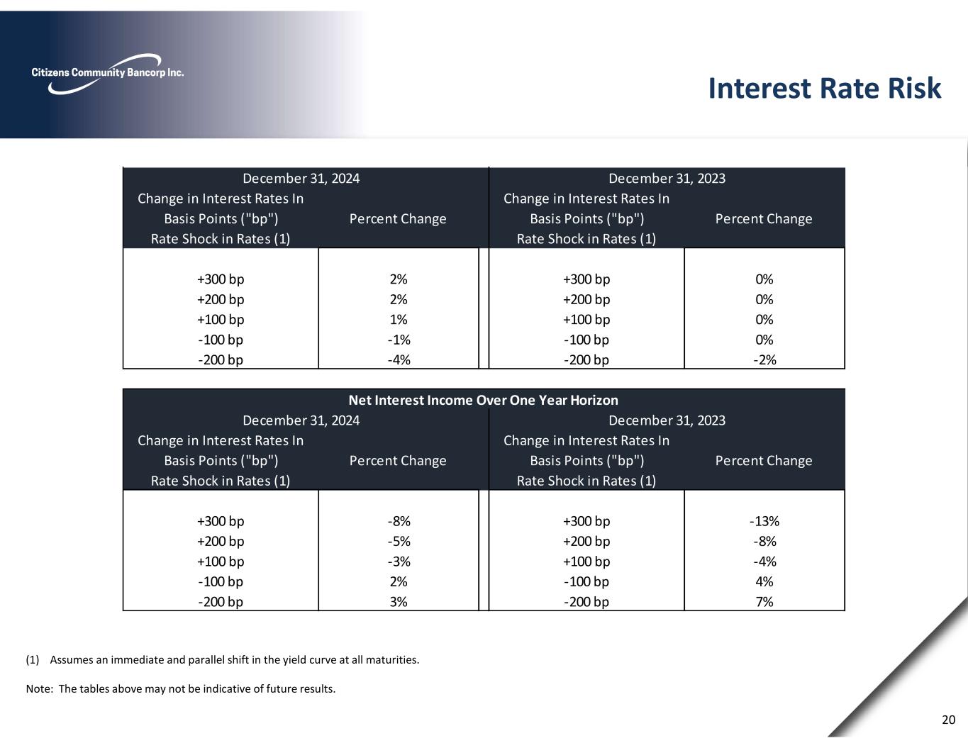 Interest Rate Risk 20 (1) Assumes an immediate and parallel shift in the yield curve at all maturities. Note: The tables above may not be indicative of future results. Change in Interest Rates In Basis Points ("bp") Rate Shock in Rates (1) Percent Change Change in Interest Rates In Basis Points ("bp") Rate Shock in Rates (1) Percent Change +300 bp 2% +300 bp 0% +200 bp 2% +200 bp 0% +100 bp 1% +100 bp 0% -100 bp -1% -100 bp 0% -200 bp -4% -200 bp -2% Change in Interest Rates In Basis Points ("bp") Rate Shock in Rates (1) Percent Change Change in Interest Rates In Basis Points ("bp") Rate Shock in Rates (1) Percent Change +300 bp -8% +300 bp -13% +200 bp -5% +200 bp -8% +100 bp -3% +100 bp -4% -100 bp 2% -100 bp 4% -200 bp 3% -200 bp 7% December 31, 2023December 31, 2024 December 31, 2023December 31, 2024 Net Interest Income Over One Year Horizon