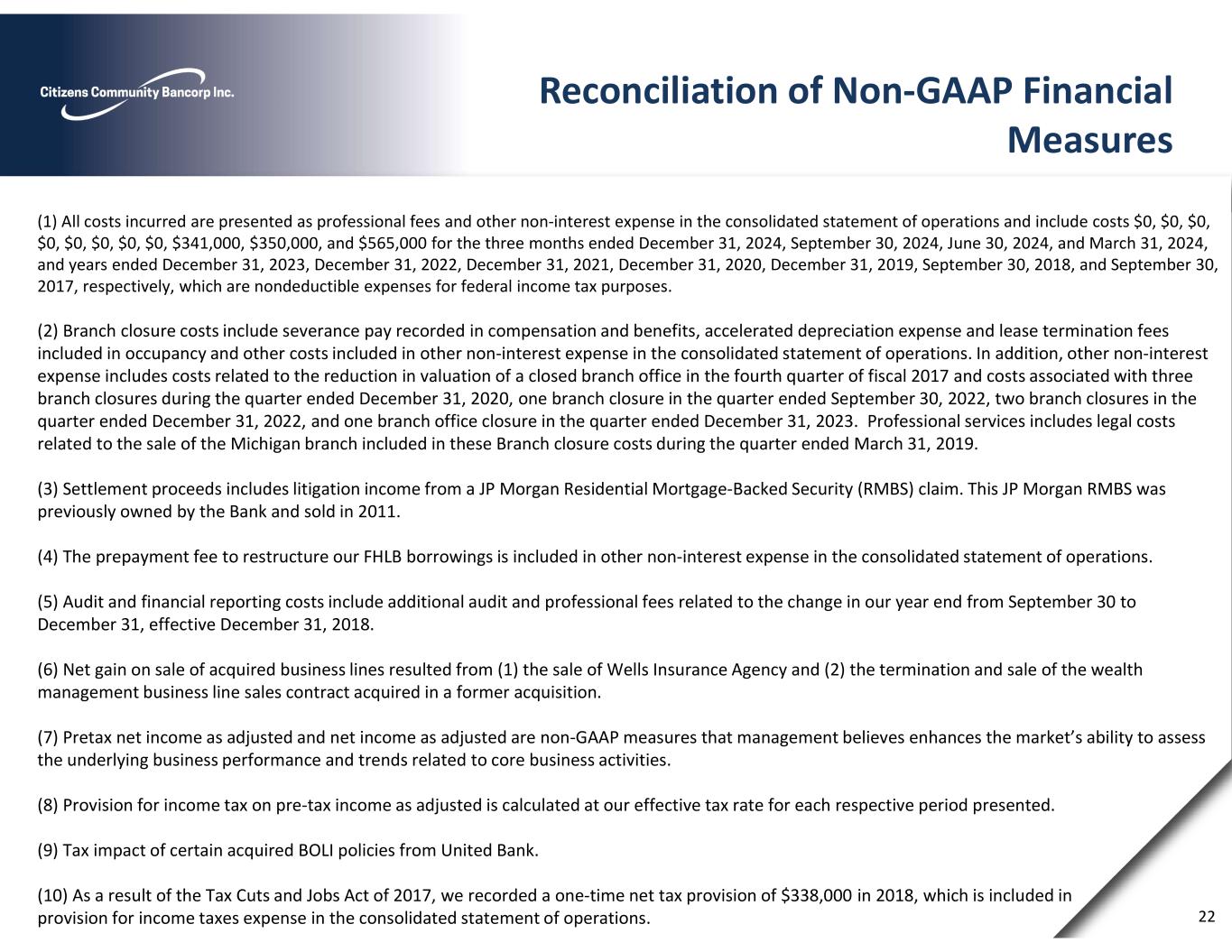 (1) All costs incurred are presented as professional fees and other non-interest expense in the consolidated statement of operations and include costs $0, $0, $0, $0, $0, $0, $0, $0, $341,000, $350,000, and $565,000 for the three months ended December 31, 2024, September 30, 2024, June 30, 2024, and March 31, 2024, and years ended December 31, 2023, December 31, 2022, December 31, 2021, December 31, 2020, December 31, 2019, September 30, 2018, and September 30, 2017, respectively, which are nondeductible expenses for federal income tax purposes. (2) Branch closure costs include severance pay recorded in compensation and benefits, accelerated depreciation expense and lease termination fees included in occupancy and other costs included in other non-interest expense in the consolidated statement of operations. In addition, other non-interest expense includes costs related to the reduction in valuation of a closed branch office in the fourth quarter of fiscal 2017 and costs associated with three branch closures during the quarter ended December 31, 2020, one branch closure in the quarter ended September 30, 2022, two branch closures in the quarter ended December 31, 2022, and one branch office closure in the quarter ended December 31, 2023. Professional services includes legal costs related to the sale of the Michigan branch included in these Branch closure costs during the quarter ended March 31, 2019. (3) Settlement proceeds includes litigation income from a JP Morgan Residential Mortgage-Backed Security (RMBS) claim. This JP Morgan RMBS was previously owned by the Bank and sold in 2011. (4) The prepayment fee to restructure our FHLB borrowings is included in other non-interest expense in the consolidated statement of operations. (5) Audit and financial reporting costs include additional audit and professional fees related to the change in our year end from September 30 to December 31, effective December 31, 2018. (6) Net gain on sale of acquired business lines resulted from (1) the sale of Wells Insurance Agency and (2) the termination and sale of the wealth management business line sales contract acquired in a former acquisition. (7) Pretax net income as adjusted and net income as adjusted are non-GAAP measures that management believes enhances the market’s ability to assess the underlying business performance and trends related to core business activities. (8) Provision for income tax on pre-tax income as adjusted is calculated at our effective tax rate for each respective period presented. (9) Tax impact of certain acquired BOLI policies from United Bank. (10) As a result of the Tax Cuts and Jobs Act of 2017, we recorded a one-time net tax provision of $338,000 in 2018, which is included in provision for income taxes expense in the consolidated statement of operations. 22 Reconciliation of Non-GAAP Financial Measures