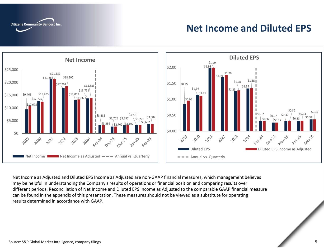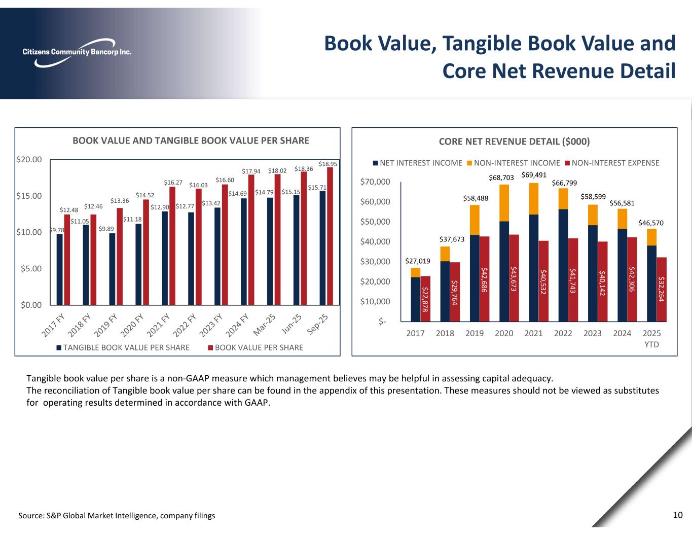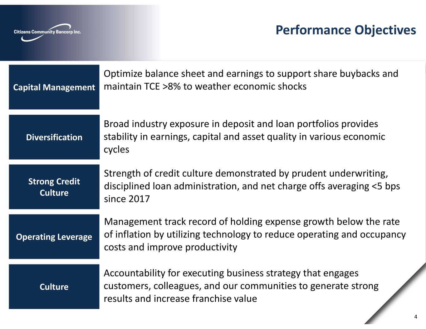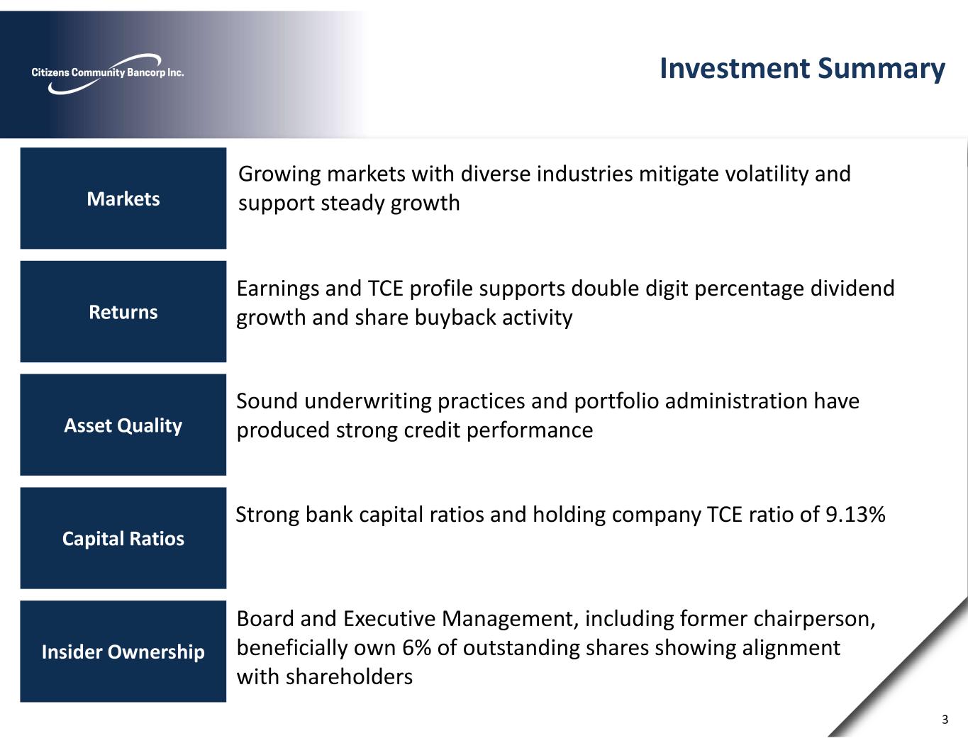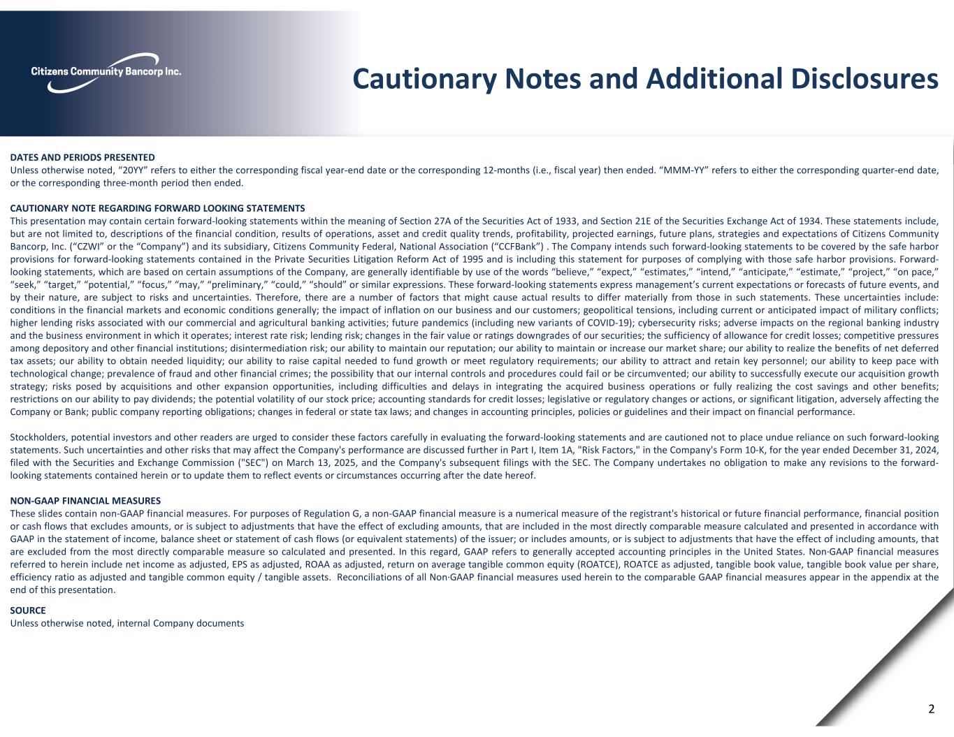 Cautionary Notes and Additional Disclosures 2 DATES AND PERIODS PRESENTED Unless otherwise noted, “20YY” refers to either the corresponding fiscal year-end date or the corresponding 12-months (i.e., fiscal year) then ended. “MMM-YY” refers to either the corresponding quarter-end date, or the corresponding three-month period then ended. CAUTIONARY NOTE REGARDING FORWARD LOOKING STATEMENTS This presentation may contain certain forward-looking statements within the meaning of Section 27A of the Securities Act of 1933, and Section 21E of the Securities Exchange Act of 1934. These statements include, but are not limited to, descriptions of the financial condition, results of operations, asset and credit quality trends, profitability, projected earnings, future plans, strategies and expectations of Citizens Community Bancorp, Inc. (“CZWI” or the “Company”) and its subsidiary, Citizens Community Federal, National Association (“CCFBank”) . The Company intends such forward-looking statements to be covered by the safe harbor provisions for forward-looking statements contained in the Private Securities Litigation Reform Act of 1995 and is including this statement for purposes of complying with those safe harbor provisions. Forward- looking statements, which are based on certain assumptions of the Company, are generally identifiable by use of the words “believe,” “expect,” “estimates,” “intend,” “anticipate,” “estimate,” “project,” “on pace,” “seek,” “target,” “potential,” “focus,” “may,” “preliminary,” “could,” “should” or similar expressions. These forward-looking statements express management’s current expectations or forecasts of future events, and by their nature, are subject to risks and uncertainties. Therefore, there are a number of factors that might cause actual results to differ materially from those in such statements. These uncertainties include: conditions in the financial markets and economic conditions generally; the impact of inflation on our business and our customers; geopolitical tensions, including current or anticipated impact of military conflicts; higher lending risks associated with our commercial and agricultural banking activities; future pandemics (including new variants of COVID-19); cybersecurity risks; adverse impacts on the regional banking industry and the business environment in which it operates; interest rate risk; lending risk; changes in the fair value or ratings downgrades of our securities; the sufficiency of allowance for credit losses; competitive pressures among depository and other financial institutions; disintermediation risk; our ability to maintain our reputation; our ability to maintain or increase our market share; our ability to realize the benefits of net deferred tax assets; our ability to obtain needed liquidity; our ability to raise capital needed to fund growth or meet regulatory requirements; our ability to attract and retain key personnel; our ability to keep pace with technological change; prevalence of fraud and other financial crimes; the possibility that our internal controls and procedures could fail or be circumvented; our ability to successfully execute our acquisition growth strategy; risks posed by acquisitions and other expansion opportunities, including difficulties and delays in integrating the acquired business operations or fully realizing the cost savings and other benefits; restrictions on our ability to pay dividends; the potential volatility of our stock price; accounting standards for credit losses; legislative or regulatory changes or actions, or significant litigation, adversely affecting the Company or Bank; public company reporting obligations; changes in federal or state tax laws; and changes in accounting principles, policies or guidelines and their impact on financial performance. Stockholders, potential investors and other readers are urged to consider these factors carefully in evaluating the forward-looking statements and are cautioned not to place undue reliance on such forward-looking statements. Such uncertainties and other risks that may affect the Company's performance are discussed further in Part I, Item 1A, "Risk Factors," in the Company's Form 10-K, for the year ended December 31, 2024, filed with the Securities and Exchange Commission ("SEC") on March 13, 2025, and the Company's subsequent filings with the SEC. The Company undertakes no obligation to make any revisions to the forward- looking statements contained herein or to update them to reflect events or circumstances occurring after the date hereof. NON-GAAP FINANCIAL MEASURES These slides contain non-GAAP financial measures. For purposes of Regulation G, a non-GAAP financial measure is a numerical measure of the registrant's historical or future financial performance, financial position or cash flows that excludes amounts, or is subject to adjustments that have the effect of excluding amounts, that are included in the most directly comparable measure calculated and presented in accordance with GAAP in the statement of income, balance sheet or statement of cash flows (or equivalent statements) of the issuer; or includes amounts, or is subject to adjustments that have the effect of including amounts, that are excluded from the most directly comparable measure so calculated and presented. In this regard, GAAP refers to generally accepted accounting principles in the United States. Non·GAAP financial measures referred to herein include net income as adjusted, EPS as adjusted, ROAA as adjusted, return on average tangible common equity (ROATCE), ROATCE as adjusted, tangible book value, tangible book value per share, efficiency ratio as adjusted and tangible common equity / tangible assets. Reconciliations of all Non·GAAP financial measures used herein to the comparable GAAP financial measures appear in the appendix at the end of this presentation. SOURCE Unless otherw