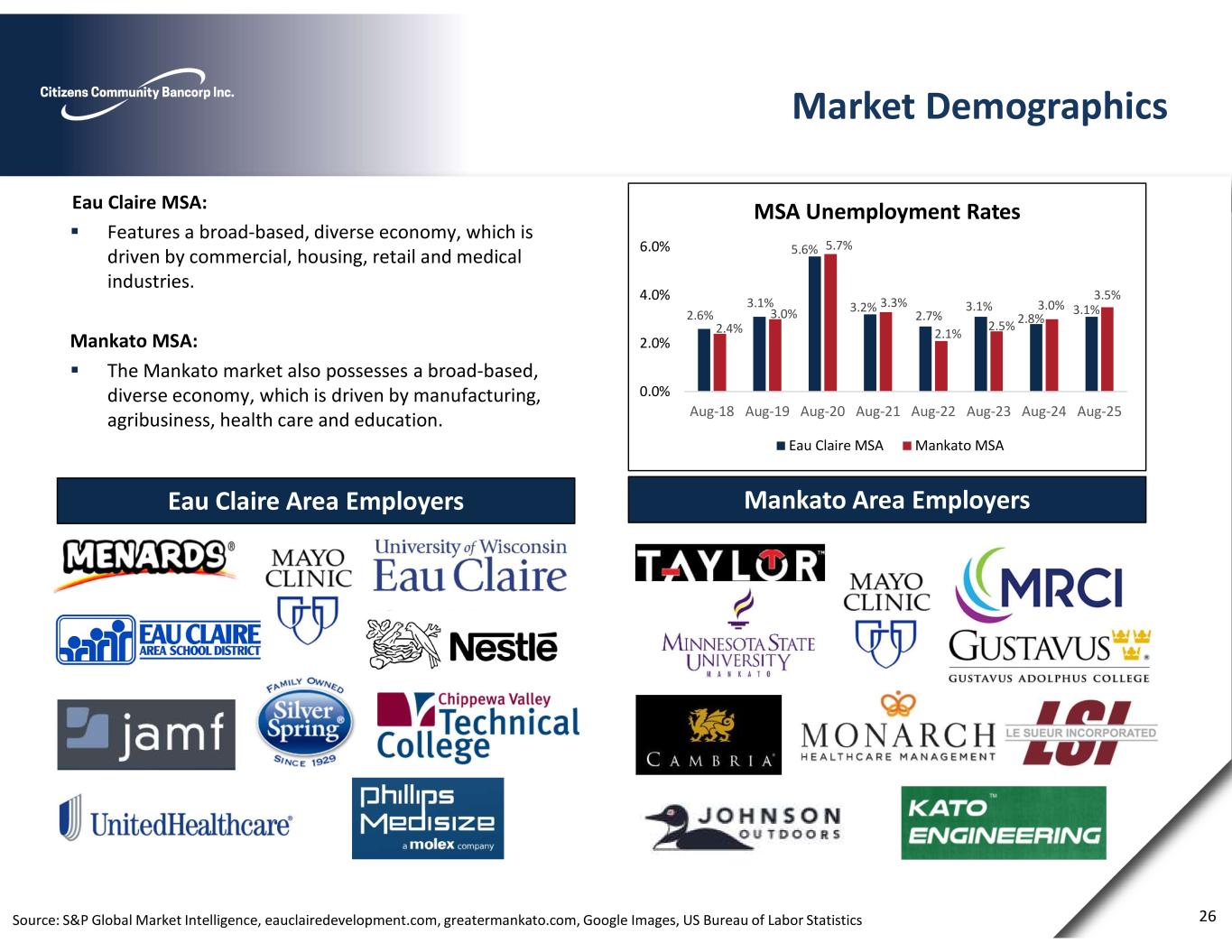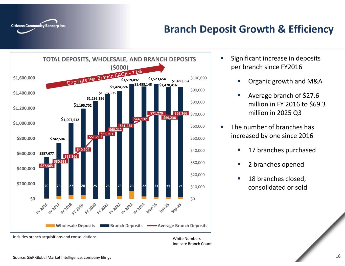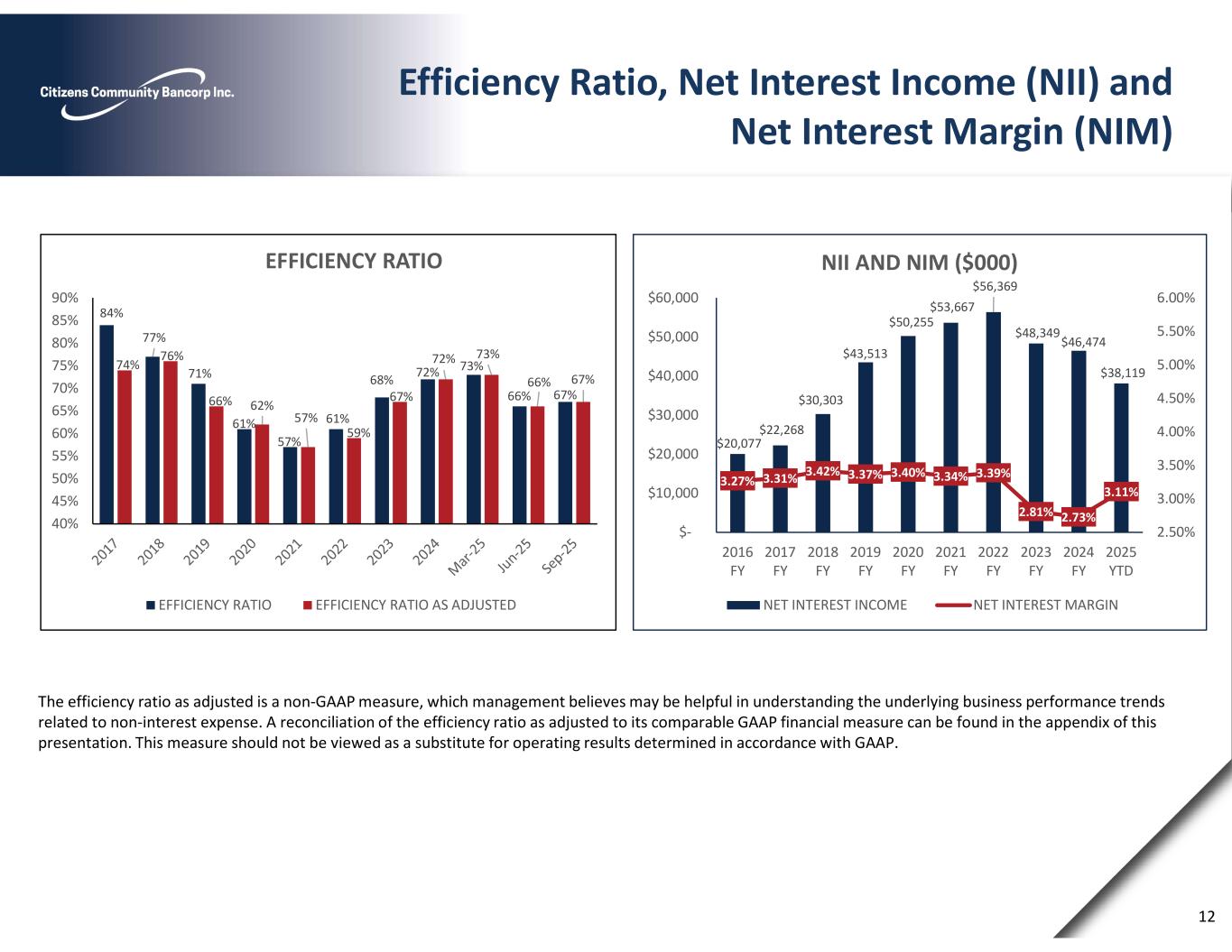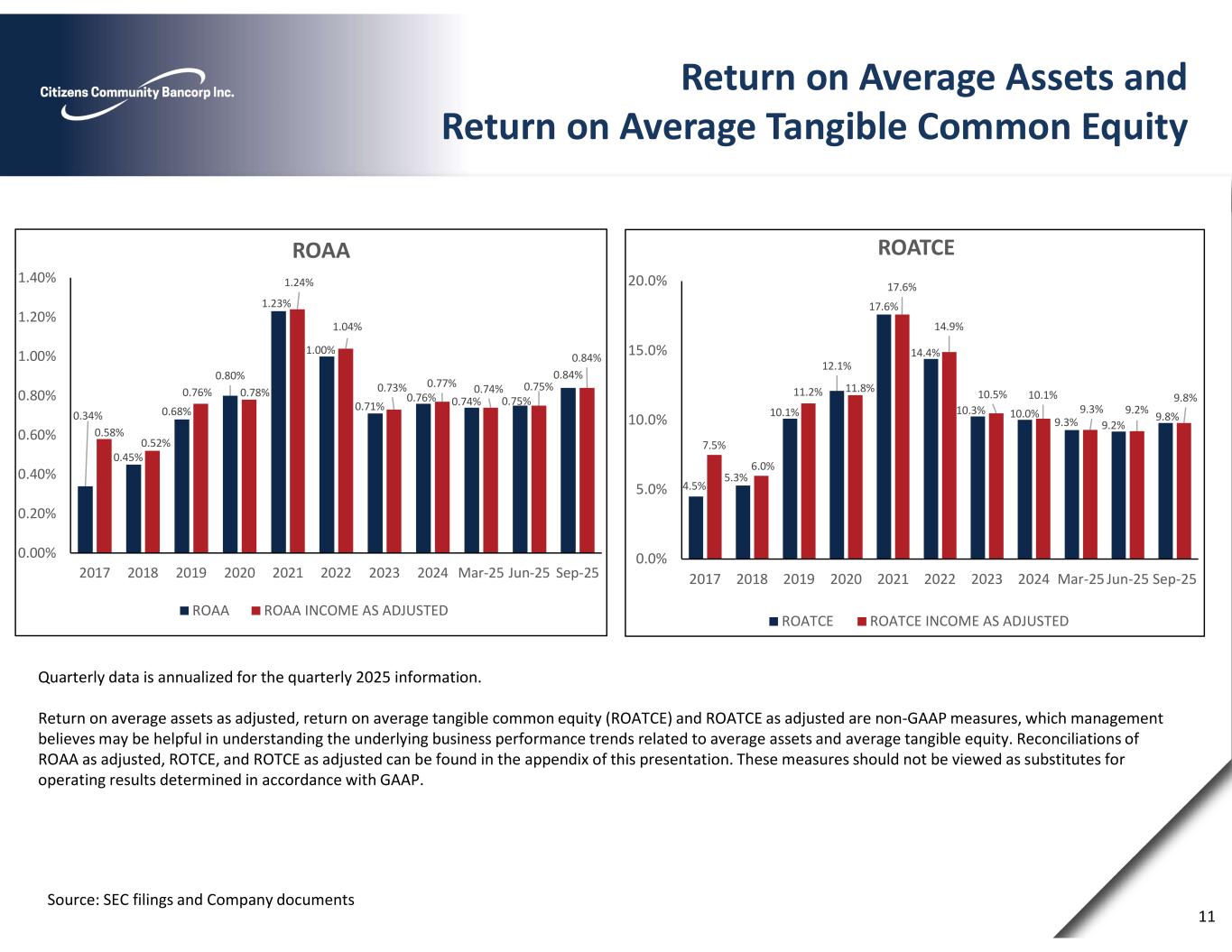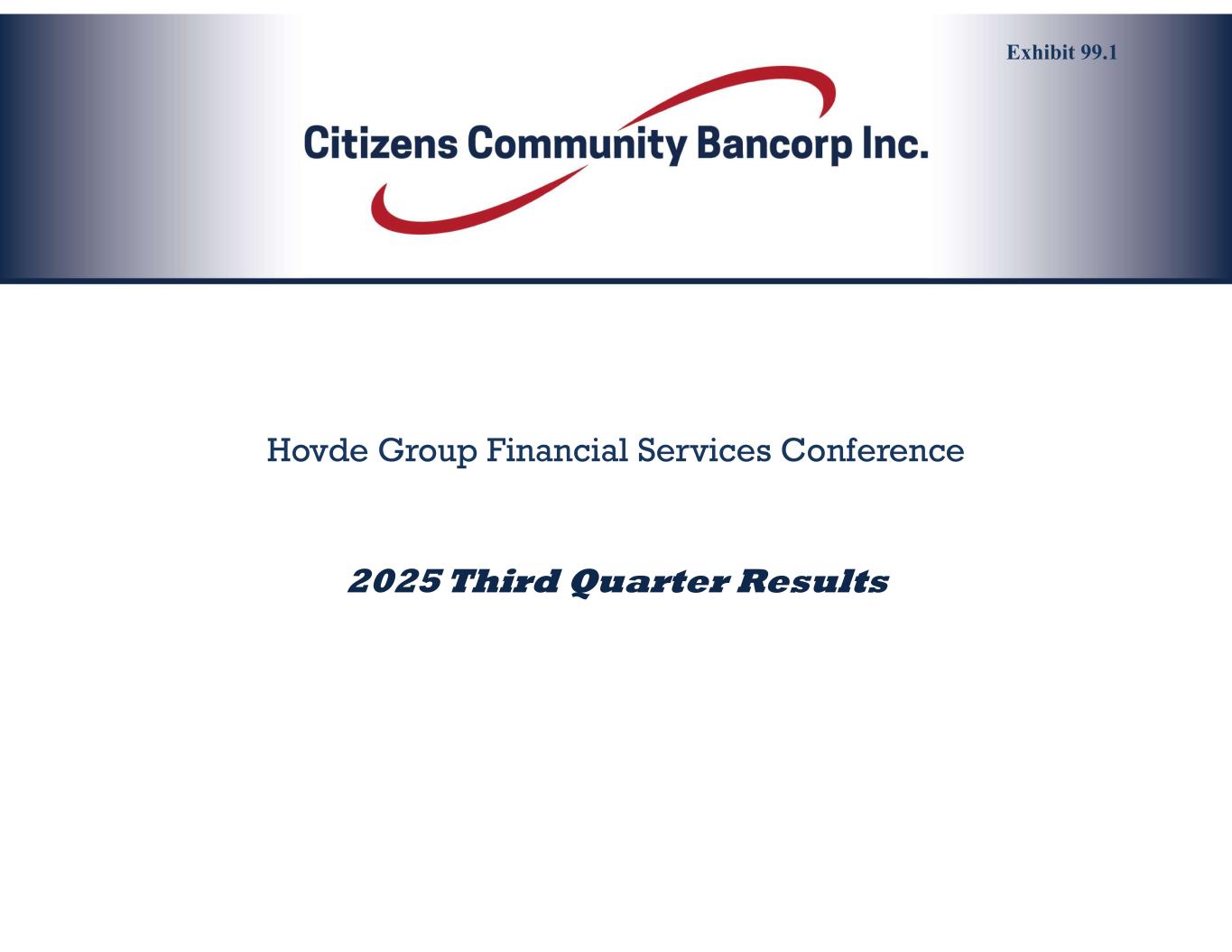 Cautionary Notes and Additional Disclosures 2 DATES AND PERIODS PRESENTED Unless otherwise noted, “20YY” refers to either the corresponding fiscal year-end date or the corresponding 12-months (i.e., fiscal year) then ended. “MMM-YY” refers to either the corresponding quarter-end date, or the corresponding three-month period then ended. CAUTIONARY NOTE REGARDING FORWARD LOOKING STATEMENTS This presentation may contain certain forward-looking statements within the meaning of Section 27A of the Securities Act of 1933, and Section 21E of the Securities Exchange Act of 1934. These statements include, but are not limited to, descriptions of the financial condition, results of operations, asset and credit quality trends, profitability, projected earnings, future plans, strategies and expectations of Citizens Community Bancorp, Inc. (“CZWI” or the “Company”) and its subsidiary, Citizens Community Federal, National Association (“CCFBank”) . The Company intends such forward-looking statements to be covered by the safe harbor provisions for forward-looking statements contained in the Private Securities Litigation Reform Act of 1995 and is including this statement for purposes of complying with those safe harbor provisions. Forward- looking statements, which are based on certain assumptions of the Company, are generally identifiable by use of the words “believe,” “expect,” “estimates,” “intend,” “anticipate,” “estimate,” “project,” “on pace,” “seek,” “target,” “potential,” “focus,” “may,” “preliminary,” “could,” “should” or similar expressions. These forward-looking statements express management’s current expectations or forecasts of future events, and by their nature, are subject to risks and uncertainties. Therefore, there are a number of factors that might cause actual results to differ materially from those in such statements. These uncertainties include: conditions in the financial markets and economic conditions generally; the impact of inflation on our business and our customers; geopolitical tensions, including current or anticipated impact of military conflicts; higher lending risks associated with our commercial and agricultural banking activities; future pandemics (including new variants of COVID-19); cybersecurity risks; adverse impacts on the regional banking industry and the business environment in which it operates; interest rate risk; lending risk; changes in the fair value or ratings downgrades of our securities; the sufficiency of allowance for credit losses; competitive pressures among depository and other financial institutions; disintermediation risk; our ability to maintain our reputation; our ability to maintain or increase our market share; our ability to realize the benefits of net deferred tax assets; our ability to obtain needed liquidity; our ability to raise capital needed to fund growth or meet regulatory requirements; our ability to attract and retain key personnel; our ability to keep pace with technological change; prevalence of fraud and other financial crimes; the possibility that our internal controls and procedures could fail or be circumvented; our ability to successfully execute our acquisition growth strategy; risks posed by acquisitions and other expansion opportunities, including difficulties and delays in integrating the acquired business operations or fully realizing the cost savings and other benefits; restrictions on our ability to pay dividends; the potential volatility of our stock price; accounting standards for credit losses; legislative or regulatory changes or actions, or significant litigation, adversely affecting the Company or Bank; public company reporting obligations; changes in federal or state tax laws; and changes in accounting principles, policies or guidelines and their impact on financial performance. Stockholders, potential investors and other readers are urged to consider these factors carefully in evaluating the forward-looking statements and are cautioned not to place undue reliance on such forward-looking statements. Such uncertainties and other risks that may affect the Company's performance are discussed further in Part I, Item 1A, "Risk Factors," in the Company's Form 10-K, for the year ended December 31, 2024, filed with the Securities and Exchange Commission ("SEC") on March 13, 2025, and the Company's subsequent filings with the SEC. The Company undertakes no obligation to make any revisions to the forward- looking statements contained herein or to update them to reflect events or circumstances occurring after the date hereof. NON-GAAP FINANCIAL MEASURES These slides contain non-GAAP financial measures. For purposes of Regulation G, a non-GAAP financial measure is a numerical measure of the registrant's historical or future financial performance, financial position or cash flows that excludes amounts, or is subject to adjustments that have the effect of excluding amounts, that are included in the most directly comparable measure calculated and presented in accordance with GAAP in the statement of income, balance sheet or statement of cash flows (or equivalent statements) of the issuer; or includes amounts, or is subject to adjustments that have the effect of including amounts, that are excluded from the most directly comparable measure so calculated and presented. In this regard, GAAP refers to generally accepted accounting principles in the United States. Non·GAAP financial measures referred to herein include net income as adjusted, EPS as adjusted, ROAA as adjusted, return on average tangible common equity (ROATCE), ROATCE as adjusted, tangible book value, tangible book value per share, efficiency ratio as adjusted and tangible common equity / tangible assets. Reconciliations of all Non·GAAP financial measures used herein to the comparable GAAP financial measures appear in the appendix at the end of this presentation. SOURCE Unless otherw