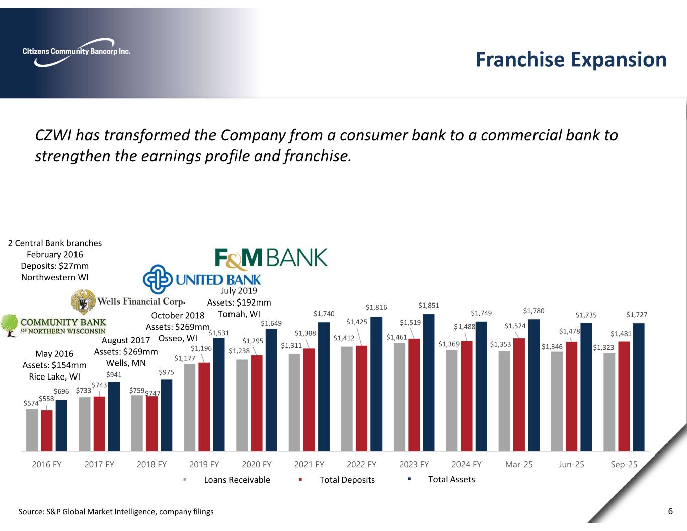 Operating Market Overview CZWI Operates in diverse markets within the northwestern region of Wisconsin, metro Twin Cities and the Mankato, Minnesota MSA Source: S&P Global Market Intelligence 0 0 0 0 0 5