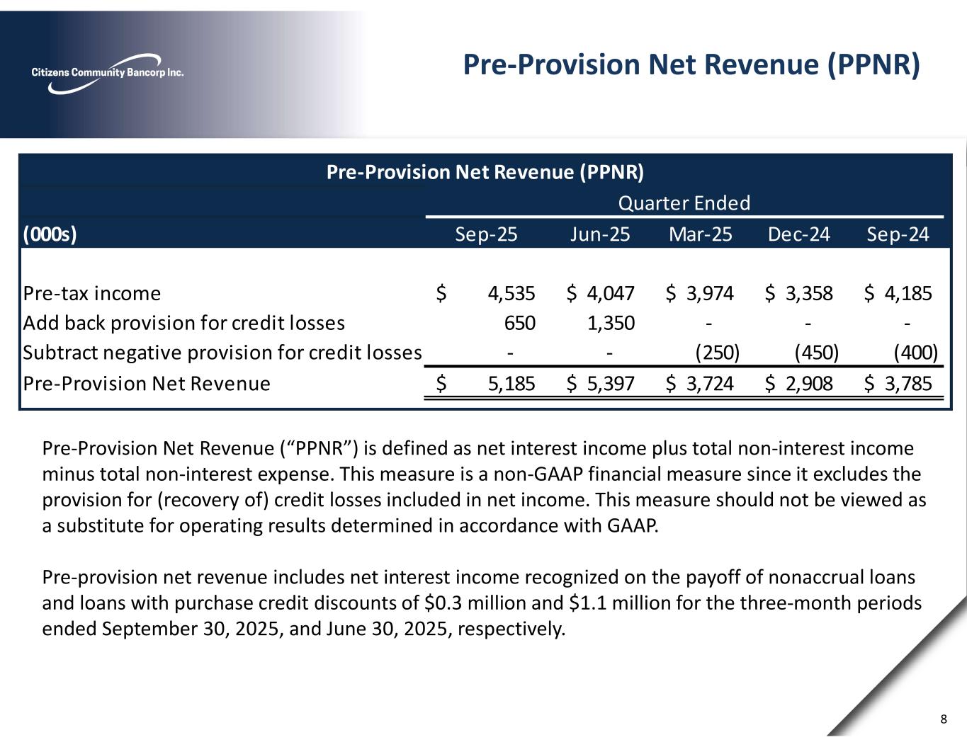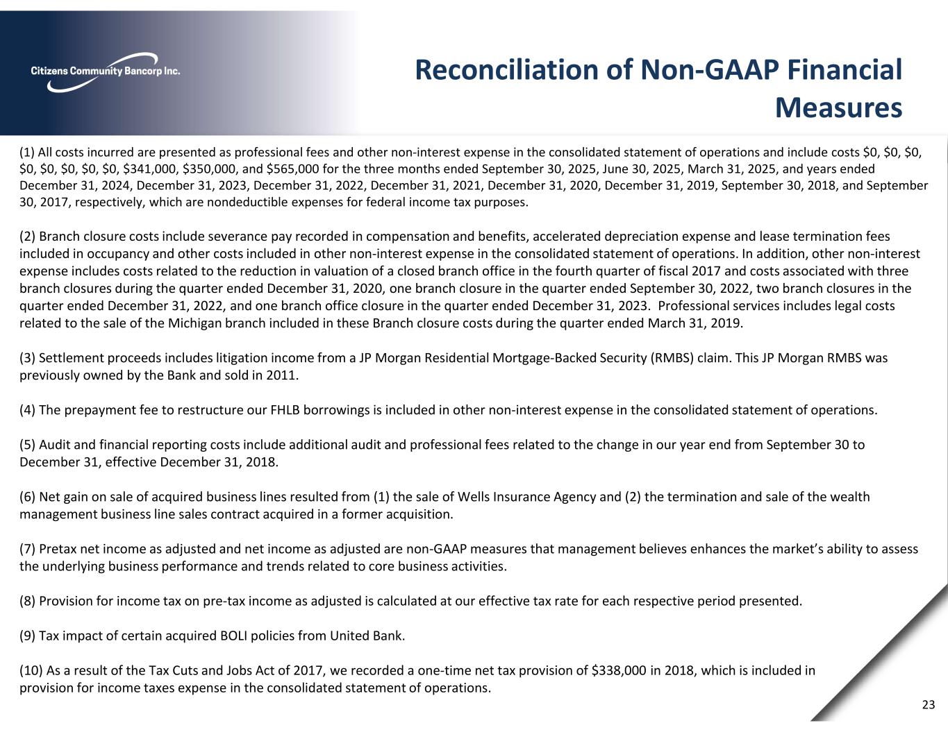 (1) All costs incurred are presented as professional fees and other non-interest expense in the consolidated statement of operations and include costs $0, $0, $0, $0, $0, $0, $0, $0, $341,000, $350,000, and $565,000 for the three months ended September 30, 2025, June 30, 2025, March 31, 2025, and years ended December 31, 2024, December 31, 2023, December 31, 2022, December 31, 2021, December 31, 2020, December 31, 2019, September 30, 2018, and September 30, 2017, respectively, which are nondeductible expenses for federal income tax purposes. (2) Branch closure costs include severance pay recorded in compensation and benefits, accelerated depreciation expense and lease termination fees included in occupancy and other costs included in other non-interest expense in the consolidated statement of operations. In addition, other non-interest expense includes costs related to the reduction in valuation of a closed branch office in the fourth quarter of fiscal 2017 and costs associated with three branch closures during the quarter ended December 31, 2020, one branch closure in the quarter ended September 30, 2022, two branch closures in the quarter ended December 31, 2022, and one branch office closure in the quarter ended December 31, 2023. Professional services includes legal costs related to the sale of the Michigan branch included in these Branch closure costs during the quarter ended March 31, 2019. (3) Settlement proceeds includes litigation income from a JP Morgan Residential Mortgage-Backed Security (RMBS) claim. This JP Morgan RMBS was previously owned by the Bank and sold in 2011. (4) The prepayment fee to restructure our FHLB borrowings is included in other non-interest expense in the consolidated statement of operations. (5) Audit and financial reporting costs include additional audit and professional fees related to the change in our year end from September 30 to December 31, effective December 31, 2018. (6) Net gain on sale of acquired business lines resulted from (1) the sale of Wells Insurance Agency and (2) the termination and sale of the wealth management business line sales contract acquired in a former acquisition. (7) Pretax net income as adjusted and net income as adjusted are non-GAAP measures that management believes enhances the market’s ability to assess the underlying business performance and trends related to core business activities. (8) Provision for income tax on pre-tax income as adjusted is calculated at our effective tax rate for each respective period presented. (9) Tax impact of certain acquired BOLI policies from United Bank. (10) As a result of the Tax Cuts and Jobs Act of 2017, we recorded a one-time net tax provision of $338,000 in 2018, which is included in provision for income taxes expense in the consolidated statement of operations. 23 Reconciliation of Non-GAAP Financial Measures