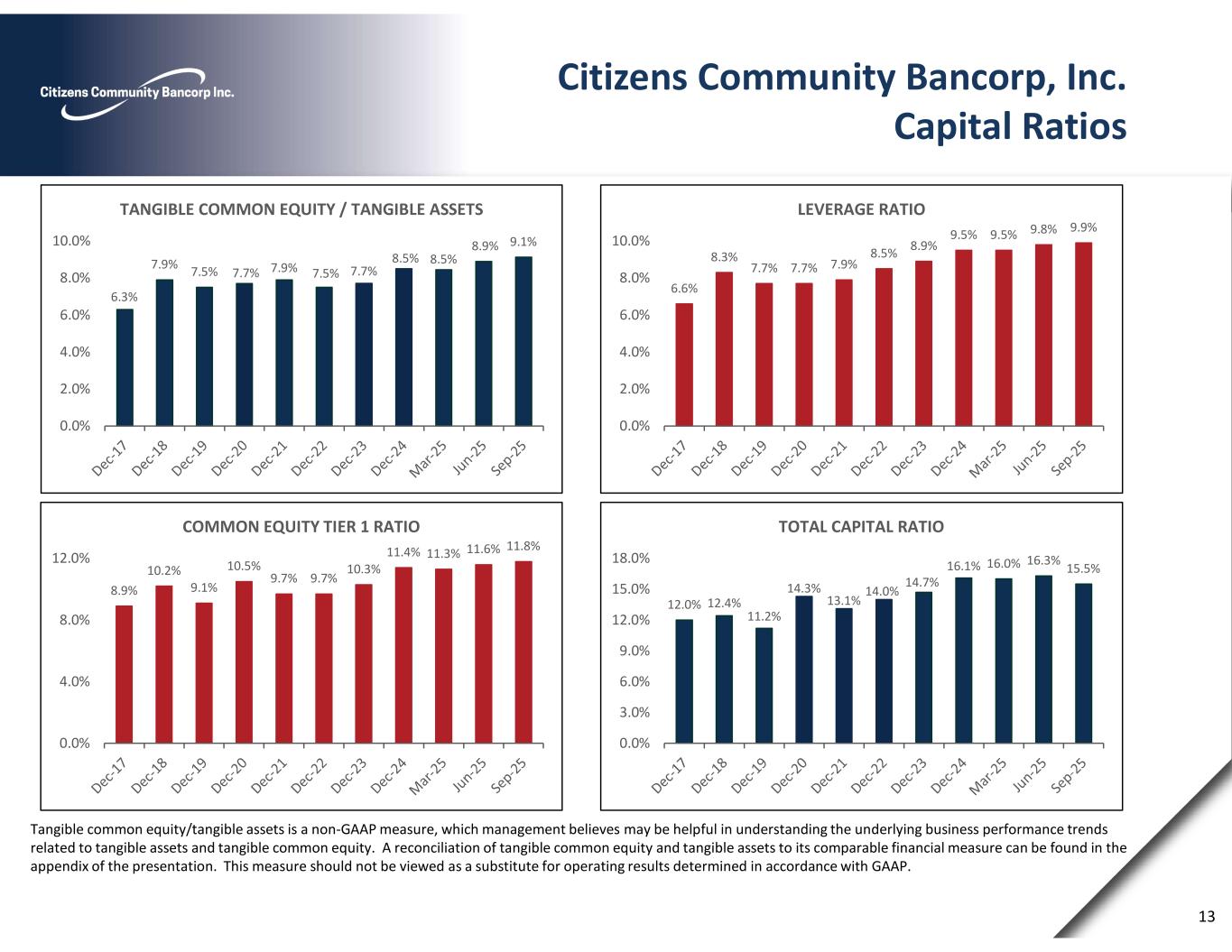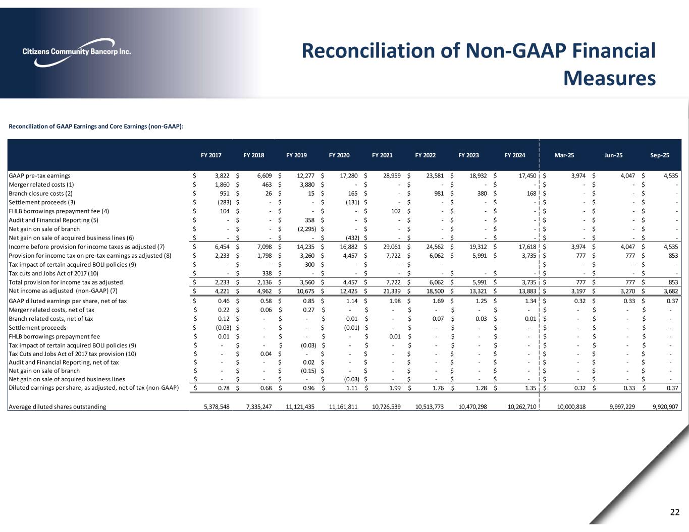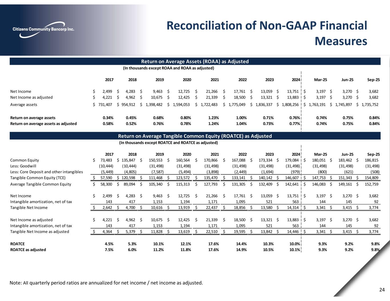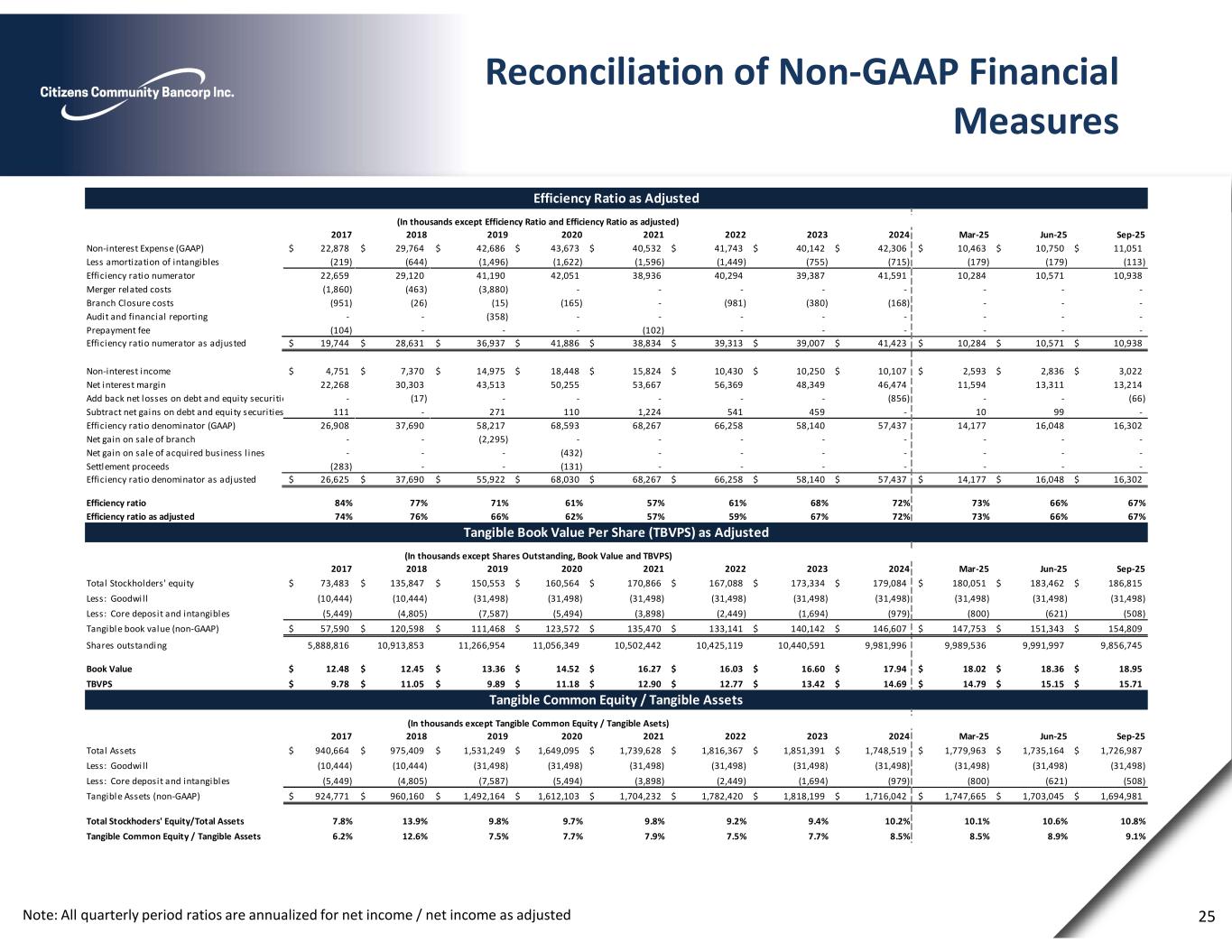 Reconciliation of Non-GAAP Financial Measures Note: All quarterly period ratios are annualized for net income / net income as adjusted 25 2017 2018 2019 2020 2021 2022 2023 2024 Mar-25 Jun-25 Sep-25 Non-interest Expense (GAAP) 22,878$ 29,764$ 42,686$ 43,673$ 40,532$ 41,743$ 40,142$ 42,306$ 10,463$ 10,750$ 11,051$ Less amortization of intangibles (219) (644) (1,496) (1,622) (1,596) (1,449) (755) (715) (179) (179) (113) Efficiency ratio numerator 22,659 29,120 41,190 42,051 38,936 40,294 39,387 41,591 10,284 10,571 10,938 Merger related costs (1,860) (463) (3,880) - - - - - - - - Branch Closure costs (951) (26) (15) (165) - (981) (380) (168) - - - Audit and financial reporting - - (358) - - - - - - - - Prepayment fee (104) - - - (102) - - - - - - Efficiency ratio numerator as adjusted 19,744$ 28,631$ 36,937$ 41,886$ 38,834$ 39,313$ 39,007$ 41,423$ 10,284$ 10,571$ 10,938$ Non-interest income 4,751$ 7,370$ 14,975$ 18,448$ 15,824$ 10,430$ 10,250$ 10,107$ 2,593$ 2,836$ 3,022$ Net interest margin 22,268 30,303 43,513 50,255 53,667 56,369 48,349 46,474 11,594 13,311 13,214 Add back net losses on debt and equity securities - (17) - - - - - (856) - - (66) Subtract net gains on debt and equity securities 111 - 271 110 1,224 541 459 - 10 99 - Efficiency ratio denominator (GAAP) 26,908 37,690 58,217 68,593 68,267 66,258 58,140 57,437 14,177 16,048 16,302 Net gain on sale of branch - - (2,295) - - - - - - - - Net gain on sale of acquired business l ines - - - (432) - - - - - - - Settlement proceeds (283) - - (131) - - - - - - - Efficiency ratio denominator as adjusted 26,625$ 37,690$ 55,922$ 68,030$ 68,267$ 66,258$ 58,140$ 57,437$ 14,177$ 16,048$ 16,302$ Efficiency ratio 84% 77% 71% 61% 57% 61% 68% 72% 73% 66% 67% Efficiency ratio as adjusted 74% 76% 66% 62% 57% 59% 67% 72% 73% 66% 67% 2017 2018 2019 2020 2021 2022 2023 2024 Mar-25 Jun-25 Sep-25 Total Stockholders' equity 73,483$ 135,847$ 150,553$ 160,564$ 170,866$ 167,088$ 173,334$ 179,084$ 180,051$ 183,462$ 186,815$ Less: Goodwi ll (10,444) (10,444) (31,498) (31,498) (31,498) (31,498) (31,498) (31,498) (31,498) (31,498) (31,498) Less: Core deposit and intangibles (5,449) (4,805) (7,587) (5,494) (3,898) (2,449) (1,694) (979) (800) (621) (508) Tangible book value (non-GAAP) 57,590$ 120,598$ 111,468$ 123,572$ 135,470$ 133,141$ 140,142$ 146,607$ 147,753$ 151,343$ 154,809$ Shares outstanding 5,888,816 10,913,853 11,266,954 11,056,349 10,502,442 10,425,119 10,440,591 9,981,996 9,989,536 9,991,997 9,856,745 Book Value 12.48$ 12.45$ 13.36$ 14.52$ 16.27$ 16.03$ 16.60$ 17.94$ 18.02$ 18.36$ 18.95$ TBVPS 9.78$ 11.05$ 9.89$ 11.18$ 12.90$ 12.77$ 13.42$ 14.69$ 14.79$ 15.15$ 15.71$ 2017 2018 2019 2020 2021 2022 2023 2024 Mar-25 Jun-25 Sep-25 Total Assets 940,664$ 975,409$ 1,531,249$ 1,649,095$ 1,739,628$ 1,816,367$ 1,851,391$ 1,748,519$ 1,779,963$ 1,735,164$ 1,726,987$ Less: Goodwi ll (10,444) (10,444) (31,498) (31,498) (31,498) (31,498) (31,498) (31,498) (31,498) (31,498) (31,498) Less: Core deposit and intangibles (5,449) (4,805) (7,587) (5,494) (3,898) (2,449) (1,694) (979) (800) (621) (508) Tangible Assets (non-GAAP) 924,771$ 960,160$ 1,492,164$ 1,612,103$ 1,704,232$ 1,782,420$ 1,818,199$ 1,716,042$ 1,747,665$ 1,703,045$ 1,694,981$ Total Stockhoders' Equity/Total Assets 7.8% 13.9% 9.8% 9.7% 9.8% 9.2% 9.4% 10.2% 10.1% 10.6% 10.8% Tangible Common Equity / Tangible Assets 6.2% 12.6% 7.5% 7.7% 7.9% 7.5% 7.7% 8.5% 8.5% 8.9% 9.1% (In thousands except Tangible Common Equity / Tangible Asets) (In thousands except Shares Outstanding, Book Value and TBVPS) (In thousands except Efficiency Ratio and Efficiency Ratio as adjusted) Efficiency Ratio as Adjusted Tangible Book Value Per Share (TBVPS) as Adjusted Tangible Common Equity / Tangible Assets