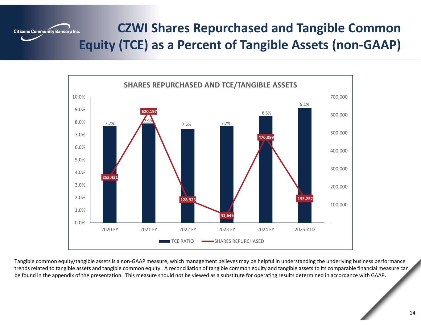 Citizens Community Bancorp, Inc. Capital Ratios 13 6.6% 8.3% 7.7% 7.7% 7.9% 8.5% 8.9% 9.5% 9.5% 9.8% 9.9% 0.0% 2.0% 4.0% 6.0% 8.0% 10.0% LEVERAGE RATIO 8.9% 10.2% 9.1% 10.5% 9.7% 9.7% 10.3% 11.4% 11.3% 11.6% 11.8% 0.0% 4.0% 8.0% 12.0% COMMON EQUITY TIER 1 RATIO 12.0% 12.4% 11.2% 14.3% 13.1% 14.0% 14.7% 16.1% 16.0% 16.3% 15.5% 0.0% 3.0% 6.0% 9.0% 12.0% 15.0% 18.0% TOTAL CAPITAL RATIO Tangible common equity/tangible assets is a non-GAAP measure, which management believes may be helpful in understanding the underlying business performance trends related to tangible assets and tangible common equity. A reconciliation of tangible common equity and tangible assets to its comparable financial measure can be found in the appendix of the presentation. This measure should not be viewed as a substitute for operating results determined in accordance with GAAP. 6.3% 7.9% 7.5% 7.7% 7.9% 7.5% 7.7% 8.5% 8.5% 8.9% 9.1% 0.0% 2.0% 4.0% 6.0% 8.0% 10.0% TANGIBLE COMMON EQUITY / TANGIBLE ASSETS