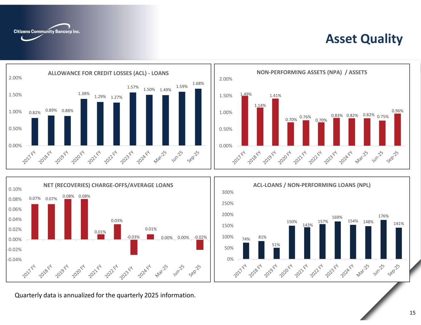 CZWI Shares Repurchased and Tangible Common Equity (TCE) as a Percent of Tangible Assets (non-GAAP) Tangible common equity/tangible assets is a non-GAAP measure, which management believes may be helpful in understanding the underlying business performance trends related to tangible assets and tangible common equity. A reconciliation of tangible common equity and tangible assets to its comparable financial measure can be found in the appendix of the presentation. This measure should not be viewed as a substitute for operating results determined in accordance with GAAP. 14 7.7% 7.9% 7.5% 7.7% 8.5% 9.1% 253,431 620,197 128,923 41,646 476,099 135,252 - 100,000 200,000 300,000 400,000 500,000 600,000 700,000 0.0% 1.0% 2.0% 3.0% 4.0% 5.0% 6.0% 7.0% 8.0% 9.0% 10.0% 2020 FY 2021 FY 2022 FY 2023 FY 2024 FY 2025 YTD SHARES REPURCHASED AND TCE/TANGIBLE ASSETS TCE RATIO SHARES REPURCHASED