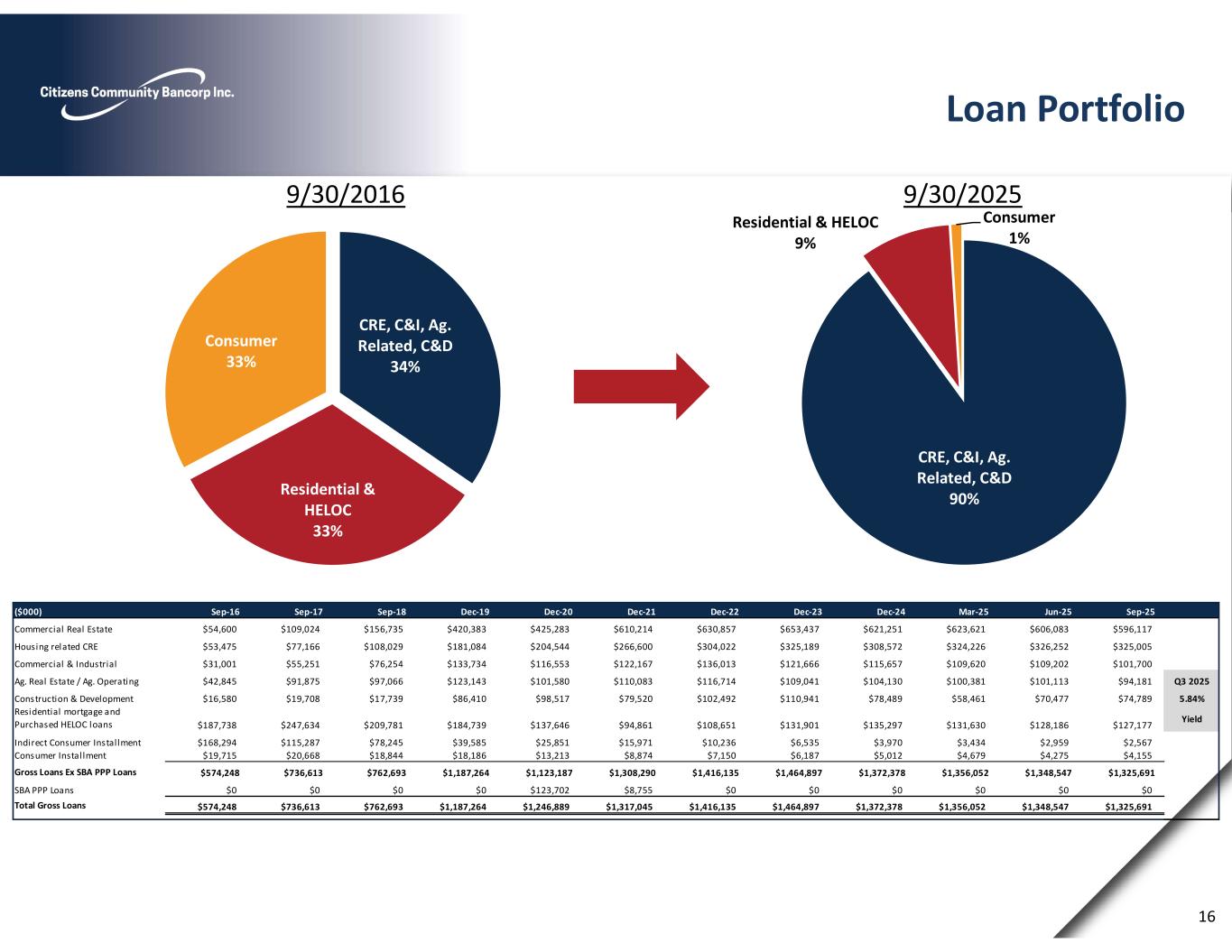 Asset Quality 0.82% 0.89% 0.88% 1.38% 1.29% 1.27% 1.57% 1.50% 1.49% 1.59% 1.68% 0.00% 0.50% 1.00% 1.50% 2.00% ALLOWANCE FOR CREDIT LOSSES (ACL) - LOANS 1.49% 1.14% 1.41% 0.70% 0.76% 0.70% 0.83% 0.82% 0.82% 0.75% 0.96% 0.00% 0.50% 1.00% 1.50% 2.00% NON-PERFORMING ASSETS (NPA) / ASSETS 15 74% 81% 51% 150% 143% 157% 169% 154% 148% 176% 141% 0% 50% 100% 150% 200% 250% 300% ACL-LOANS / NON-PERFORMING LOANS (NPL) 0.07% 0.07% 0.08% 0.08% 0.01% 0.03% -0.03% 0.01% 0.00% 0.00% -0.02% -0.04% -0.02% 0.00% 0.02% 0.04% 0.06% 0.08% 0.10% NET (RECOVERIES) CHARGE-OFFS/AVERAGE LOANS Quarterly data is annualized for the quarterly 2025 information.