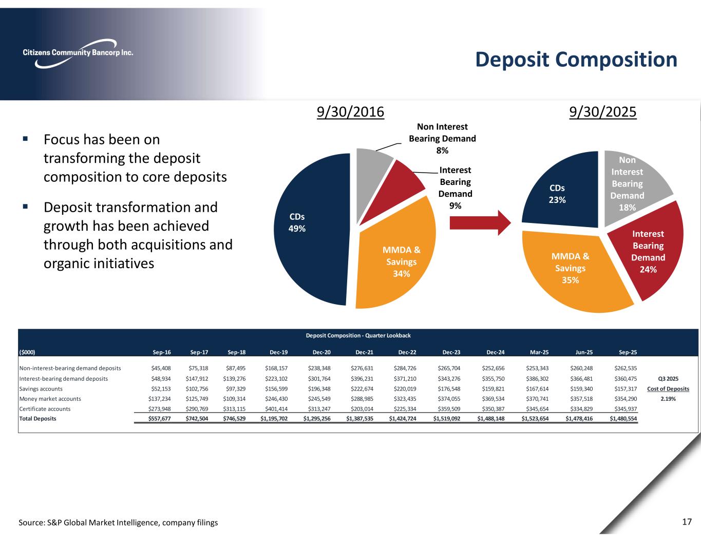 CRE, C&I, Ag. Related, C&D 90% Residential & HELOC 9% Consumer 1% Loan Portfolio 9/30/2016 9/30/2025 CRE, C&I, Ag. Related, C&D 34% Residential & HELOC 33% Consumer 33% 16 ($000) Sep-16 Sep-17 Sep-18 Dec-19 Dec-20 Dec-21 Dec-22 Dec-23 Dec-24 Mar-25 Jun-25 Sep-25 Commercial Real Estate $54,600 $109,024 $156,735 $420,383 $425,283 $610,214 $630,857 $653,437 $621,251 $623,621 $606,083 $596,117 Housing related CRE $53,475 $77,166 $108,029 $181,084 $204,544 $266,600 $304,022 $325,189 $308,572 $324,226 $326,252 $325,005 Commercial & Industrial $31,001 $55,251 $76,254 $133,734 $116,553 $122,167 $136,013 $121,666 $115,657 $109,620 $109,202 $101,700 Ag. Real Estate / Ag. Operating $42,845 $91,875 $97,066 $123,143 $101,580 $110,083 $116,714 $109,041 $104,130 $100,381 $101,113 $94,181 Q3 2025 Construction & Development $16,580 $19,708 $17,739 $86,410 $98,517 $79,520 $102,492 $110,941 $78,489 $58,461 $70,477 $74,789 5.84% Residential mortgage and Purchased HELOC loans $187,738 $247,634 $209,781 $184,739 $137,646 $94,861 $108,651 $131,901 $135,297 $131,630 $128,186 $127,177 Yield Indirect Consumer Installment $168,294 $115,287 $78,245 $39,585 $25,851 $15,971 $10,236 $6,535 $3,970 $3,434 $2,959 $2,567 Consumer Installment $19,715 $20,668 $18,844 $18,186 $13,213 $8,874 $7,150 $6,187 $5,012 $4,679 $4,275 $4,155 Gross Loans Ex SBA PPP Loans $574,248 $736,613 $762,693 $1,187,264 $1,123,187 $1,308,290 $1,416,135 $1,464,897 $1,372,378 $1,356,052 $1,348,547 $1,325,691 SBA PPP Loans $0 $0 $0 $0 $123,702 $8,755 $0 $0 $0 $0 $0 $0 Total Gross Loans $574,248 $736,613 $762,693 $1,187,264 $1,246,889 $1,317,045 $1,416,135 $1,464,897 $1,372,378 $1,356,052 $1,348,547 $1,325,691