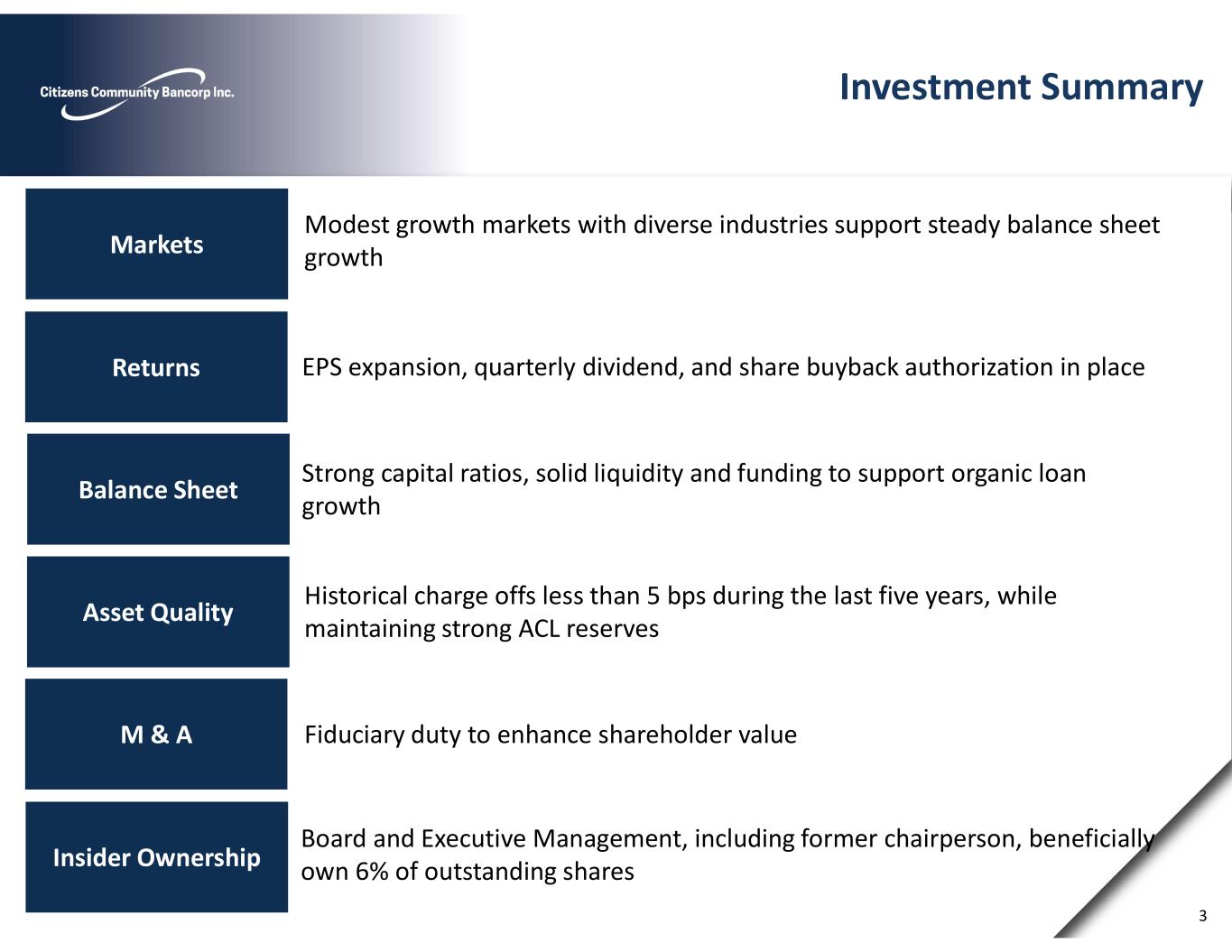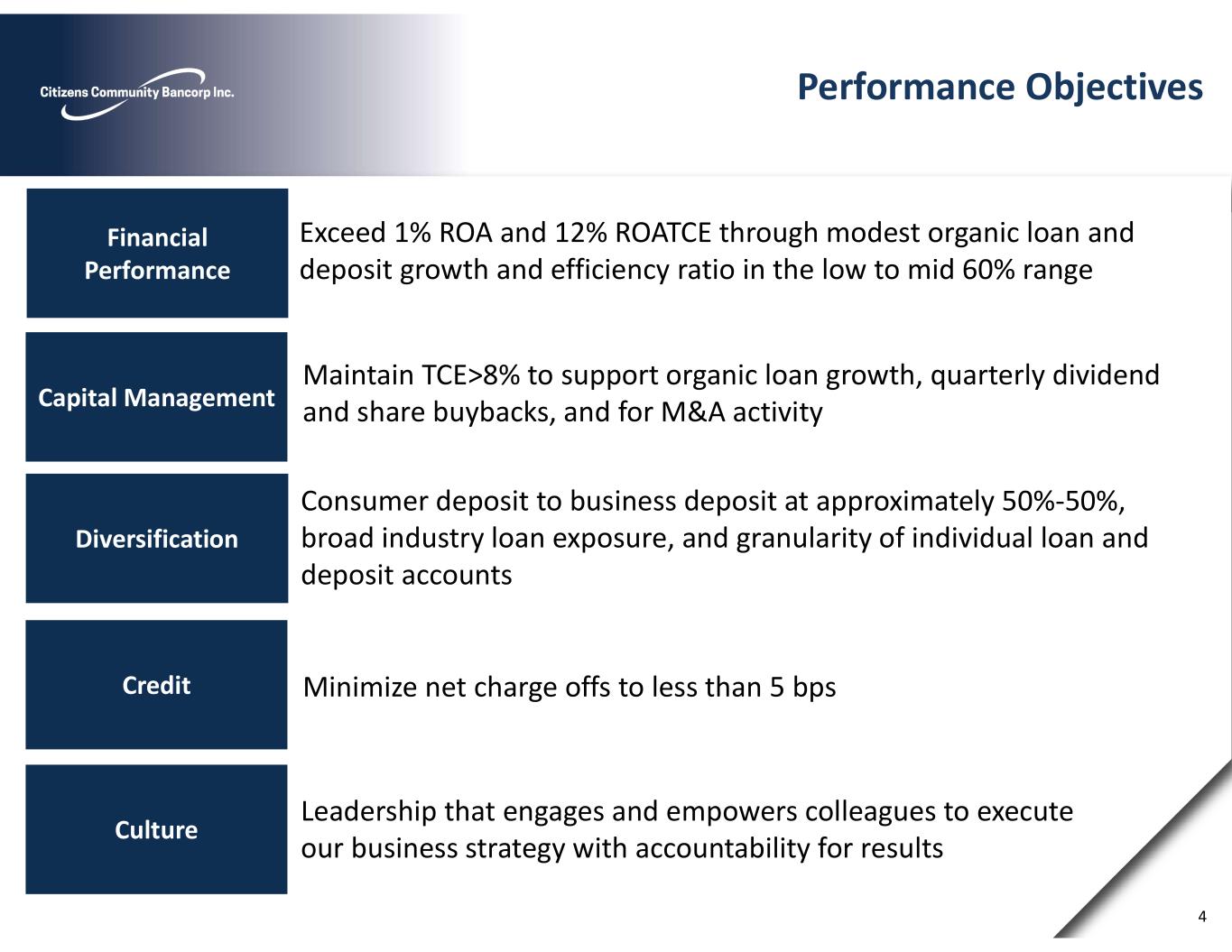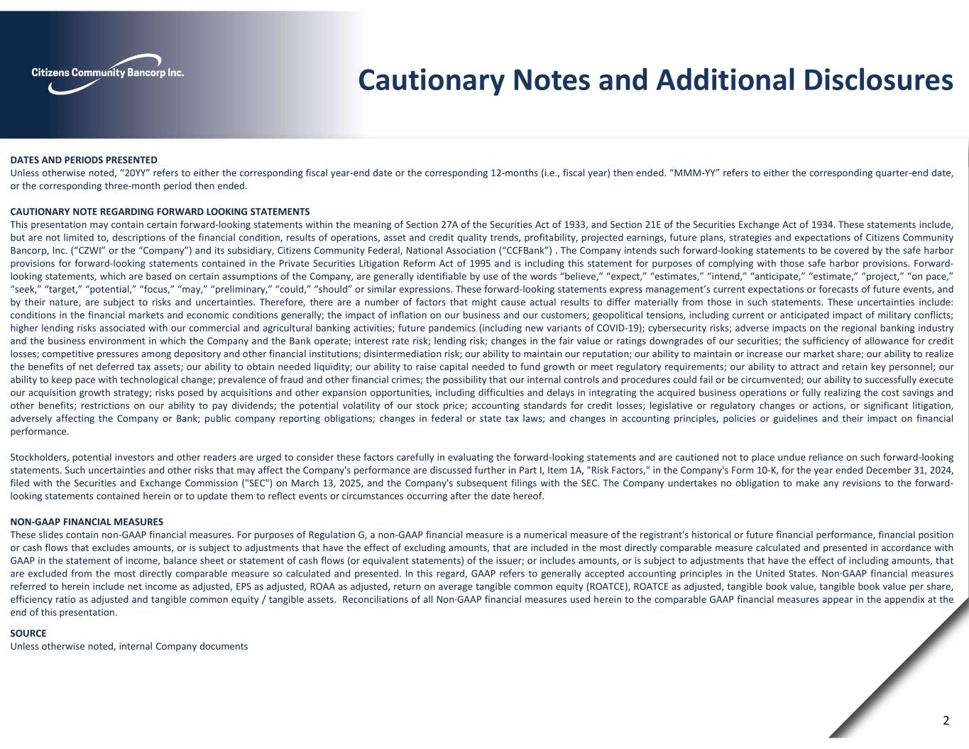 Cautionary Notes and Additional Disclosures 2 DATES AND PERIODS PRESENTED Unless otherwise noted, “20YY” refers to either the corresponding fiscal year-end date or the corresponding 12-months (i.e., fiscal year) then ended. “MMM-YY” refers to either the corresponding quarter-end date, or the corresponding three-month period then ended. CAUTIONARY NOTE REGARDING FORWARD LOOKING STATEMENTS This presentation may contain certain forward-looking statements within the meaning of Section 27A of the Securities Act of 1933, and Section 21E of the Securities Exchange Act of 1934. These statements include, but are not limited to, descriptions of the financial condition, results of operations, asset and credit quality trends, profitability, projected earnings, future plans, strategies and expectations of Citizens Community Bancorp, Inc. (“CZWI” or the “Company”) and its subsidiary, Citizens Community Federal, National Association (“CCFBank”) . The Company intends such forward-looking statements to be covered by the safe harbor provisions for forward-looking statements contained in the Private Securities Litigation Reform Act of 1995 and is including this statement for purposes of complying with those safe harbor provisions. Forward- looking statements, which are based on certain assumptions of the Company, are generally identifiable by use of the words “believe,” “expect,” “estimates,” “intend,” “anticipate,” “estimate,” “project,” “on pace,” “seek,” “target,” “potential,” “focus,” “may,” “preliminary,” “could,” “should” or similar expressions. These forward-looking statements express management’s current expectations or forecasts of future events, and by their nature, are subject to risks and uncertainties. Therefore, there are a number of factors that might cause actual results to differ materially from those in such statements. These uncertainties include: conditions in the financial markets and economic conditions generally; the impact of inflation on our business and our customers; geopolitical tensions, including current or anticipated impact of military conflicts; higher lending risks associated with our commercial and agricultural banking activities; future pandemics (including new variants of COVID-19); cybersecurity risks; adverse impacts on the regional banking industry and the business environment in which the Company and the Bank operate; interest rate risk; lending risk; changes in the fair value or ratings downgrades of our securities; the sufficiency of allowance for credit losses; competitive pressures among depository and other financial institutions; disintermediation risk; our ability to maintain our reputation; our ability to maintain or increase our market share; our ability to realize the benefits of net deferred tax assets; our ability to obtain needed liquidity; our ability to raise capital needed to fund growth or meet regulatory requirements; our ability to attract and retain key personnel; our ability to keep pace with technological change; prevalence of fraud and other financial crimes; the possibility that our internal controls and procedures could fail or be circumvented; our ability to successfully execute our acquisition growth strategy; risks posed by acquisitions and other expansion opportunities, including difficulties and delays in integrating the acquired business operations or fully realizing the cost savings and other benefits; restrictions on our ability to pay dividends; the potential volatility of our stock price; accounting standards for credit losses; legislative or regulatory changes or actions, or significant litigation, adversely affecting the Company or Bank; public company reporting obligations; changes in federal or state tax laws; and changes in accounting principles, policies or guidelines and their impact on financial performance. Stockholders, potential investors and other readers are urged to consider these factors carefully in evaluating the forward-looking statements and are cautioned not to place undue reliance on such forward-looking statements. Such uncertainties and other risks that may affect the Company's performance are discussed further in Part I, Item 1A, "Risk Factors," in the Company's Form 10-K, for the year ended December 31, 2024, filed with the Securities and Exchange Commission ("SEC") on March 13, 2025, and the Company's subsequent filings with the SEC. The Company undertakes no obligation to make any revisions to the forward- looking statements contained herein or to update them to reflect events or circumstances occurring after the date hereof. NON-GAAP FINANCIAL MEASURES These slides contain non-GAAP financial measures. For purposes of Regulation G, a non-GAAP financial measure is a numerical measure of the registrant's historical or future financial performance, financial position or cash flows that excludes amounts, or is subject to adjustments that have the effect of excluding amounts, that are included in the most directly comparable measure calculated and presented in accordance with GAAP in the statement of income, balance sheet or statement of cash flows (or equivalent statements) of the issuer; or includes amounts, or is subject to adjustments that have the effect of including amounts, that are excluded from the most directly comparable measure so calculated and presented. In this regard, GAAP refers to generally accepted accounting principles in the United States. Non·GAAP financial measures referred to herein include net income as adjusted, EPS as adjusted, ROAA as adjusted, return on average tangible common equity (ROATCE), ROATCE as adjusted, tangible book value, tangible book value per share, efficiency ratio as adjusted and tangible common equity / tangible assets. Reconciliations of all Non·GAAP financial measures used herein to the comparable GAAP financial measures appear in the appendix at the end of this presentation.
