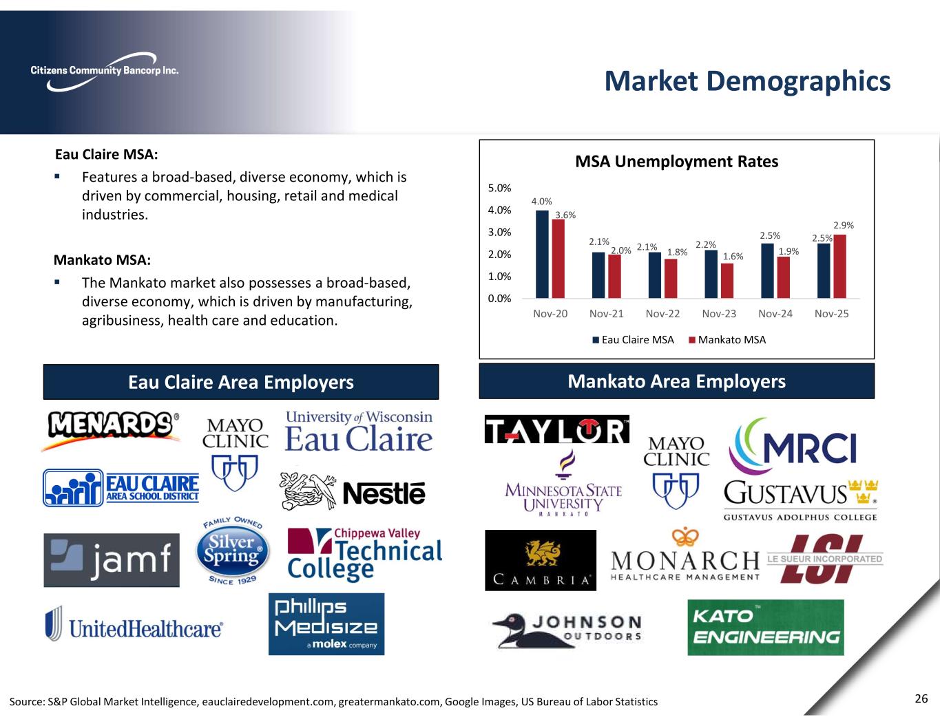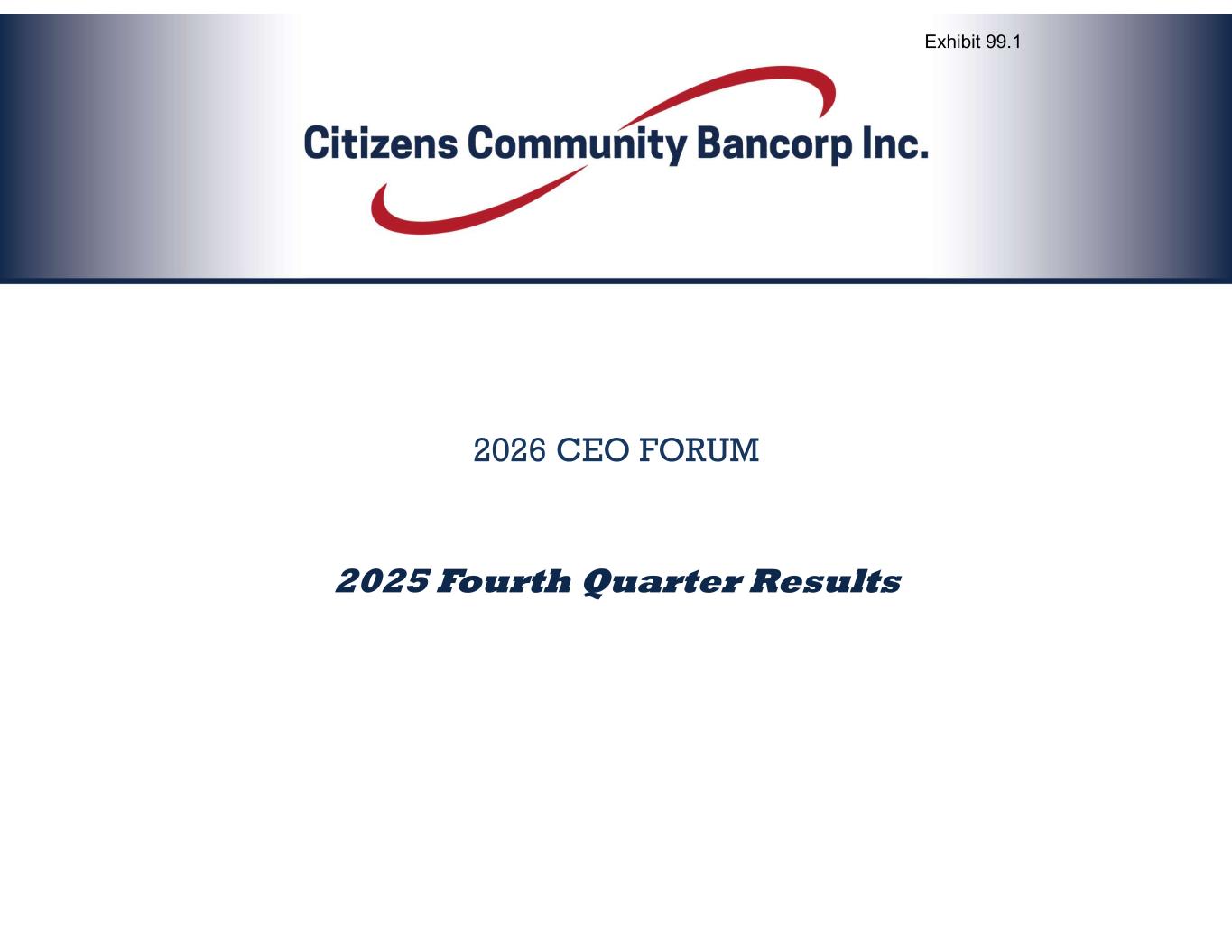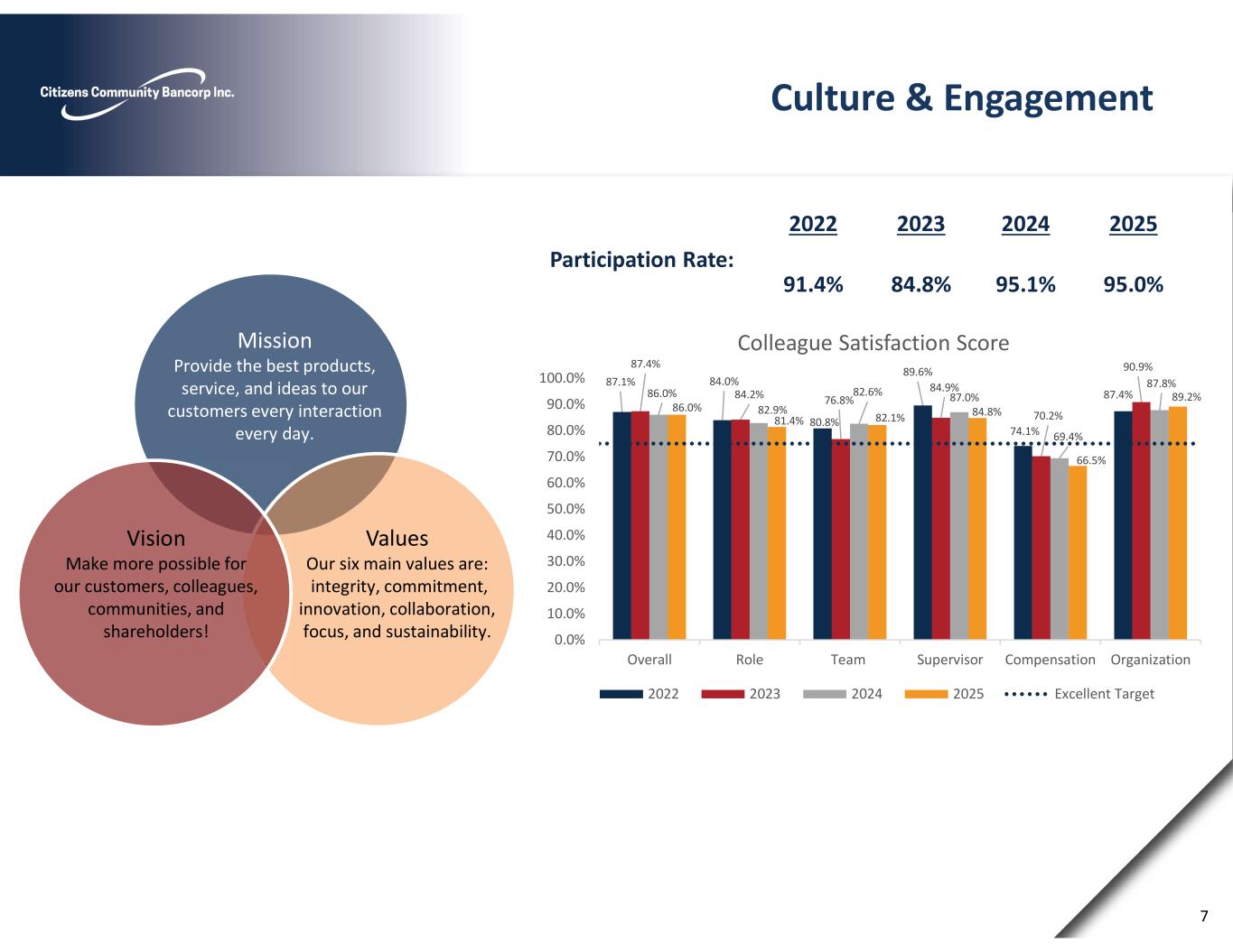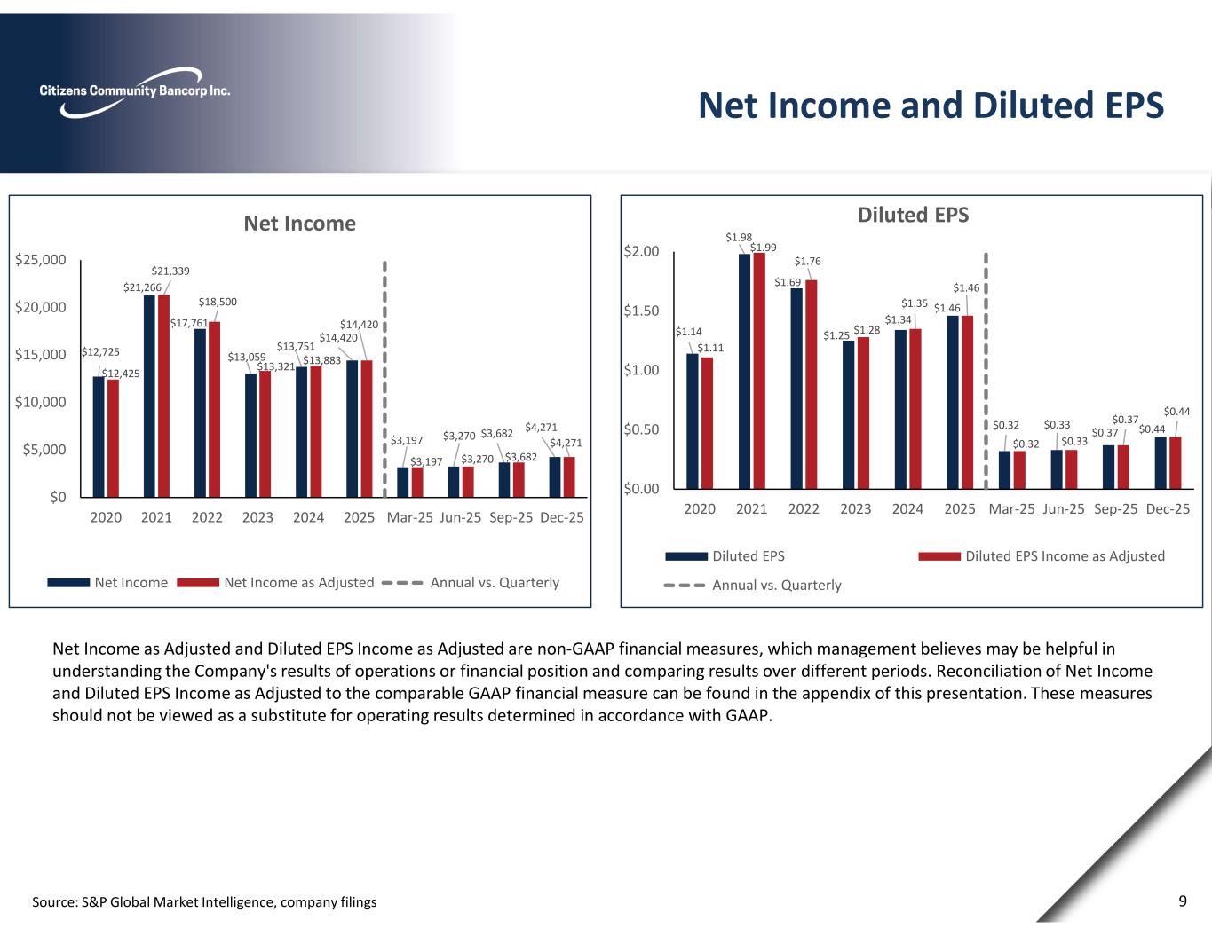 Cautionary Notes and Additional Disclosures 2 DATES AND PERIODS PRESENTED Unless otherwise noted, “20YY” refers to either the corresponding fiscal year-end date or the corresponding 12-months (i.e., fiscal year) then ended. “MMM-YY” refers to either the corresponding quarter-end date, or the corresponding three-month period then ended. CAUTIONARY NOTE REGARDING FORWARD LOOKING STATEMENTS This presentation may contain certain forward-looking statements within the meaning of Section 27A of the Securities Act of 1933, and Section 21E of the Securities Exchange Act of 1934. These statements include, but are not limited to, descriptions of the financial condition, results of operations, asset and credit quality trends, profitability, projected earnings, future plans, strategies and expectations of Citizens Community Bancorp, Inc. (“CZWI” or the “Company”) and its subsidiary, Citizens Community Federal, National Association (“CCFBank”) . The Company intends such forward-looking statements to be covered by the safe harbor provisions for forward-looking statements contained in the Private Securities Litigation Reform Act of 1995 and is including this statement for purposes of complying with those safe harbor provisions. Forward- looking statements, which are based on certain assumptions of the Company, are generally identifiable by use of the words “believe,” “expect,” “estimates,” “intend,” “anticipate,” “estimate,” “project,” “on pace,” “seek,” “target,” “potential,” “focus,” “may,” “preliminary,” “could,” “should” or similar expressions. These forward-looking statements express management’s current expectations or forecasts of future events, and by their nature, are subject to risks and uncertainties. Therefore, there are a number of factors that might cause actual results to differ materially from those in such statements. These uncertainties include: conditions in the financial markets and economic conditions generally; the impact of inflation on our business and our customers; geopolitical tensions, including current or anticipated impact of military conflicts; higher lending risks associated with our commercial and agricultural banking activities; future pandemics (including new variants of COVID-19); cybersecurity risks; adverse impacts on the regional banking industry and the business environment in which the Company and the Bank operate; interest rate risk; lending risk; changes in the fair value or ratings downgrades of our securities; the sufficiency of allowance for credit losses; competitive pressures among depository and other financial institutions; disintermediation risk; our ability to maintain our reputation; our ability to maintain or increase our market share; our ability to realize the benefits of net deferred tax assets; our ability to obtain needed liquidity; our ability to raise capital needed to fund growth or meet regulatory requirements; our ability to attract and retain key personnel; our ability to keep pace with technological change; prevalence of fraud and other financial crimes; the possibility that our internal controls and procedures could fail or be circumvented; our ability to successfully execute our acquisition growth strategy; risks posed by acquisitions and other expansion opportunities, including difficulties and delays in integrating the acquired business operations or fully realizing the cost savings and other benefits; restrictions on our ability to pay dividends; the potential volatility of our stock price; accounting standards for credit losses; legislative or regulatory changes or actions, or significant litigation, adversely affecting the Company or Bank; public company reporting obligations; changes in federal or state tax laws; and changes in accounting principles, policies or guidelines and their impact on financial performance. Stockholders, potential investors and other readers are urged to consider these factors carefully in evaluating the forward-looking statements and are cautioned not to place undue reliance on such forward-looking statements. Such uncertainties and other risks that may affect the Company's performance are discussed further in Part I, Item 1A, "Risk Factors," in the Company's Form 10-K, for the year ended December 31, 2024, filed with the Securities and Exchange Commission ("SEC") on March 13, 2025, and the Company's subsequent filings with the SEC. The Company undertakes no obligation to make any revisions to the forward- looking statements contained herein or to update them to reflect events or circumstances occurring after the date hereof. NON-GAAP FINANCIAL MEASURES These slides contain non-GAAP financial measures. For purposes of Regulation G, a non-GAAP financial measure is a numerical measure of the registrant's historical or future financial performance, financial position or cash flows that excludes amounts, or is subject to adjustments that have the effect of excluding amounts, that are included in the most directly comparable measure calculated and presented in accordance with GAAP in the statement of income, balance sheet or statement of cash flows (or equivalent statements) of the issuer; or includes amounts, or is subject to adjustments that have the effect of including amounts, that are excluded from the most directly comparable measure so calculated and presented. In this regard, GAAP refers to generally accepted accounting principles in the United States. Non·GAAP financial measures referred to herein include net income as adjusted, EPS as adjusted, ROAA as adjusted, return on average tangible common equity (ROATCE), ROATCE as adjusted, tangible book value, tangible book value per share, efficiency ratio as adjusted and tangible common equity / tangible assets. Reconciliations of all Non·GAAP financial measures used herein to the comparable GAAP financial measures appear in the appendix at the end of this presentation.