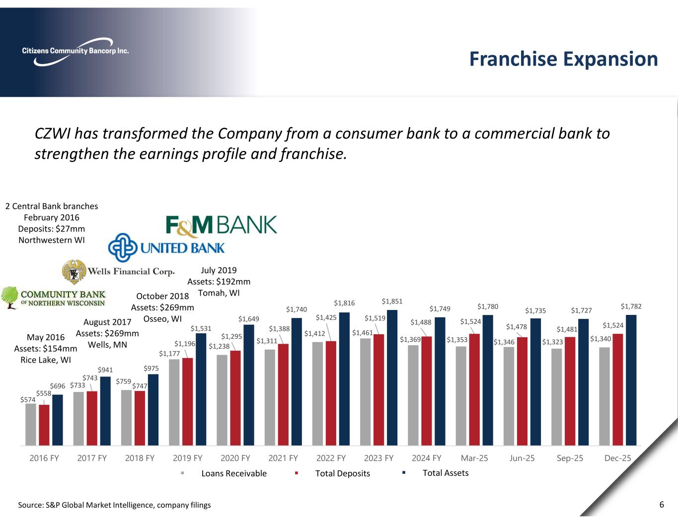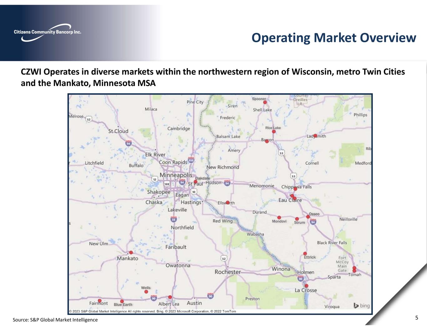 Operating Market Overview CZWI Operates in diverse markets within the northwestern region of Wisconsin, metro Twin Cities and the Mankato, Minnesota MSA Source: S&P Global Market Intelligence 0 0 0 0 0 5