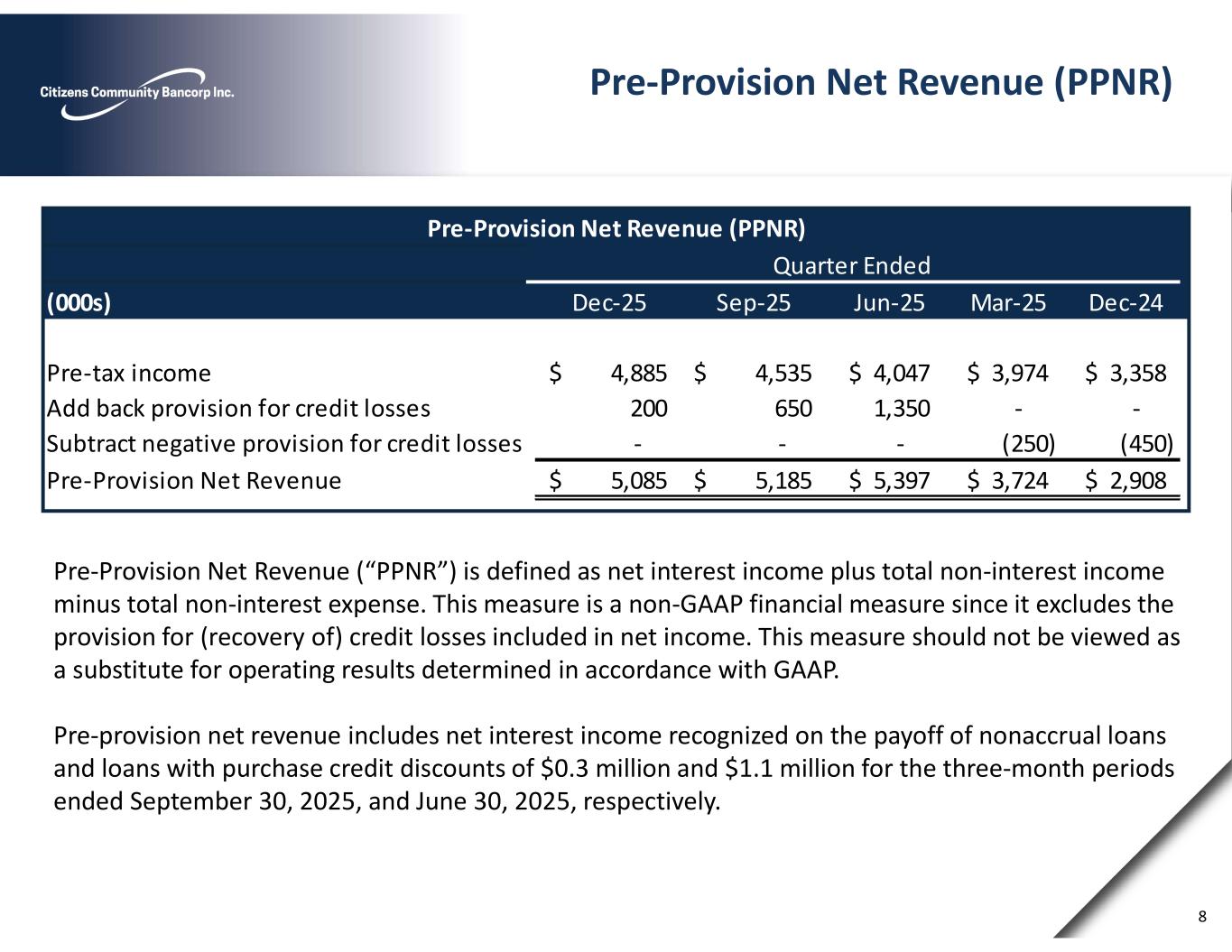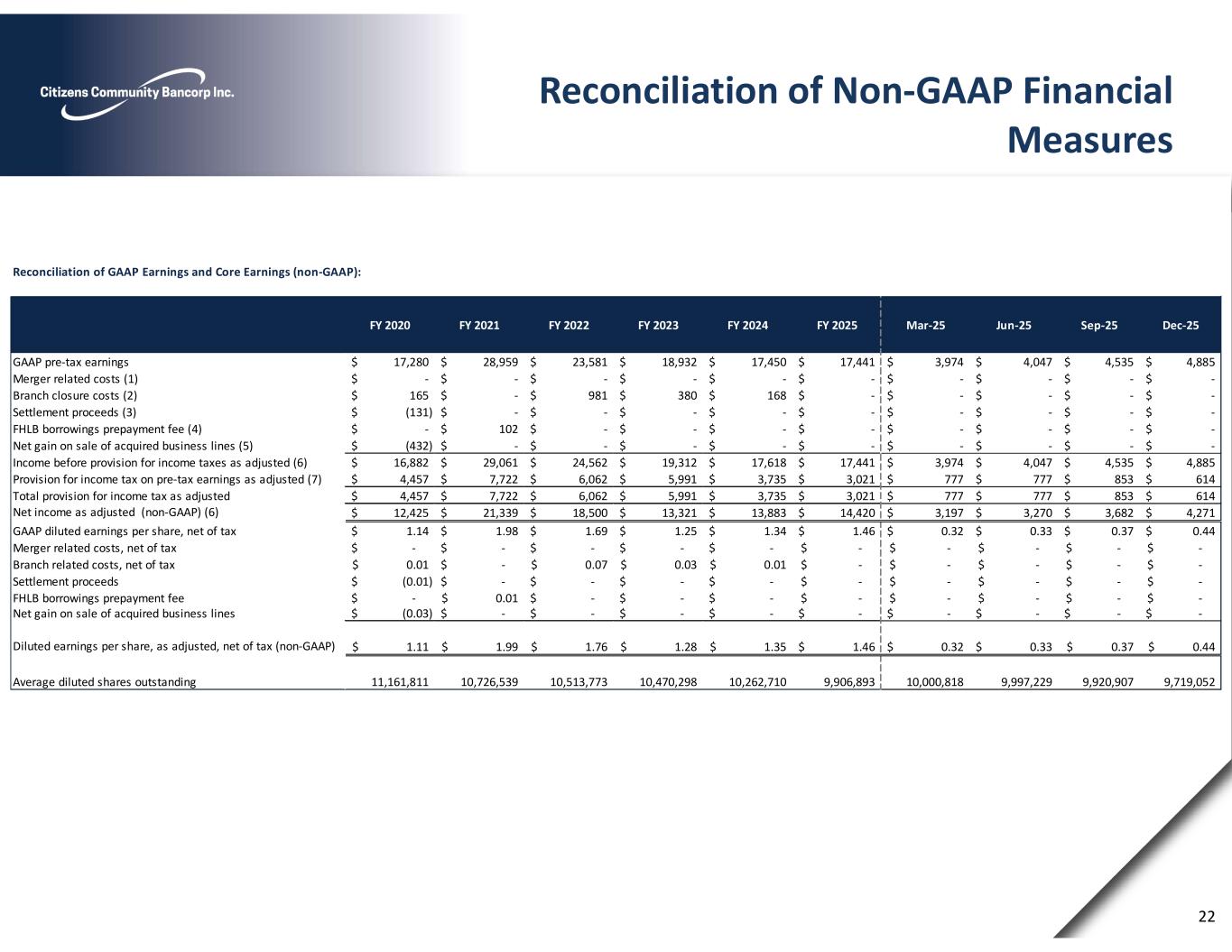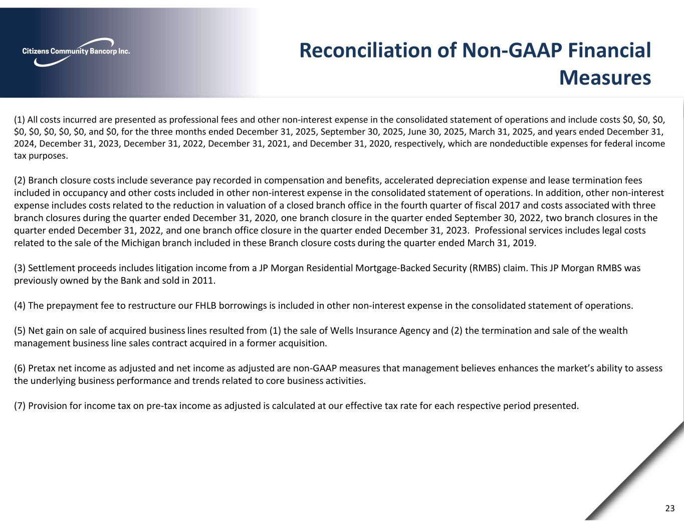 (1) All costs incurred are presented as professional fees and other non-interest expense in the consolidated statement of operations and include costs $0, $0, $0, $0, $0, $0, $0, $0, and $0, for the three months ended December 31, 2025, September 30, 2025, June 30, 2025, March 31, 2025, and years ended December 31, 2024, December 31, 2023, December 31, 2022, December 31, 2021, and December 31, 2020, respectively, which are nondeductible expenses for federal income tax purposes. (2) Branch closure costs include severance pay recorded in compensation and benefits, accelerated depreciation expense and lease termination fees included in occupancy and other costs included in other non-interest expense in the consolidated statement of operations. In addition, other non-interest expense includes costs related to the reduction in valuation of a closed branch office in the fourth quarter of fiscal 2017 and costs associated with three branch closures during the quarter ended December 31, 2020, one branch closure in the quarter ended September 30, 2022, two branch closures in the quarter ended December 31, 2022, and one branch office closure in the quarter ended December 31, 2023. Professional services includes legal costs related to the sale of the Michigan branch included in these Branch closure costs during the quarter ended March 31, 2019. (3) Settlement proceeds includes litigation income from a JP Morgan Residential Mortgage-Backed Security (RMBS) claim. This JP Morgan RMBS was previously owned by the Bank and sold in 2011. (4) The prepayment fee to restructure our FHLB borrowings is included in other non-interest expense in the consolidated statement of operations. (5) Net gain on sale of acquired business lines resulted from (1) the sale of Wells Insurance Agency and (2) the termination and sale of the wealth management business line sales contract acquired in a former acquisition. (6) Pretax net income as adjusted and net income as adjusted are non-GAAP measures that management believes enhances the market’s ability to assess the underlying business performance and trends related to core business activities. (7) Provision for income tax on pre-tax income as adjusted is calculated at our effective tax rate for each respective period presented. 23 Reconciliation of Non-GAAP Financial Measures